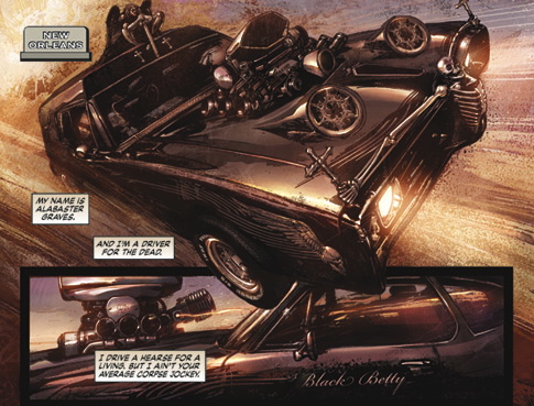 A recurring dream may hint at his true nature (dead people keep reaching out to him in expectation) but his day job keeps the pace moving in this graphic novel by writer John Heffernan, and penciller and inker Leonardo Manco. Paints are applied by Kinsun Loh and Jerry Choo. I'm not a fan of the painted comic format, but here the panels are lively and the scenes are toned well for the grave situations Alabaster always seems to find himself in. Except for an occasional panel where the characters appear "photographically posed," Manco executes the storyline with a wide-screen, cinematic approach that runs the action in 6 or so slabs each page. The most exciting and vivid scenes come when people lose body parts and the bayou's foggy swamp churns up its decomposing and loup garou residents for one hectic night.