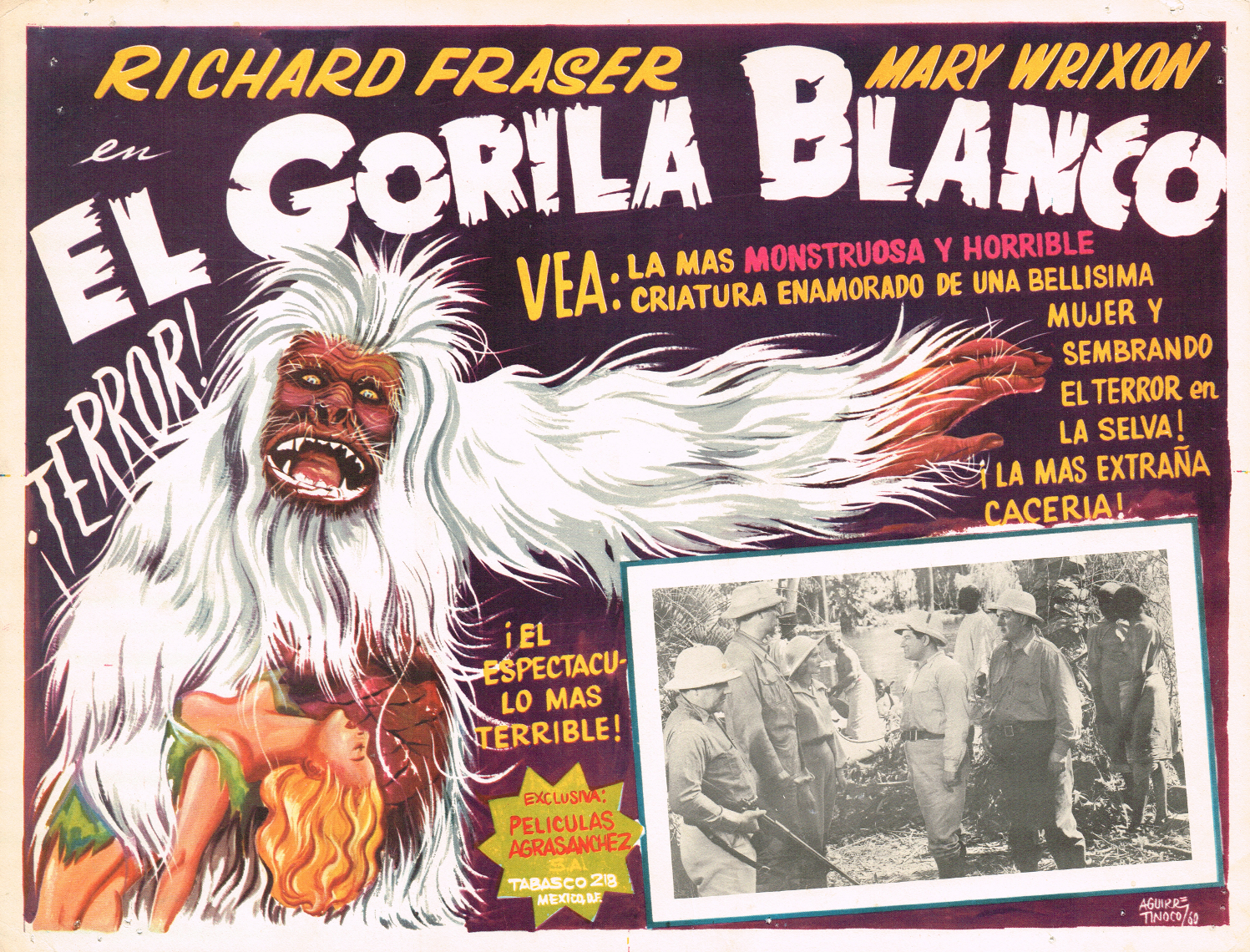 A fantastic Mexican lobby card for White Pongo (1945). Could this be the missing link between man and ape?! Nah. Just a man in a gorilla suit. But I'll keep searching for you. Ray "Crash" Corrigan plays the ape. Naturally. Aguirre Tinoco drew the ape in his distinctive artistic style.