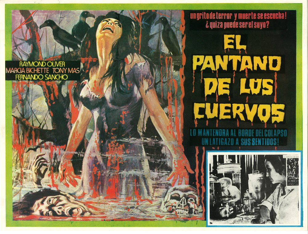 This gory and gruesome illustration for El Pantano De Lus Cuervos reminds me of the gory and gruesome Skywald magazine illustrated stories of the 70s. (You know, those issues of Scream and Nightmare you hid from your mom.) I doubt any movie can live up to the bloody hysteria-hype this lobby card promises.