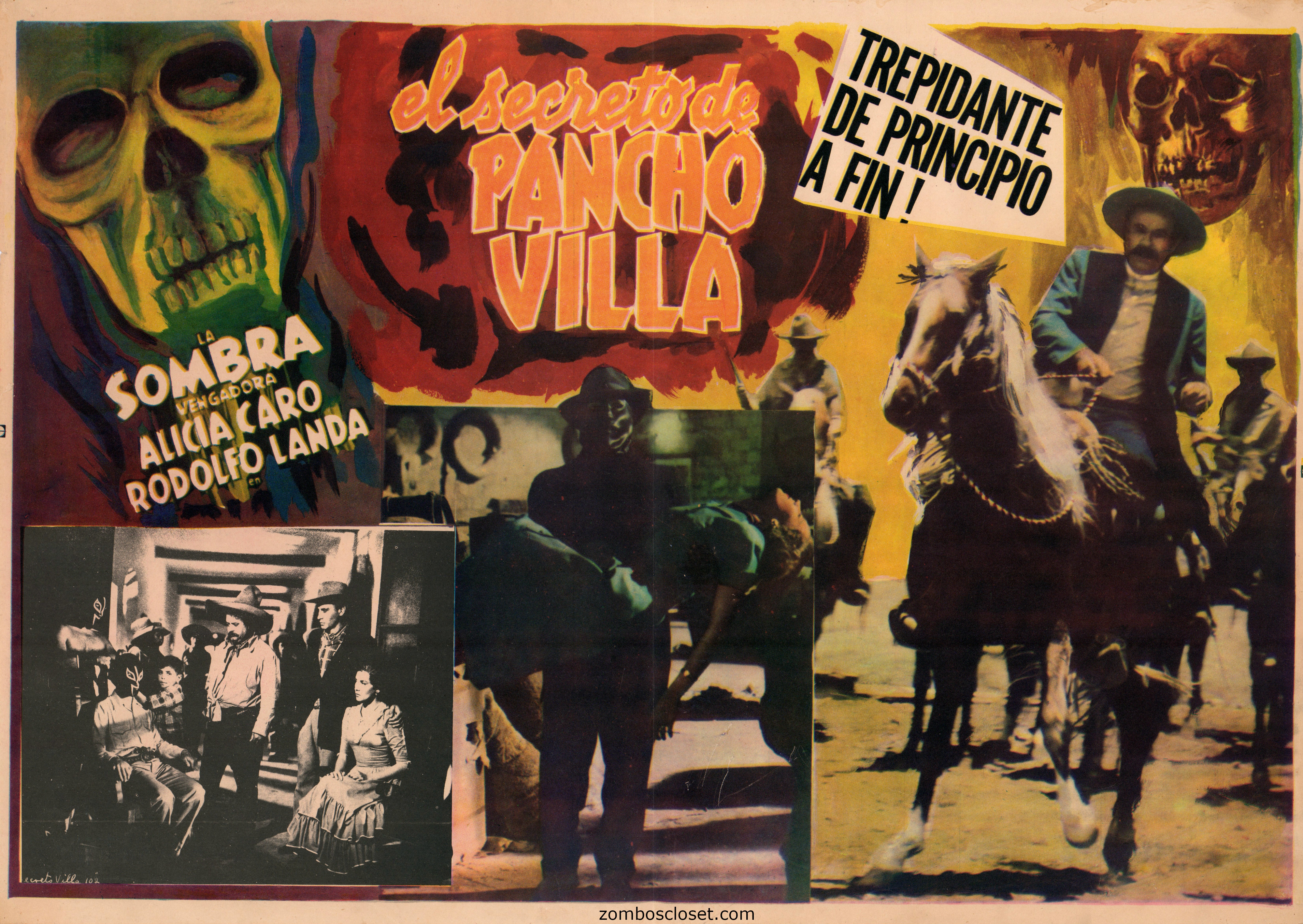 Here's an atmospheric larger Mexican lobby card (more like a small poster) for The Secret of Pancho Villa. The left and right skulls take the background as the dark-clothed mysterious masked figure, carrying the unconscious woman, takes the foreground. He is the hero, the Avenging Shadow. The layout is rough, but it has that cut and paste of highlights rush job aspect that is rather engaging because it is easy to take in.
