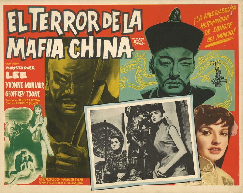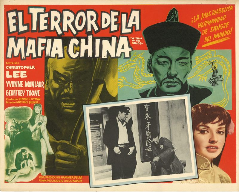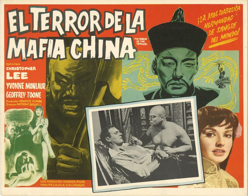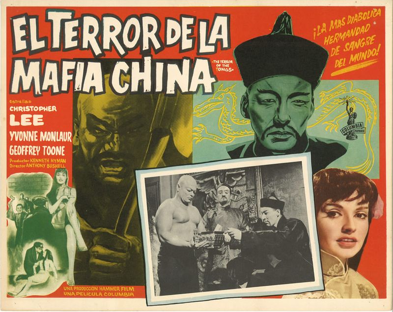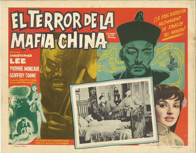 The Terror of the Tongs (El Terror De La Mafia China) lobby cards from Professor Kinema. That big bald guy looks mean, doesn't he? Note the use of different photographs within the repeating graphics to provide variety. Click each lobby card to view the Yellow Peril in all its lurid detail.