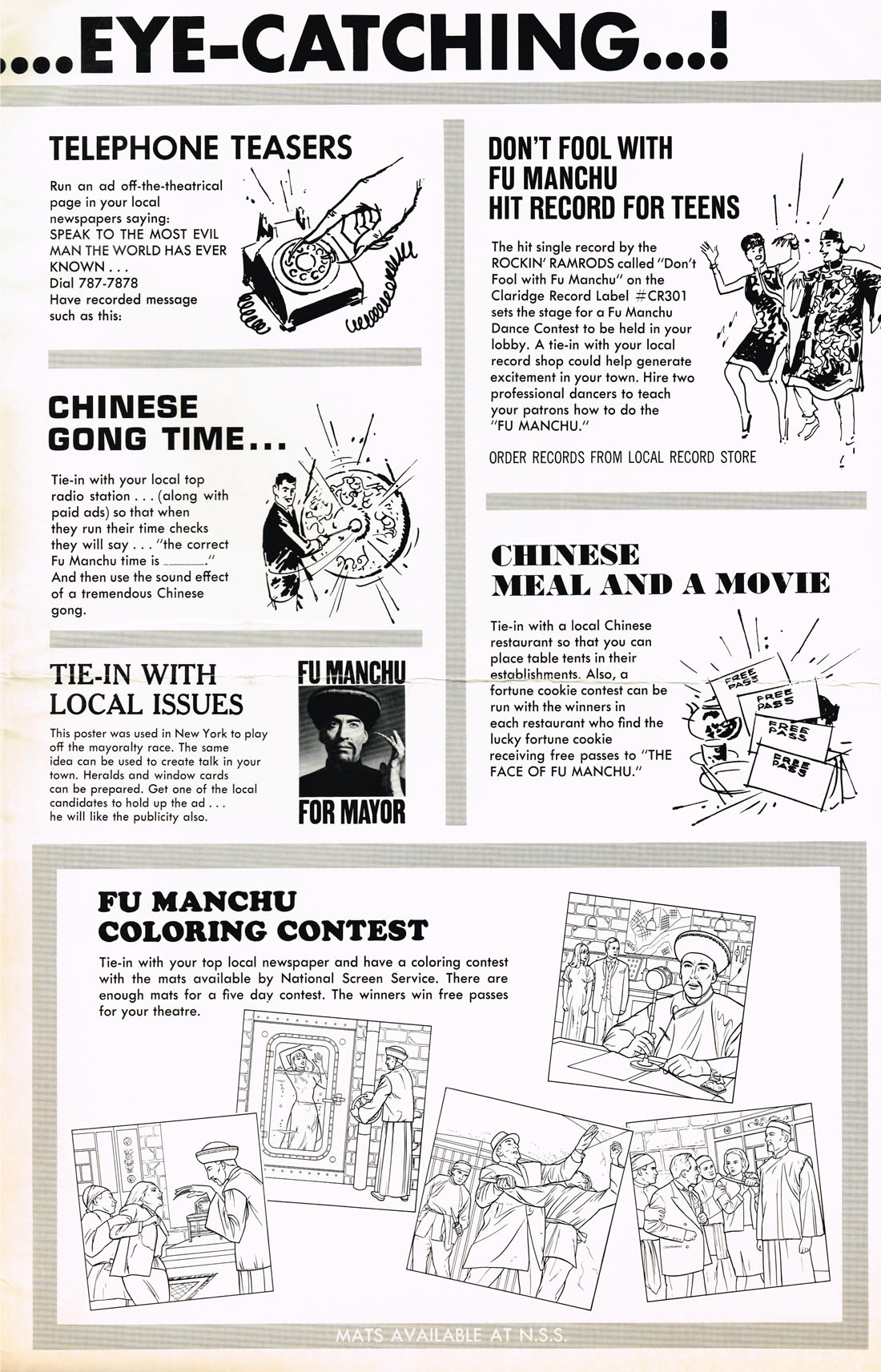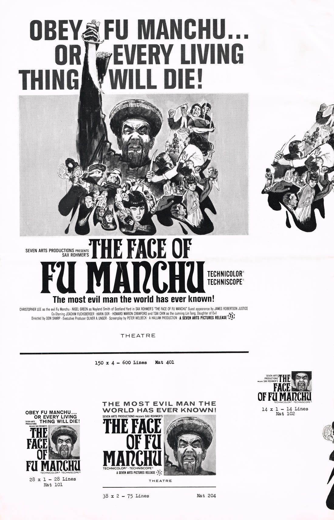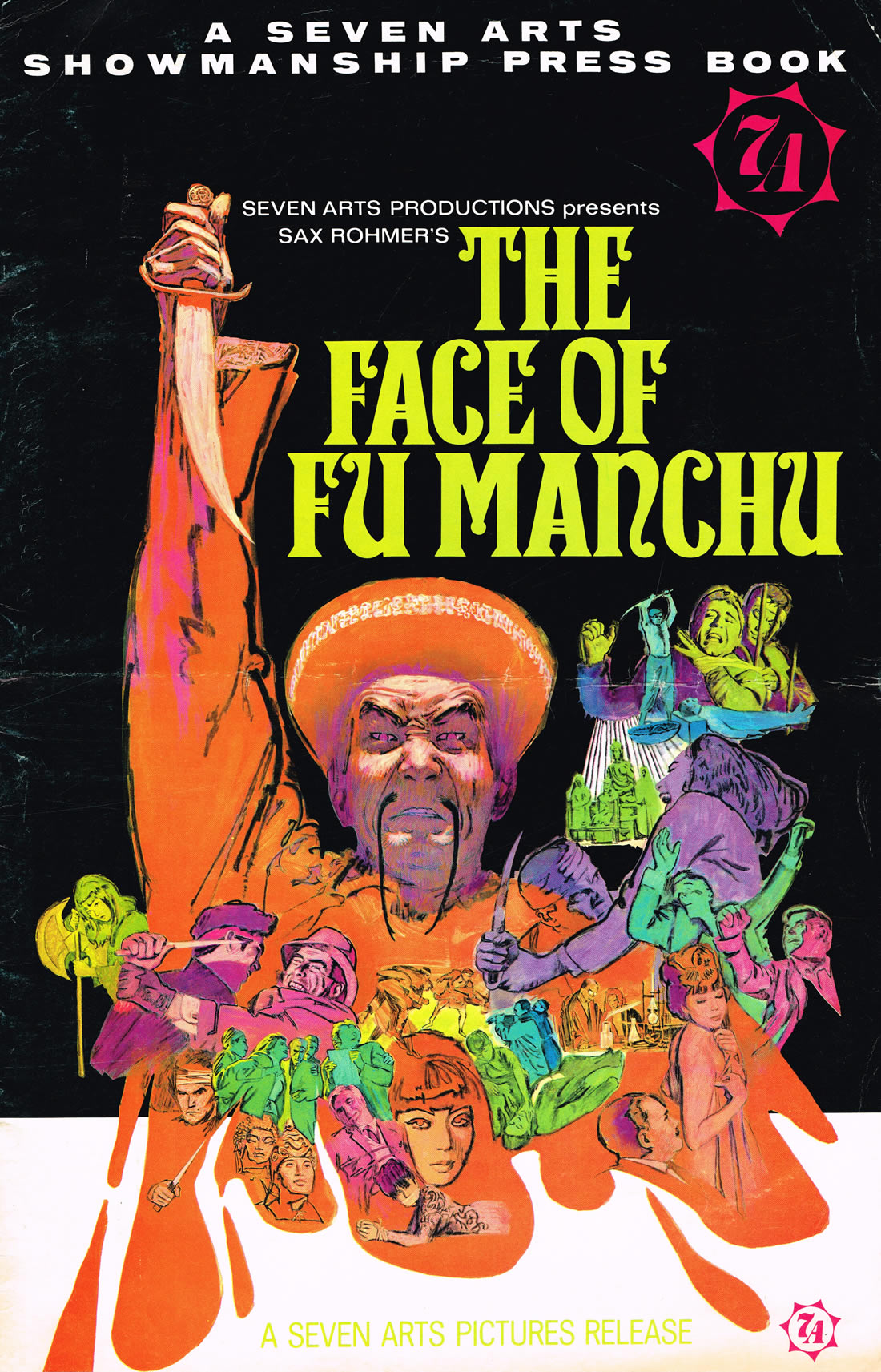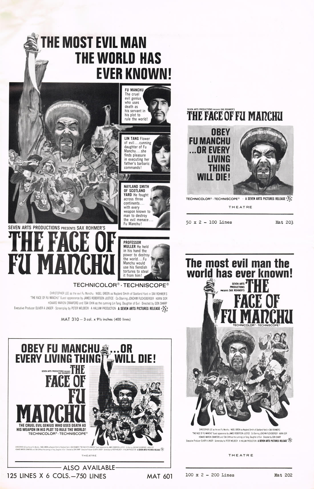 A coloring contest for The Face of Fu Manchu? Sure, the cover of this pressbook is fantastic, but I'm not sure using a coloring contest (see next to last page) is a suitable promotional gimmick. I think Tsai Chin as his daughter stole the show. This series left quite an impression on me when they originally appeared in the theaters. I read the Sax Rohmer books after seeing Christopher Lee's sinister performance.