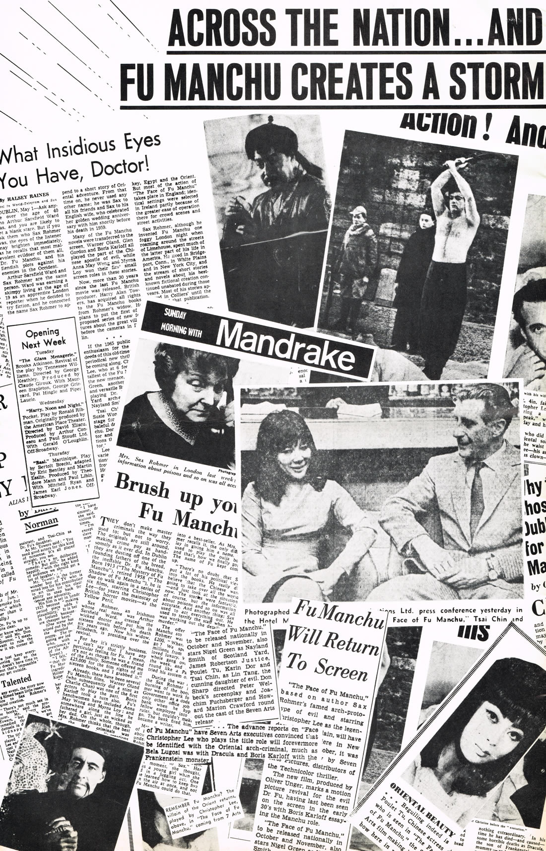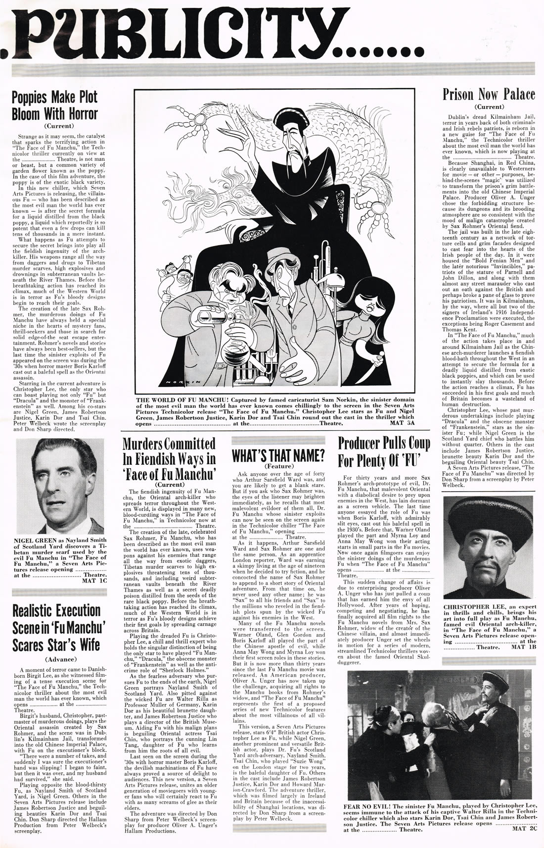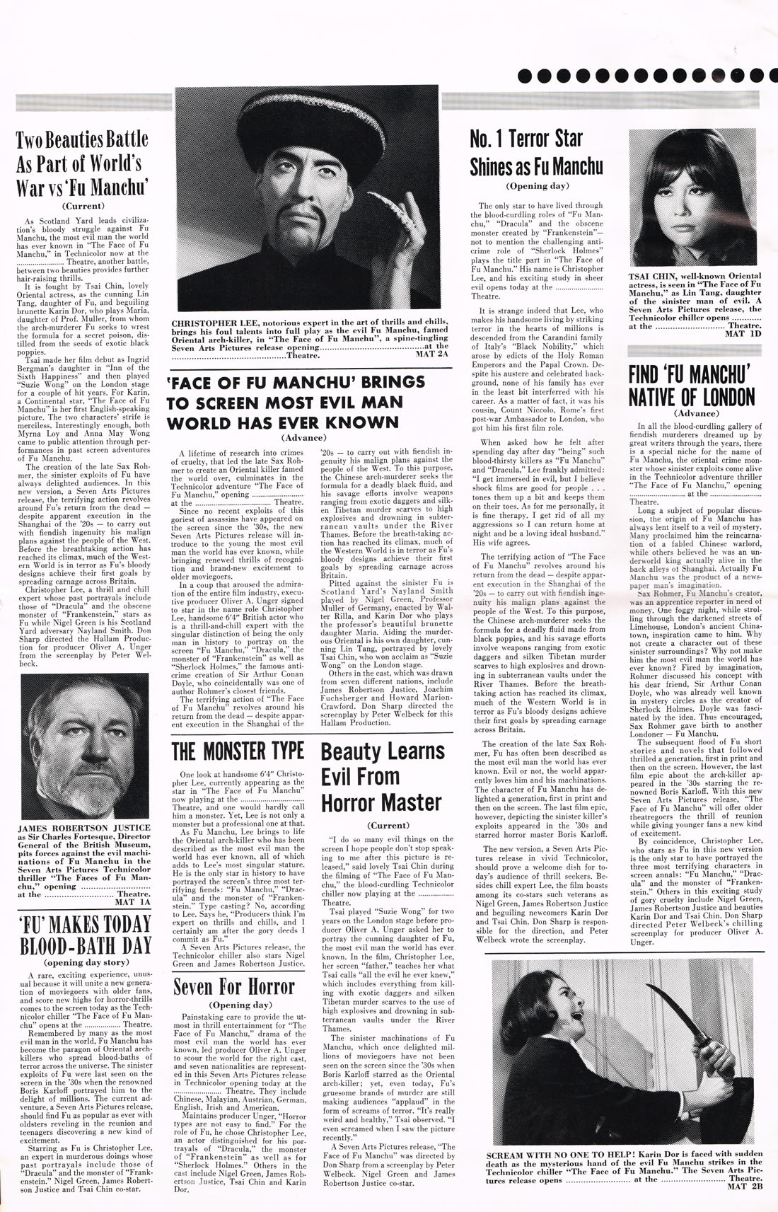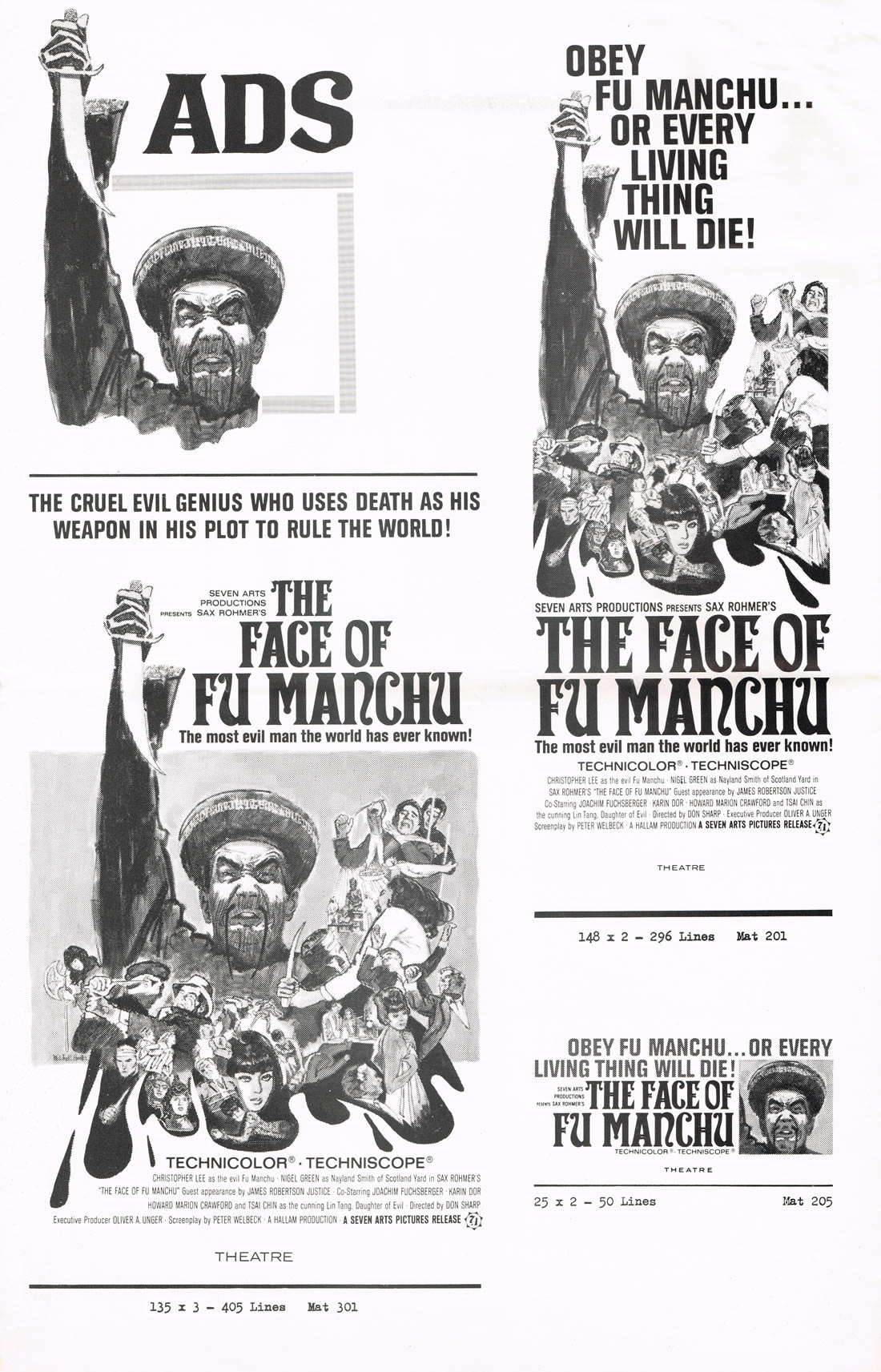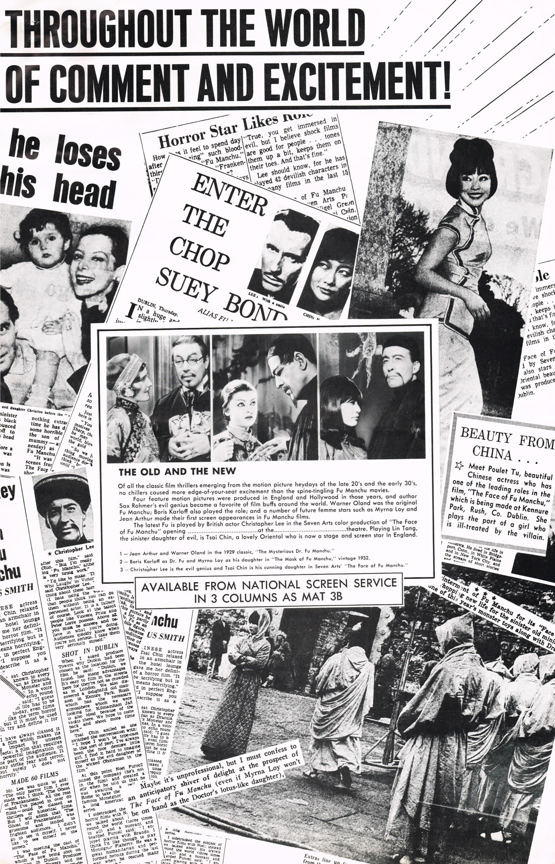 A coloring contest for The Face of Fu Manchu? Sure, the cover of this pressbook is fantastic, but I'm not sure using a coloring contest (see next to last page) is a suitable promotional gimmick. I think Tsai Chin as his daughter stole the show. This series left quite an impression on me when they originally appeared in the theaters. I read the Sax Rohmer books after seeing Christopher Lee's sinister performance.