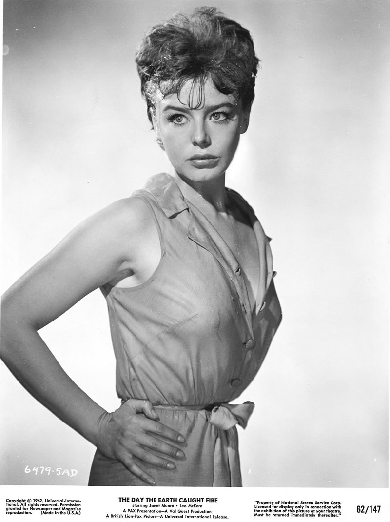 Rummaging through Professor Kinema's files, I came across these photos of Janet Munro, two of which are from The Crawling Eye, an effective chiller that should be remade. Who doesn't love crawling eye monsters? Munro died at the age of 38.