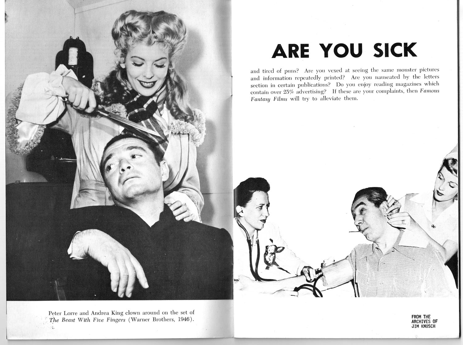 While horror, fantasy, and science-fiction magazines crowded the racks at the corner store in the 1960s and 70s, fanzines grew in popularity as more fans became knowledgeable in the genre and rolled their own. Here's Famous Fantasy Films from 1965, courtesy of Professor Kinema, which addressed the following concern: "Are you sick and tired of puns? Are you vexed at seeing the same monster pictures and information repeatedly printed? Do you enjoy reading magazines which contain over 25% advertising? If these are your complaints, then Famous Fantasy Films will try to alleviate them."