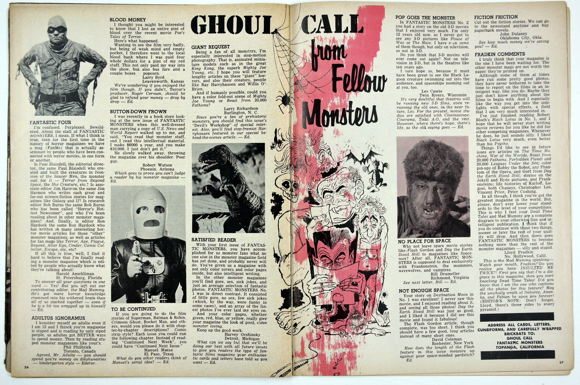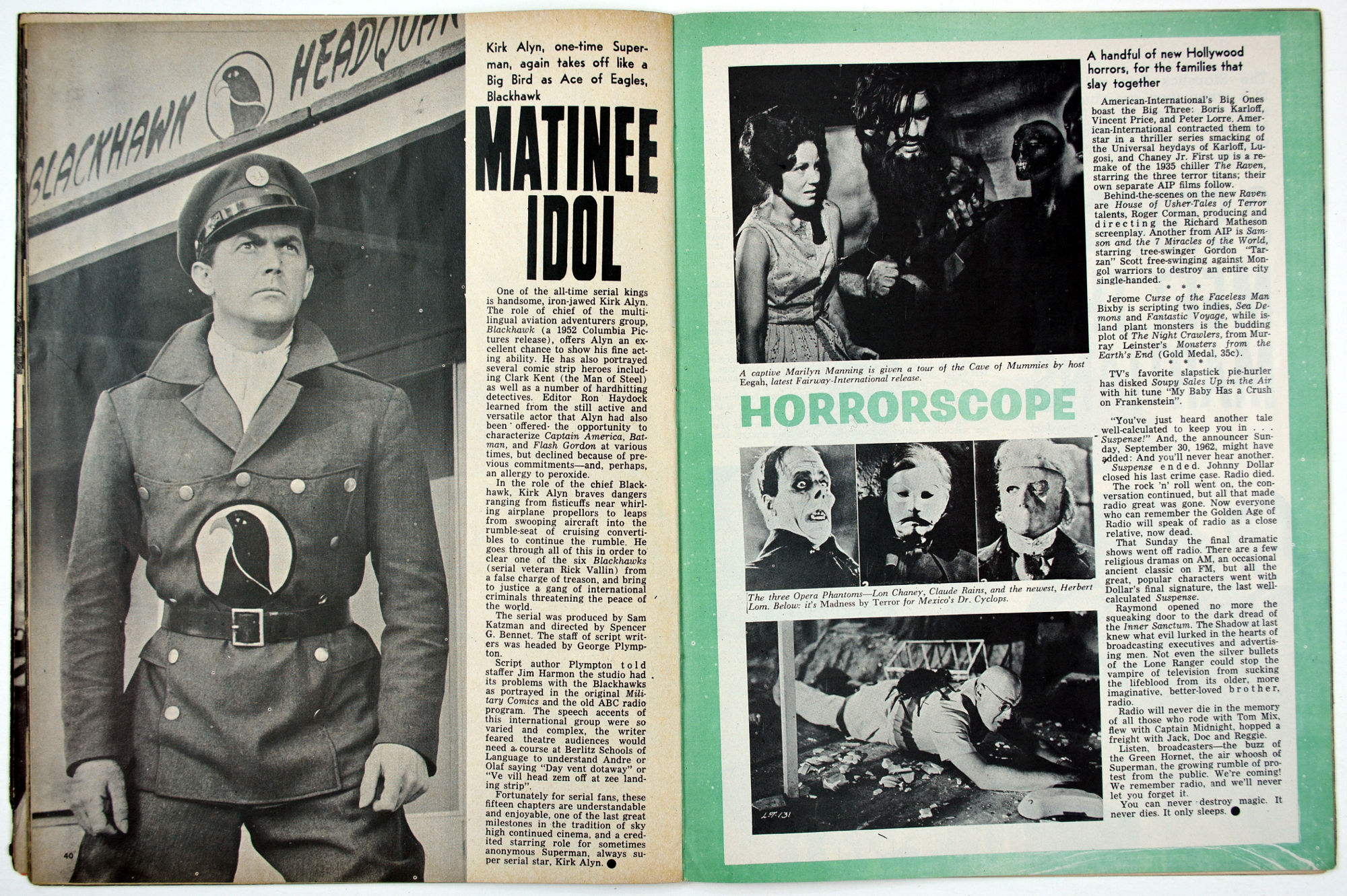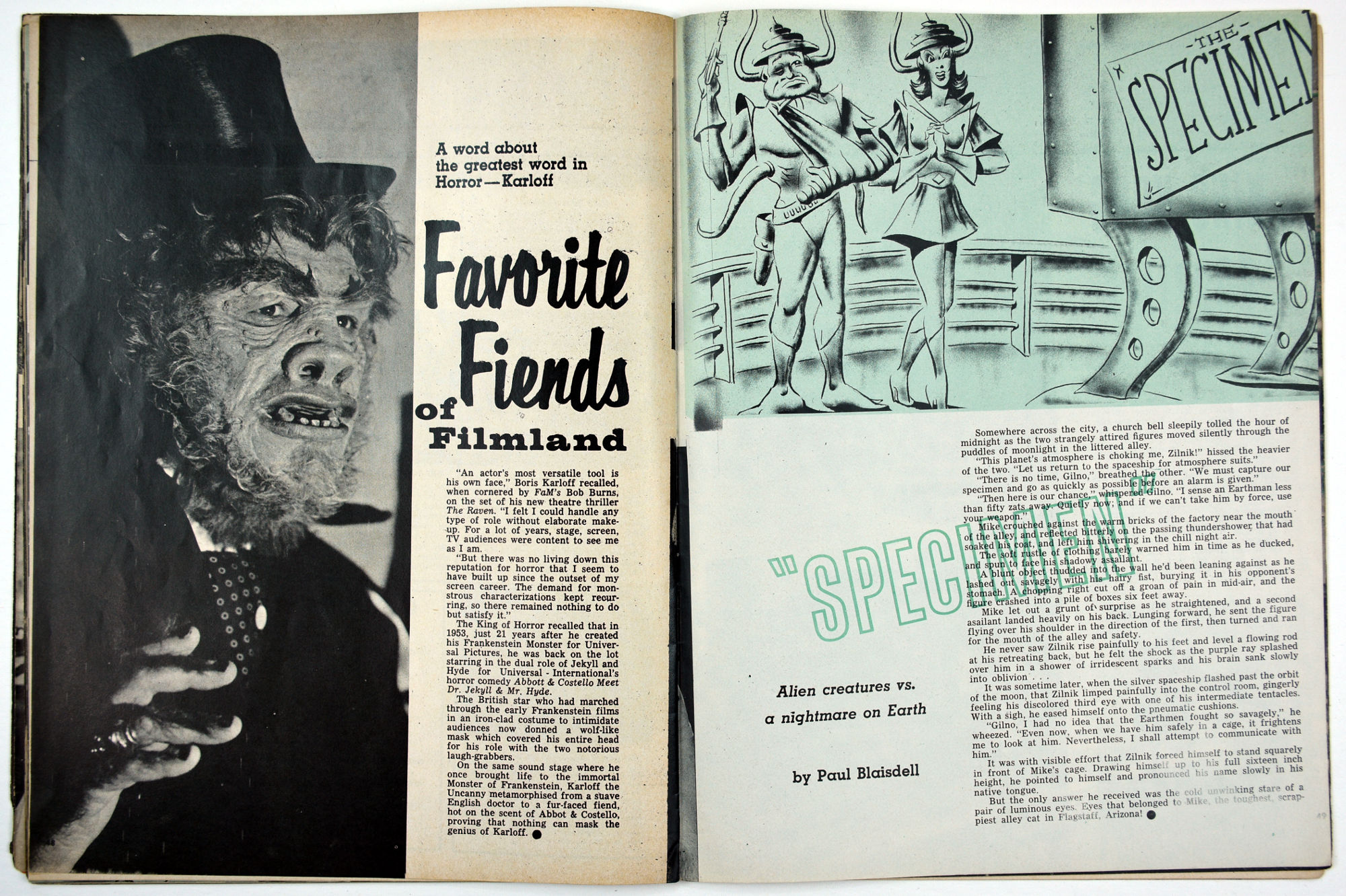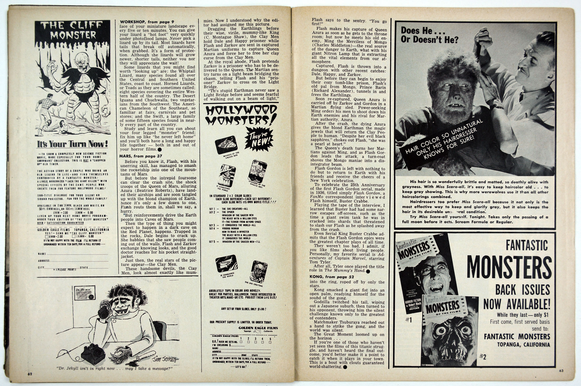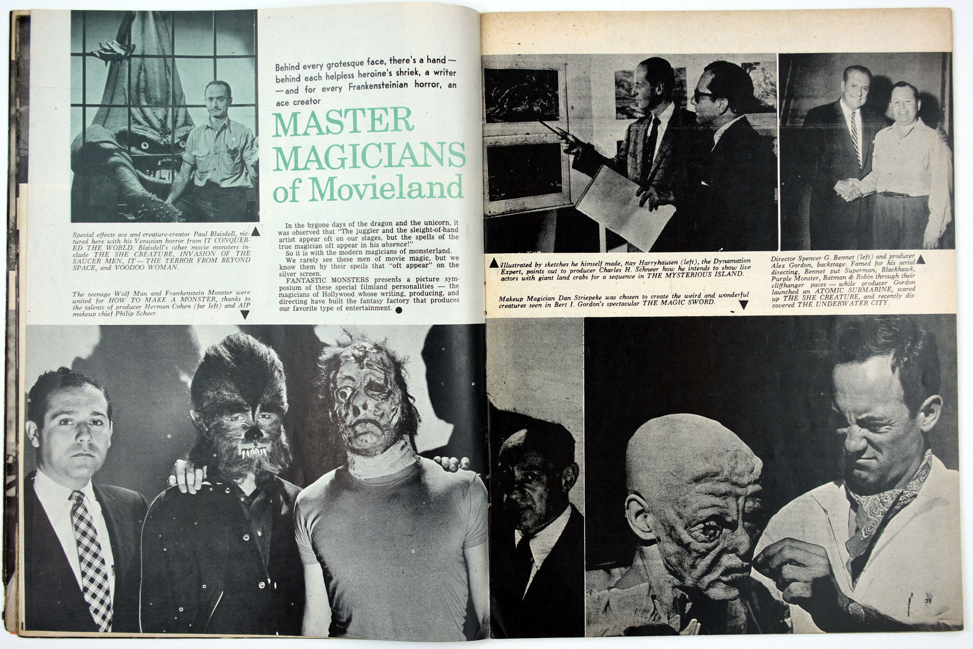 Photos, photos, and more photos fill Fantastic Monsters of the Films magazine. Issue 3, courtesy of Professor Kinema, has The Devil's Workshop by Paul Blaisdell, Vincent Price in the Tower of London, an eye on Doctor Cyclops, and radio stories made into movies in Terror in the Air. Great shots from 3 Stooges Meet the Martians and for A Belfry of Bela make this another issue to treasure. But the piece de resistance is the photo on the inside back cover: it shows an early maquette of the Creature from the Black Lagoon!
