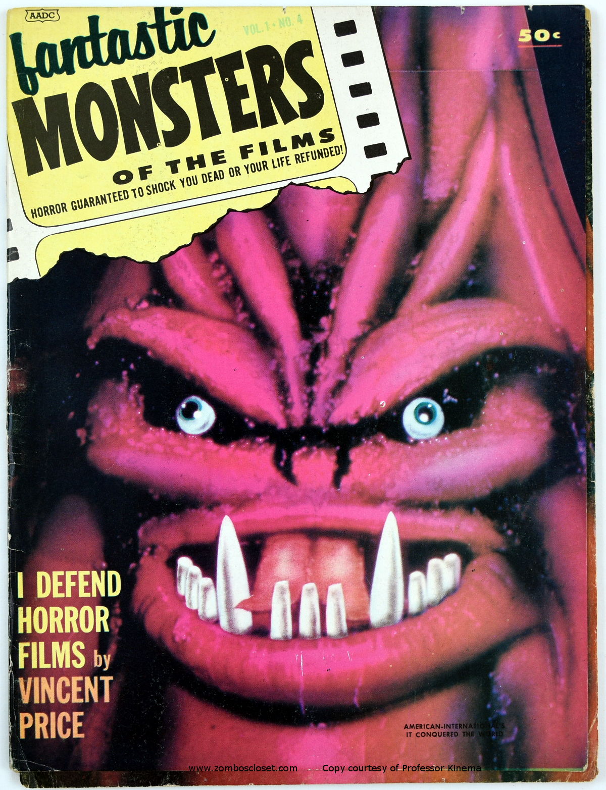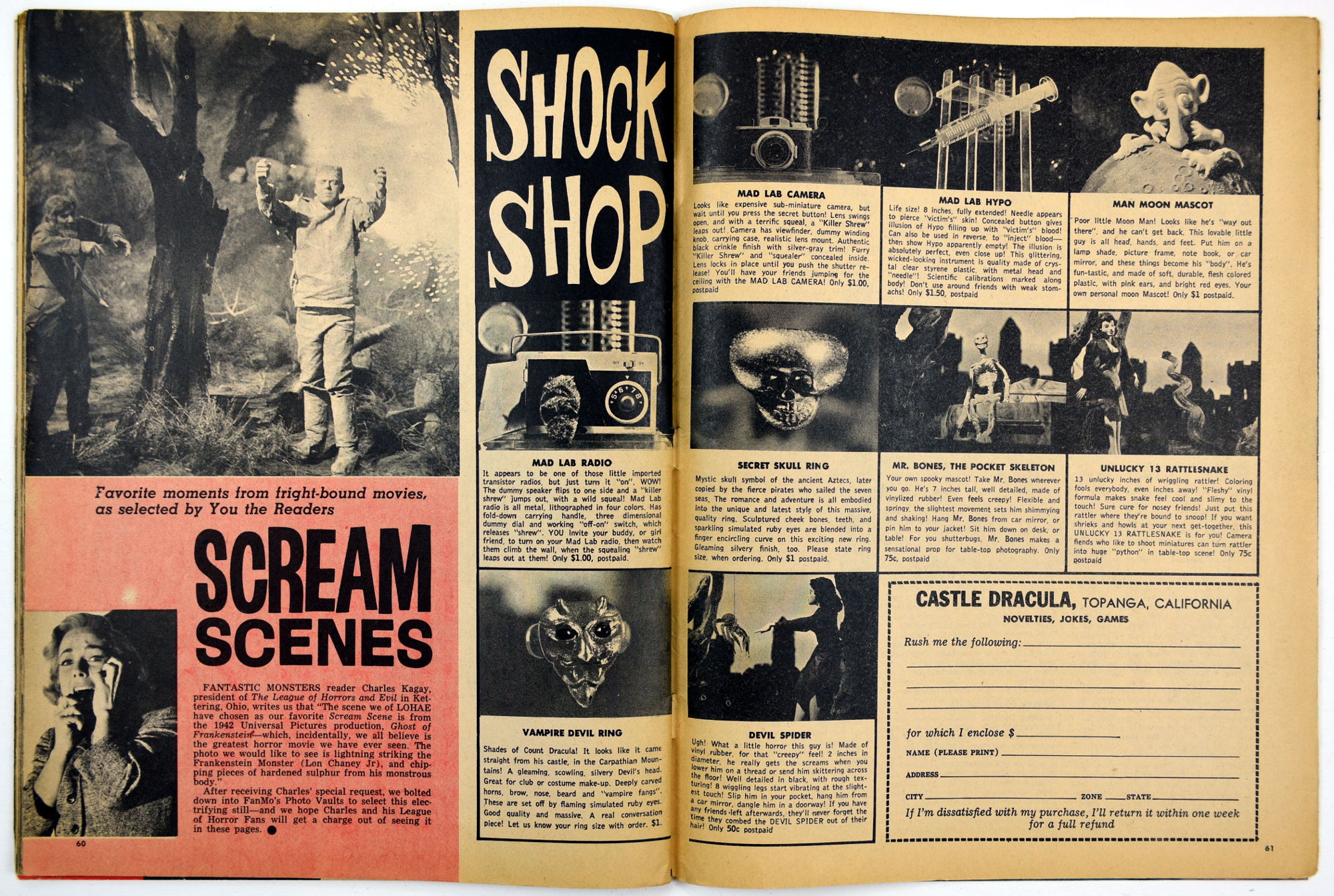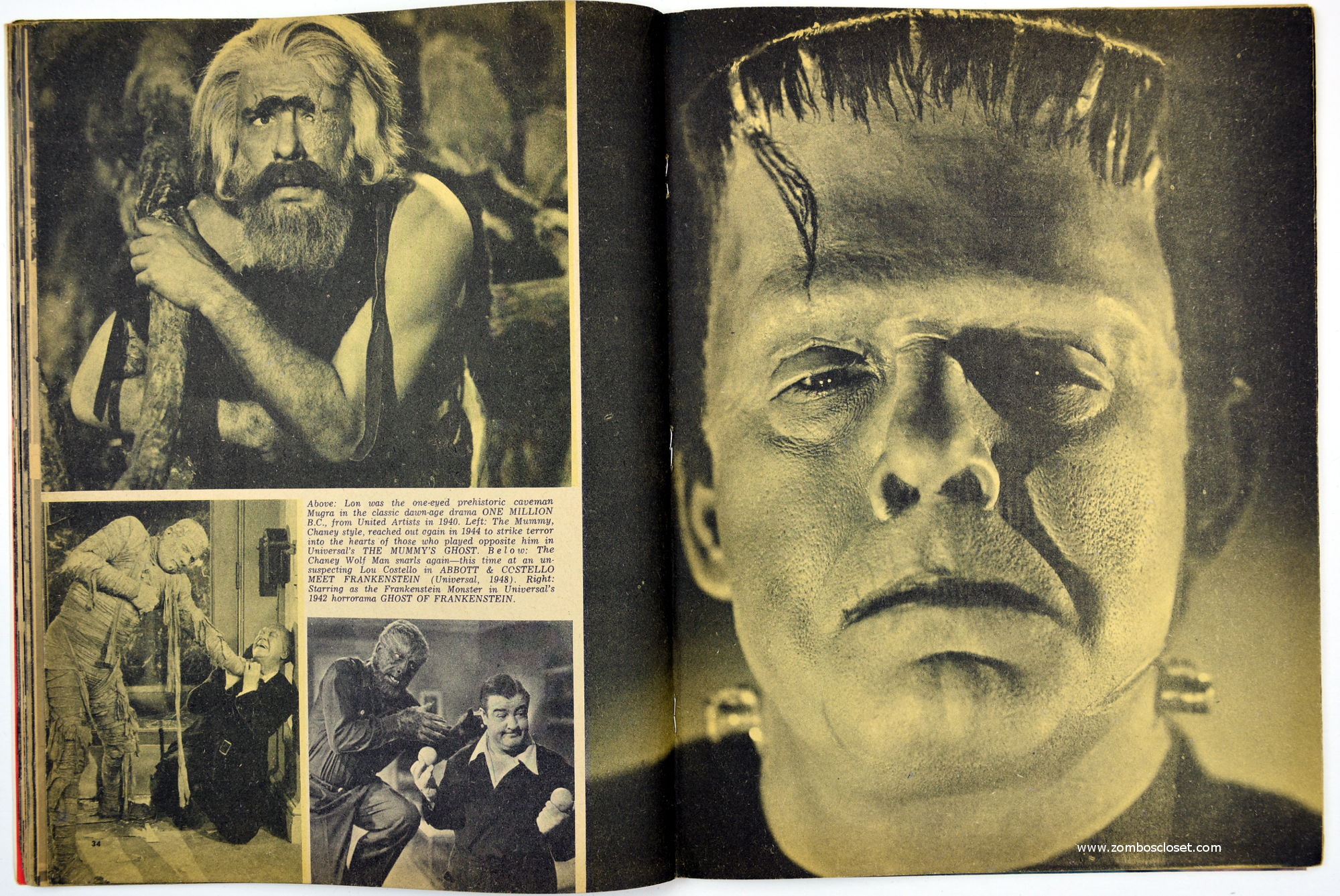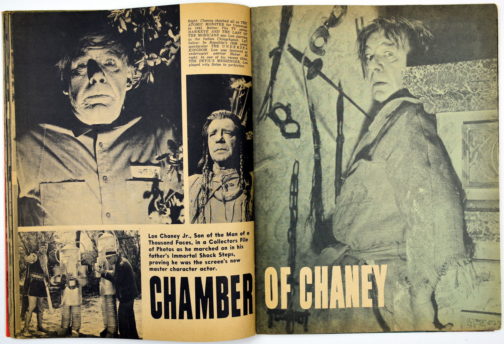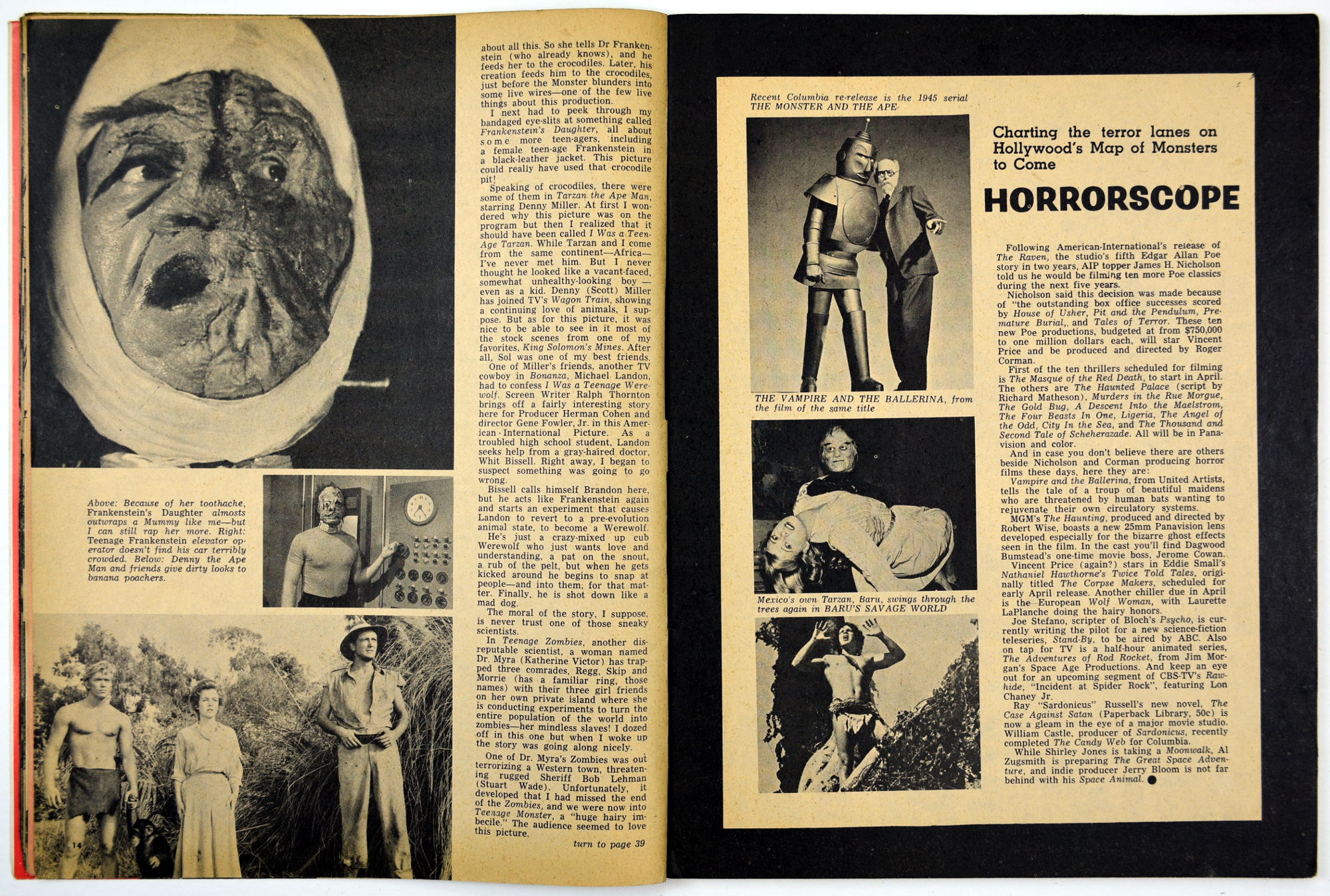 More horror movie coverage with lots of photos fills up Fantastic Monsters of the Films issue 4. The Raven from AIP gets nice coverage, James Bond's first outing with Dr. No gets a license to see, and George Pal is highlighted. A fantastic close-up of Lon Chaney Jr. as the Frankenstein Monster stands out among other great shots of him in various roles, and horror host Jeepers of Theatre 13 is spotlighted. A treat for Mexican horror fans is Thomas Bradley's article, Ship of Monsters. Another real treat is Vincent Price's In Defense of Horror Films. (This copy comes from Professor Kinema's archive.)