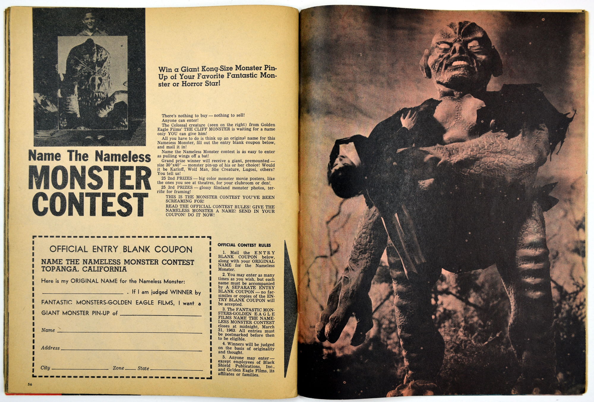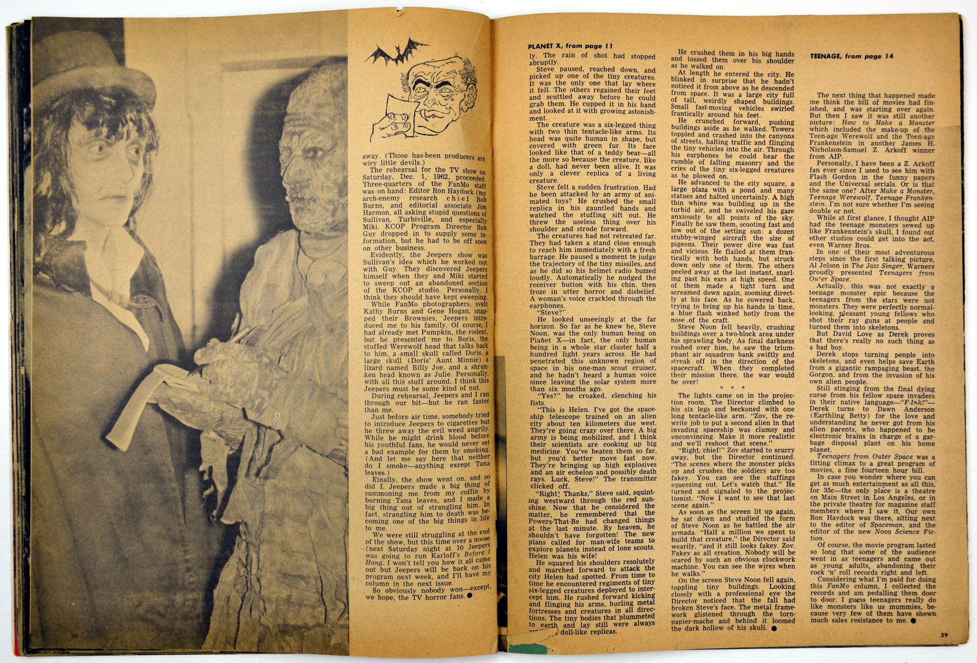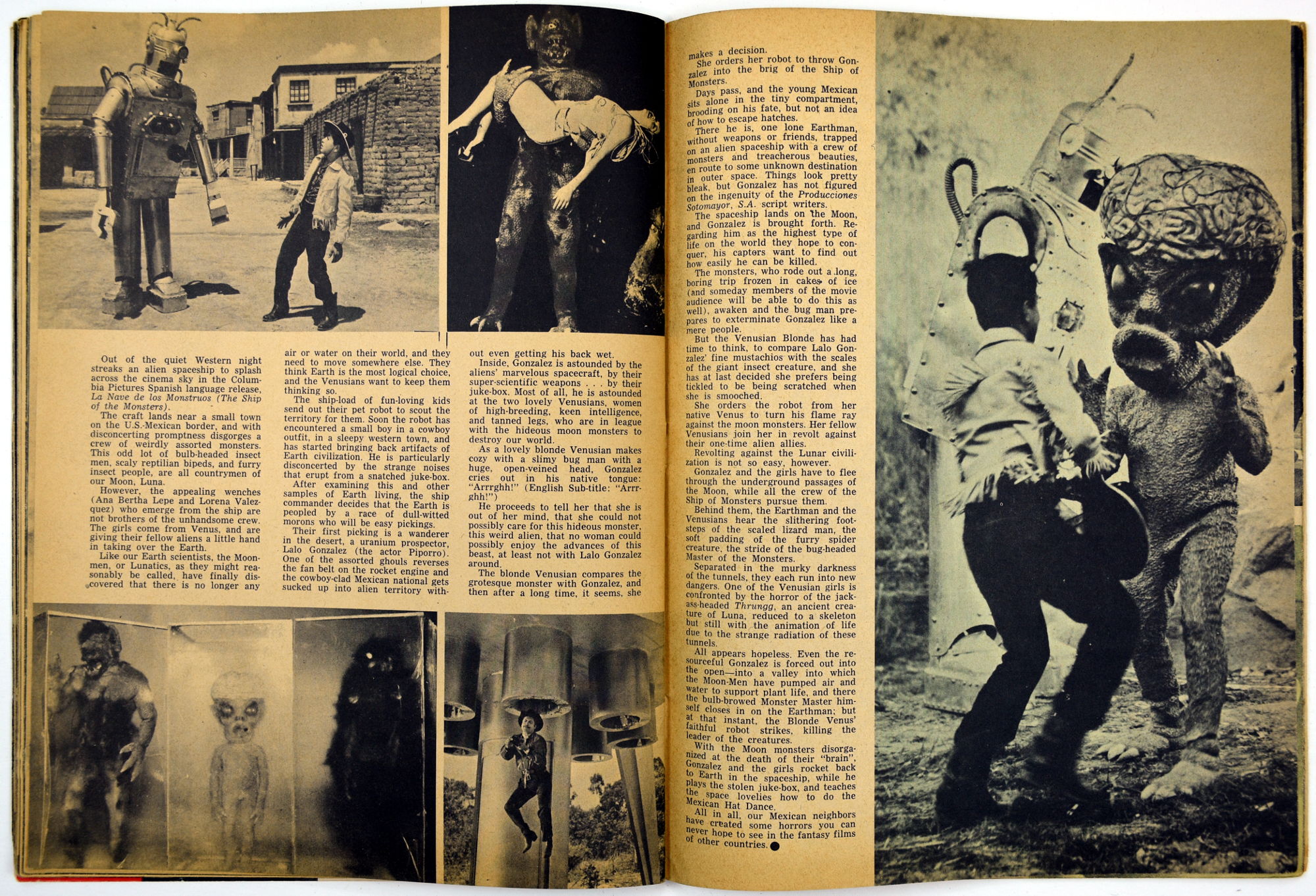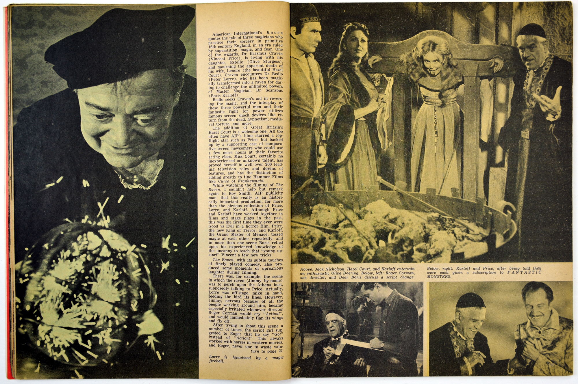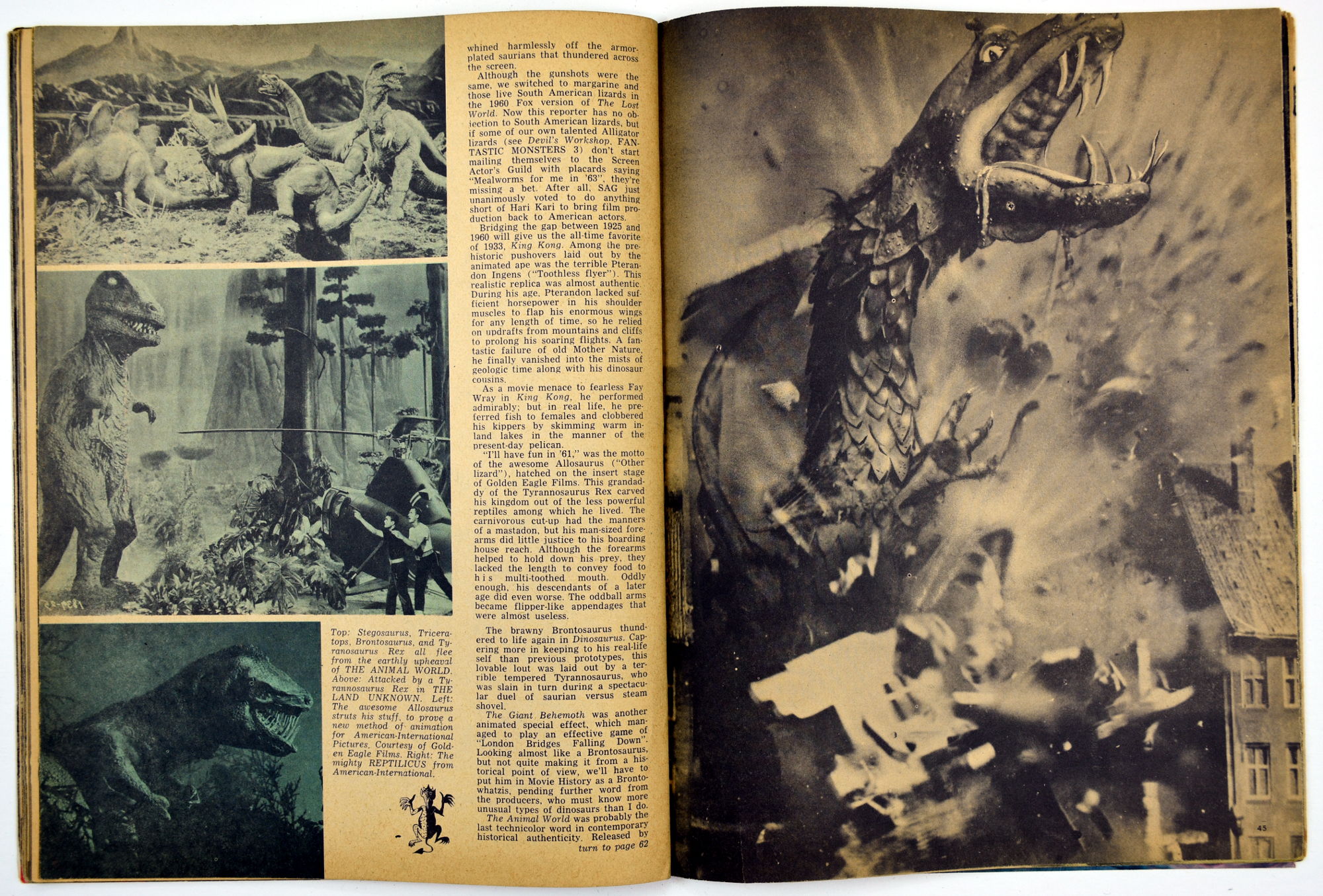 More horror movie coverage with lots of photos fills up Fantastic Monsters of the Films issue 4. The Raven from AIP gets nice coverage, James Bond's first outing with Dr. No gets a license to see, and George Pal is highlighted. A fantastic close-up of Lon Chaney Jr. as the Frankenstein Monster stands out among other great shots of him in various roles, and horror host Jeepers of Theatre 13 is spotlighted. A treat for Mexican horror fans is Thomas Bradley's article, Ship of Monsters. Another real treat is Vincent Price's In Defense of Horror Films. (This copy comes from Professor Kinema's archive.)