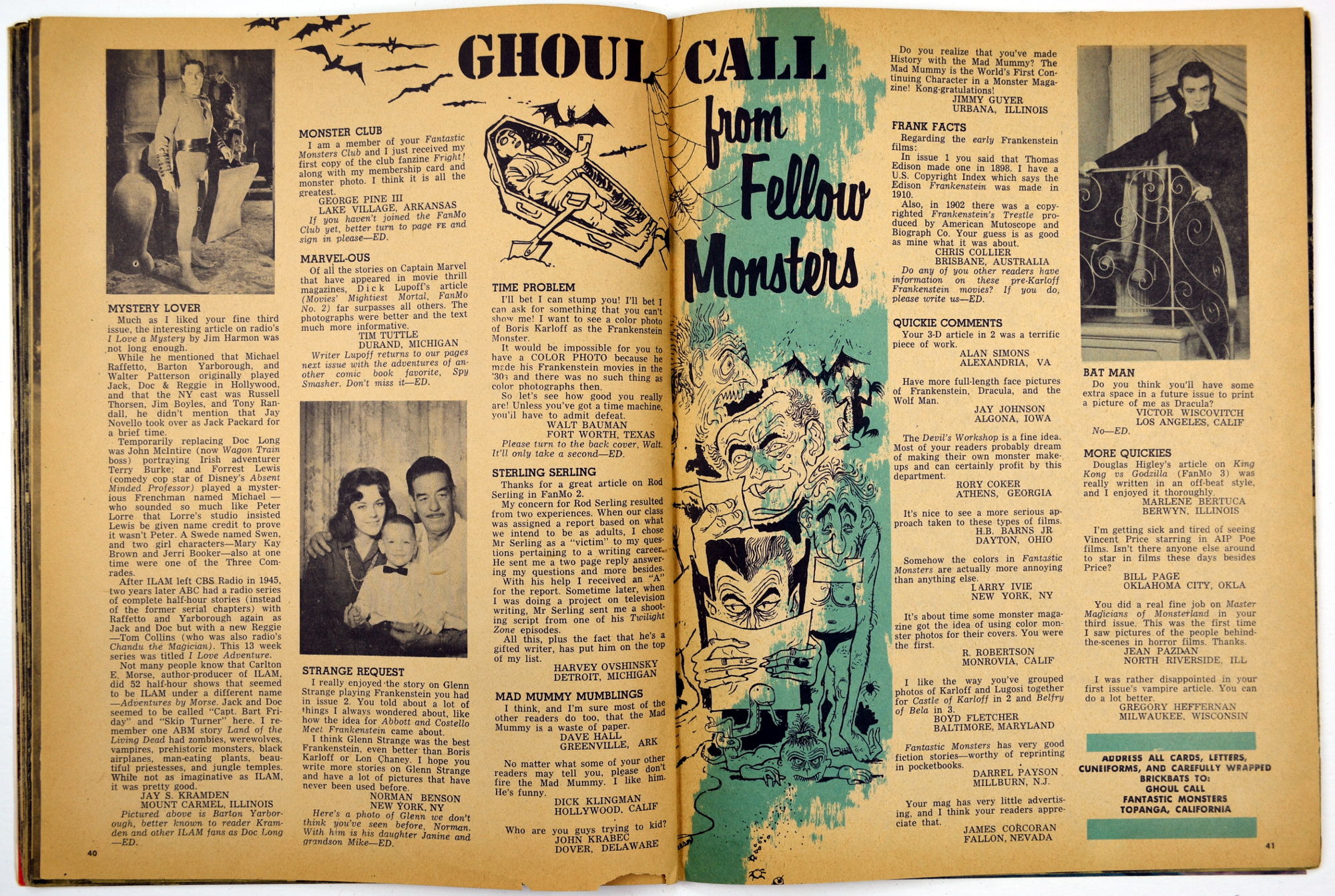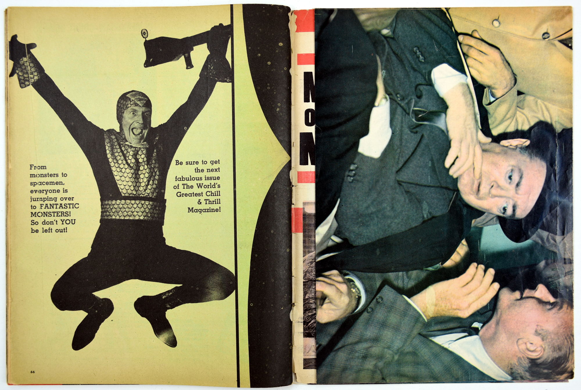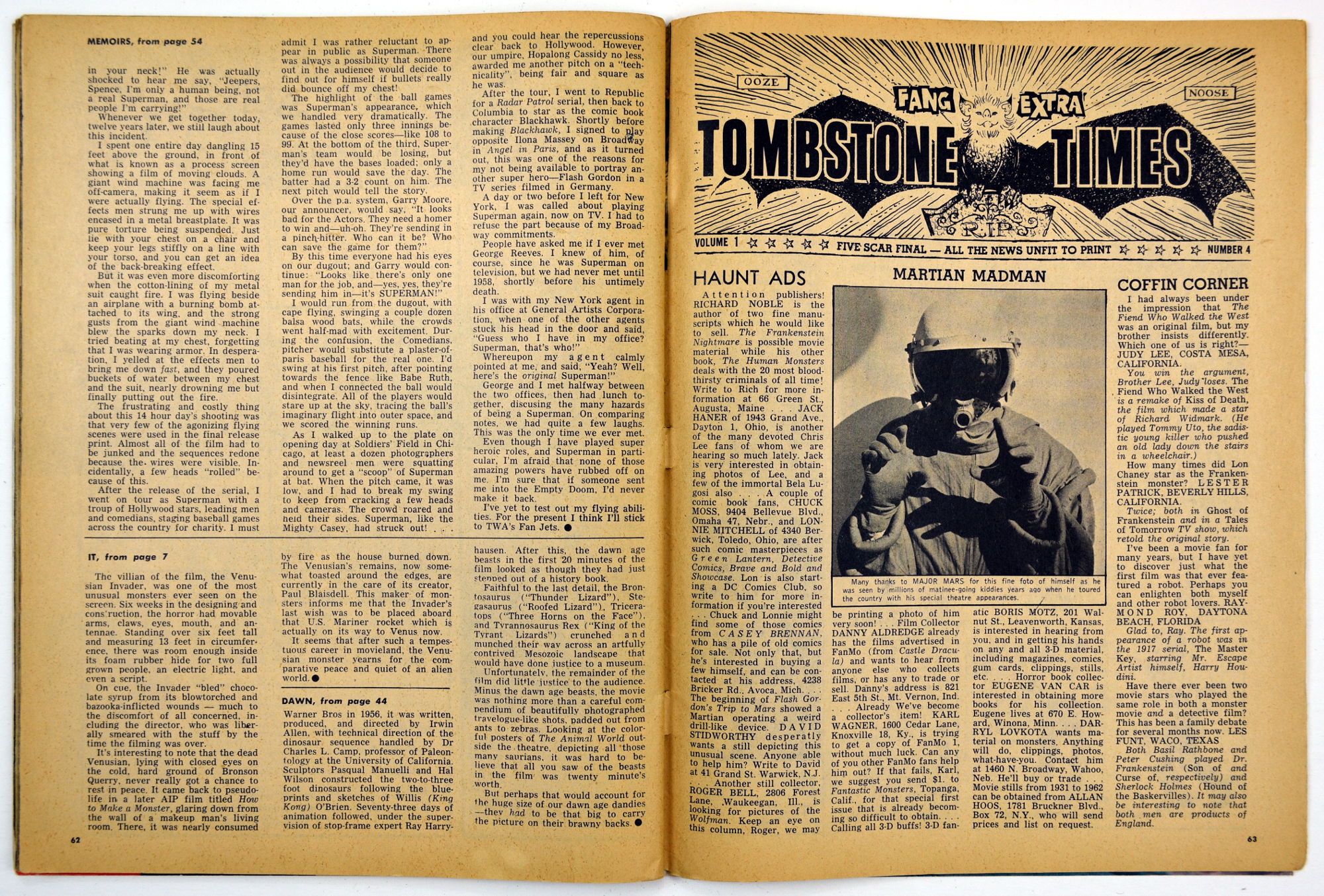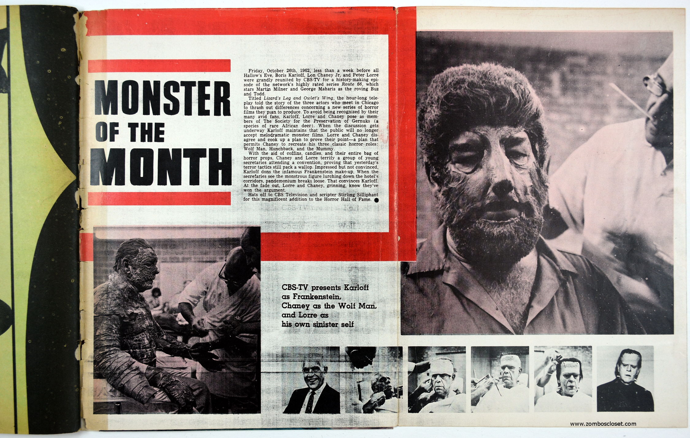 More horror movie coverage with lots of photos fills up Fantastic Monsters of the Films issue 4. The Raven from AIP gets nice coverage, James Bond's first outing with Dr. No gets a license to see, and George Pal is highlighted. A fantastic close-up of Lon Chaney Jr. as the Frankenstein Monster stands out among other great shots of him in various roles, and horror host Jeepers of Theatre 13 is spotlighted. A treat for Mexican horror fans is Thomas Bradley's article, Ship of Monsters. Another real treat is Vincent Price's In Defense of Horror Films. (This copy comes from Professor Kinema's archive.)