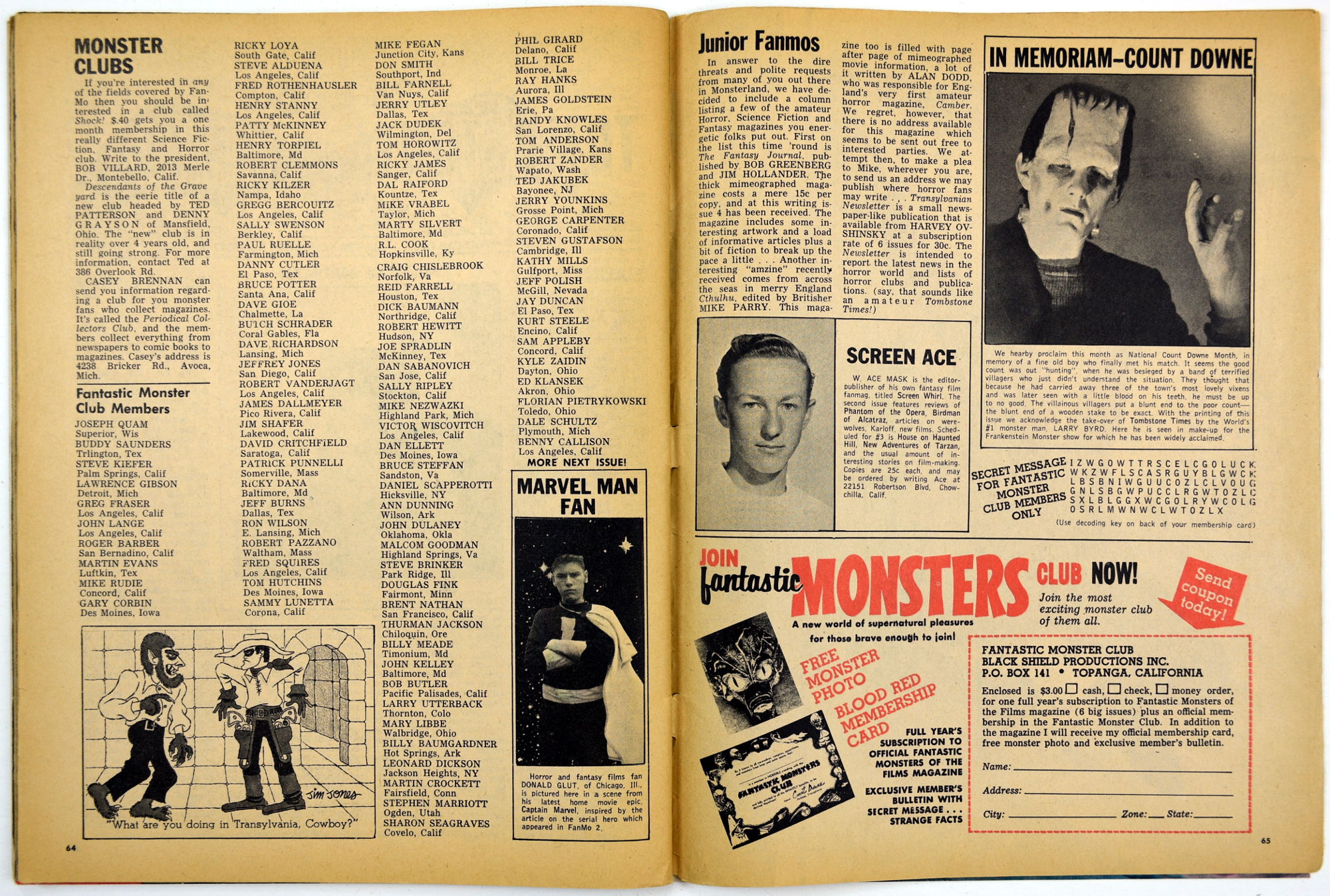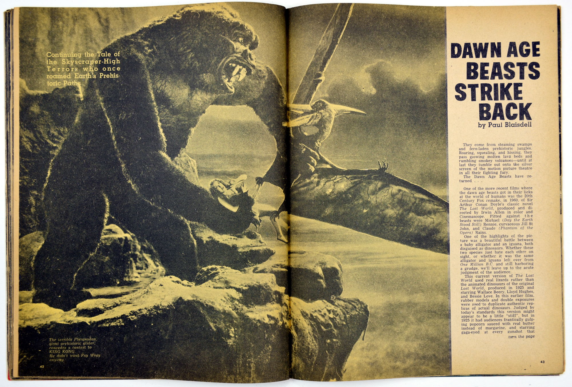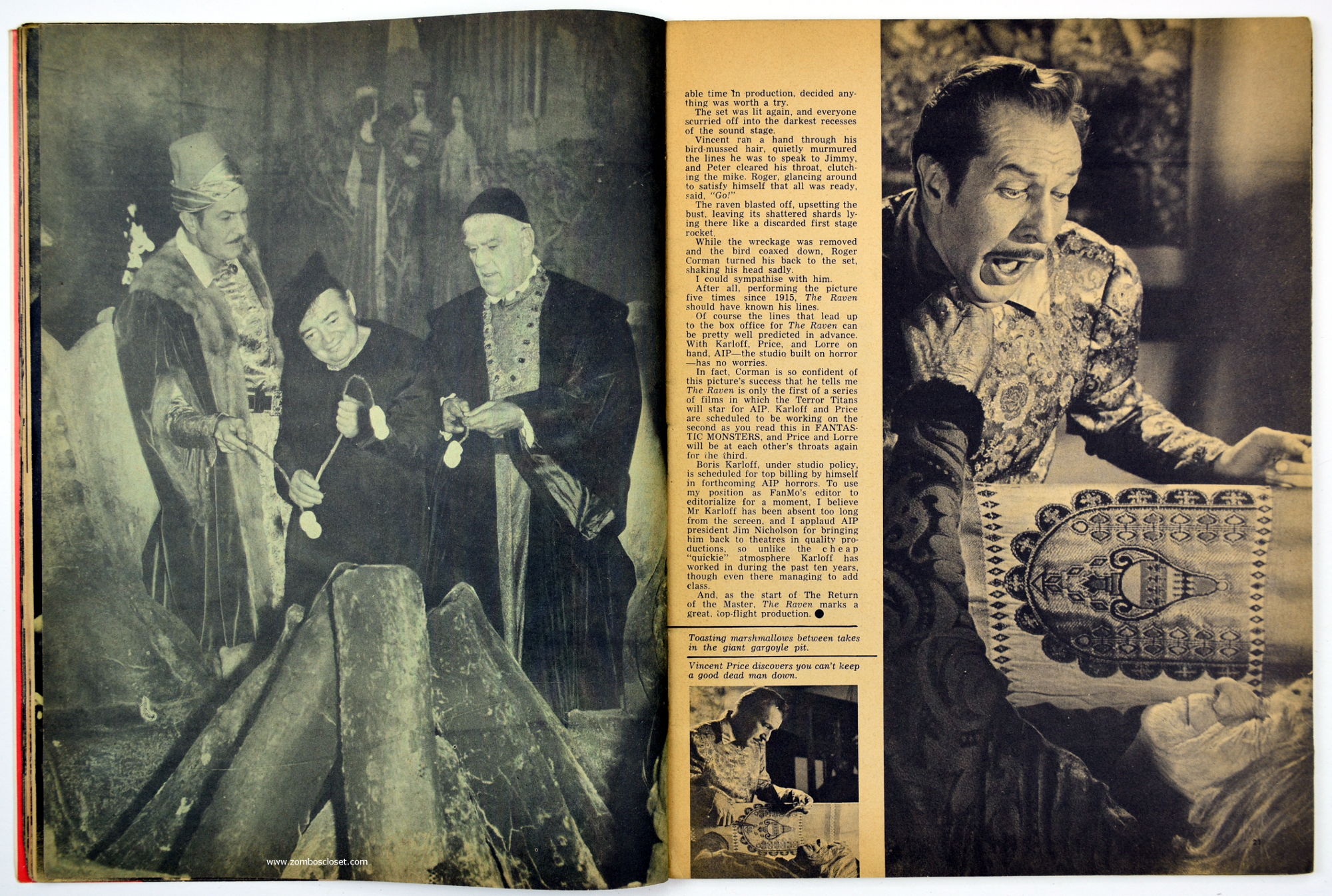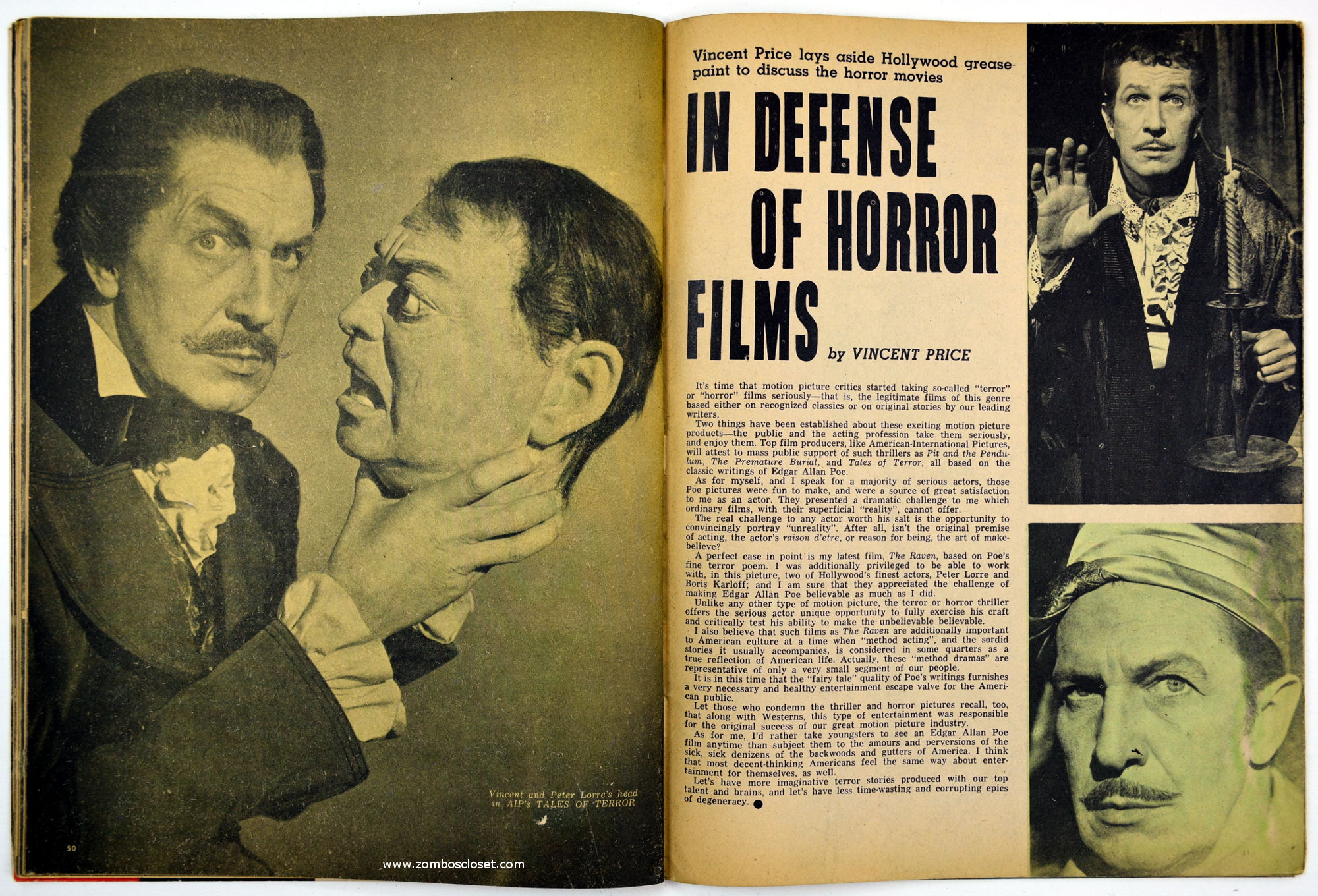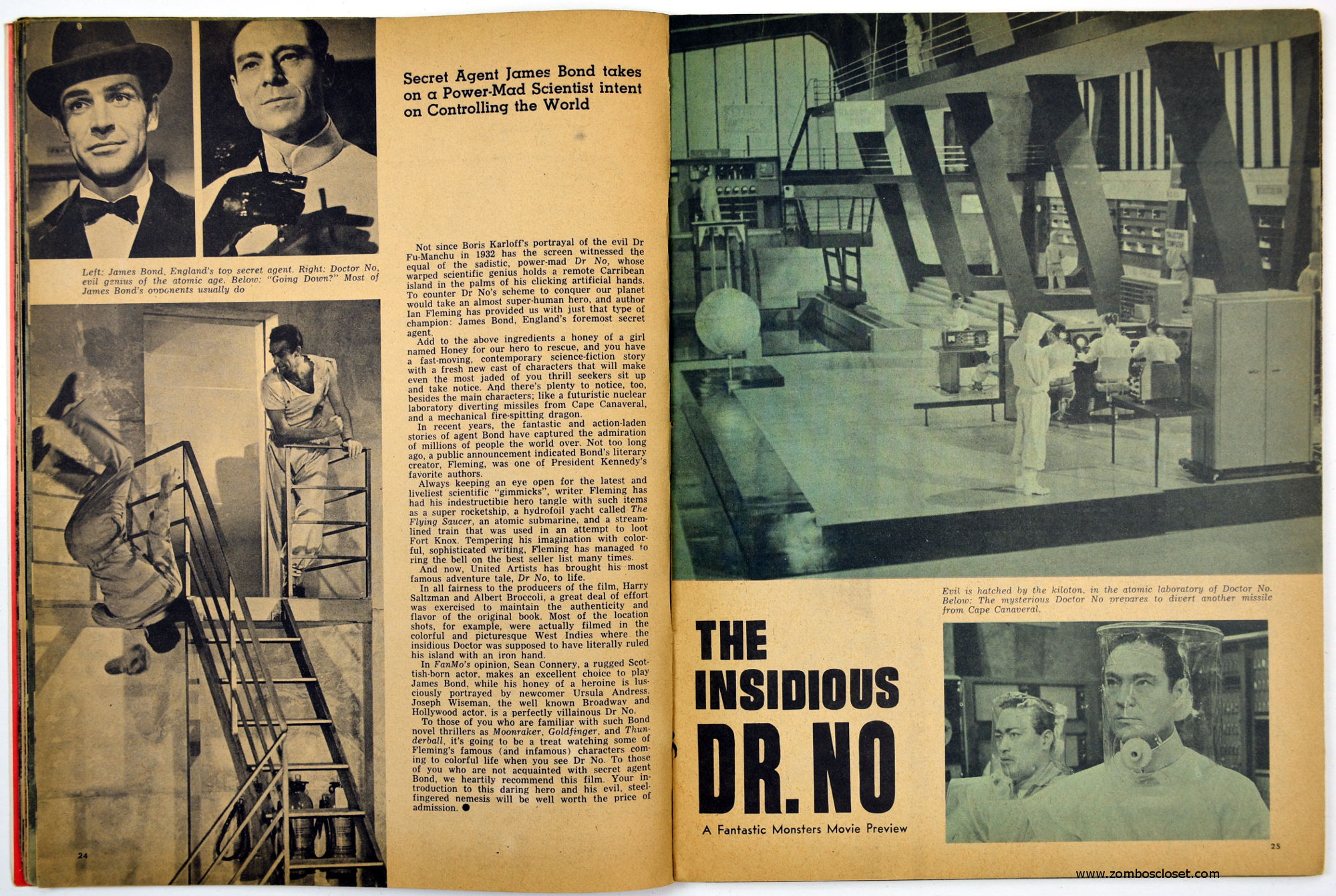 More horror movie coverage with lots of photos fills up Fantastic Monsters of the Films issue 4. The Raven from AIP gets nice coverage, James Bond's first outing with Dr. No gets a license to see, and George Pal is highlighted. A fantastic close-up of Lon Chaney Jr. as the Frankenstein Monster stands out among other great shots of him in various roles, and horror host Jeepers of Theatre 13 is spotlighted. A treat for Mexican horror fans is Thomas Bradley's article, Ship of Monsters. Another real treat is Vincent Price's In Defense of Horror Films. (This copy comes from Professor Kinema's archive.)