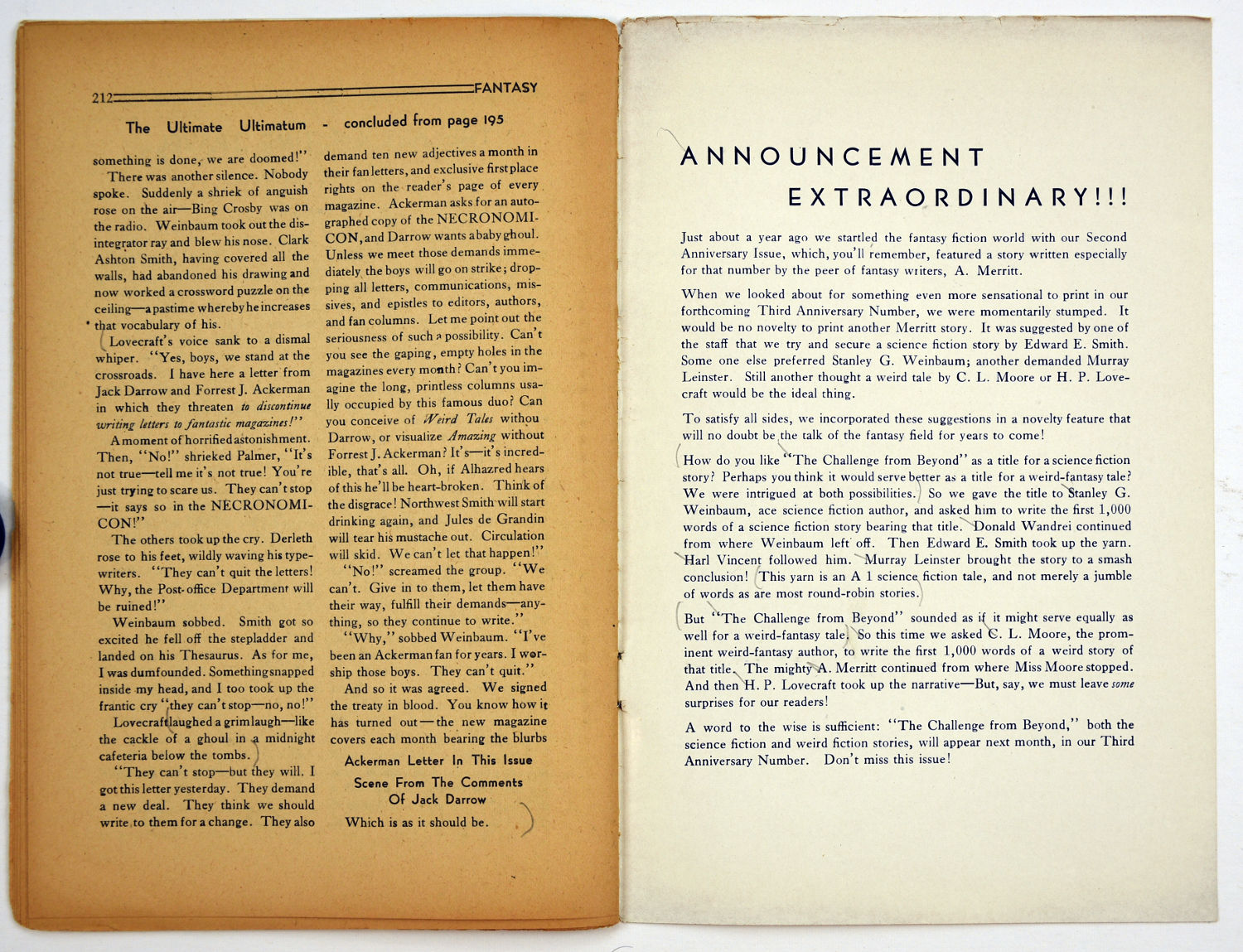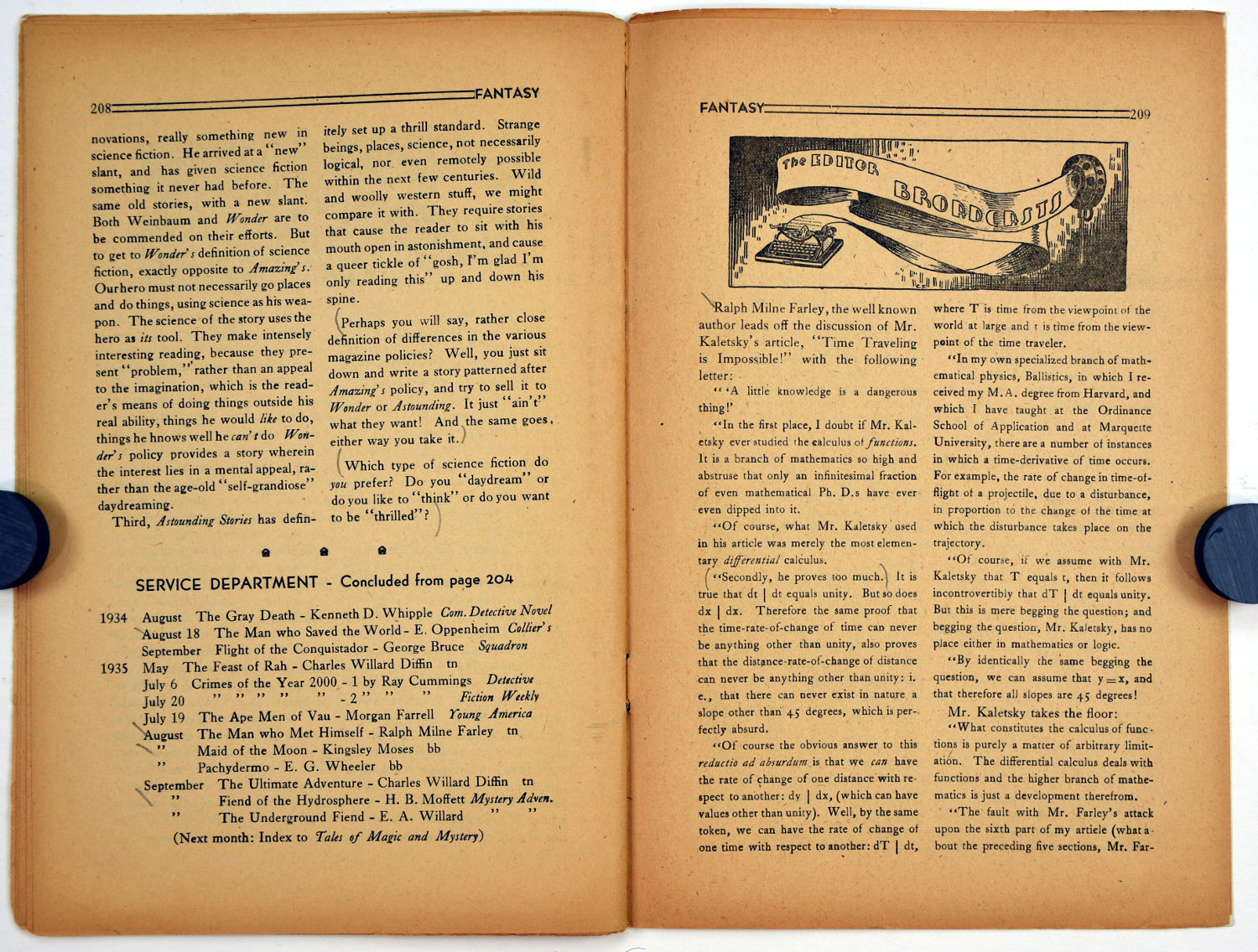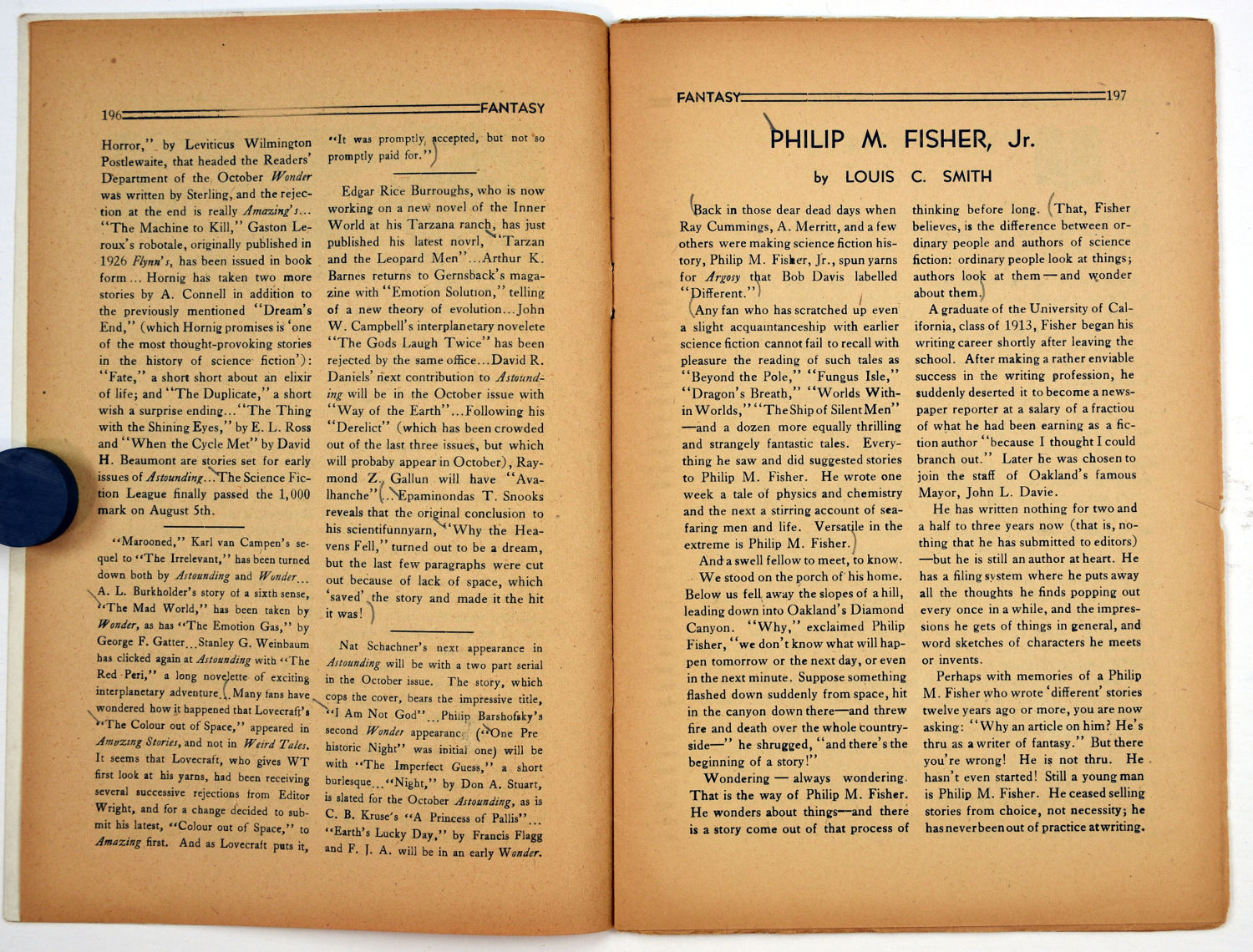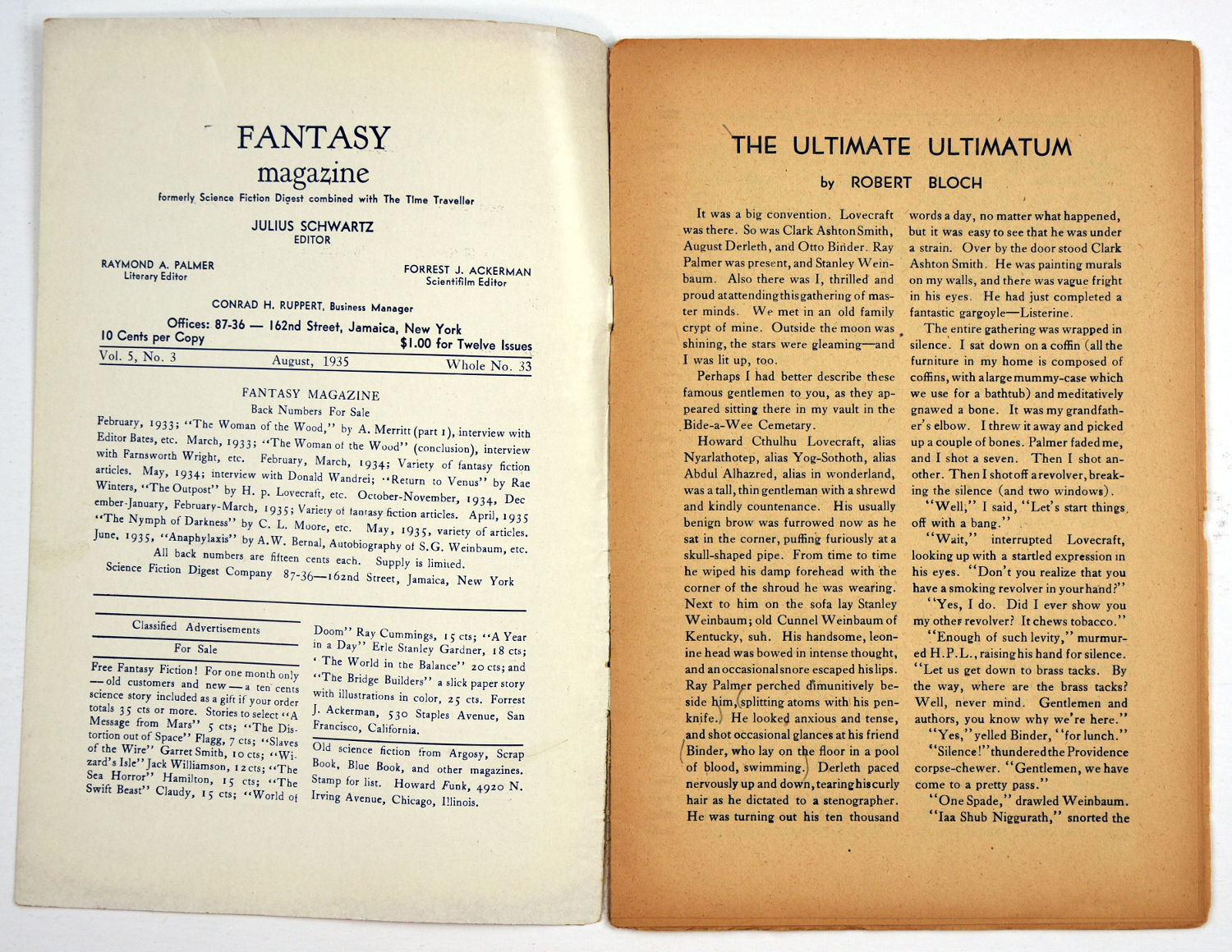 Courtesy of the Professor Kinema's Archives comes another issue of Fantasy Magazine, sent to the Professor by Forrest J. Ackerman some time ago. In this issue, Robert Block writes up a satire, FJA writes another Scientificinematorially Speaking, and Julius Schwartz puts things in focus with The Science Fiction Eye.