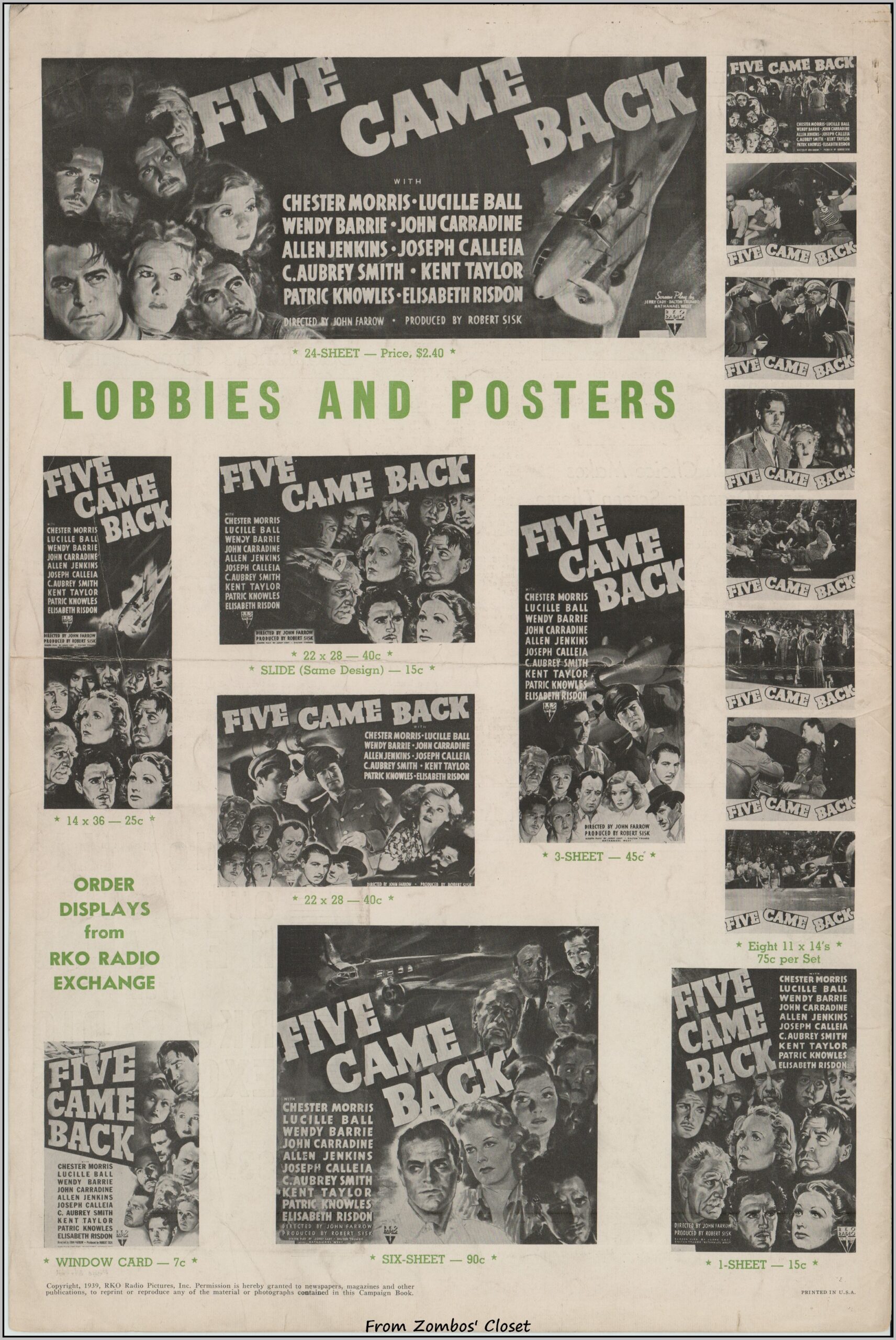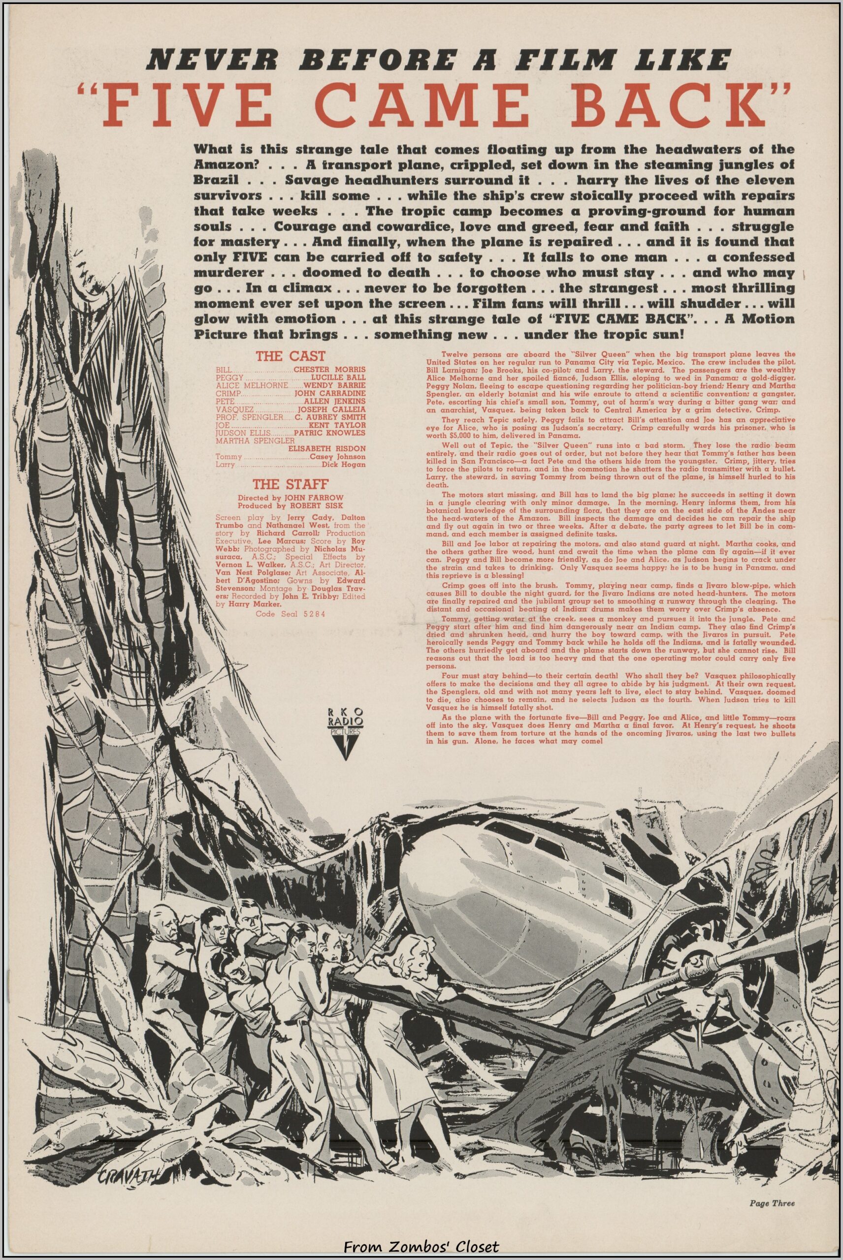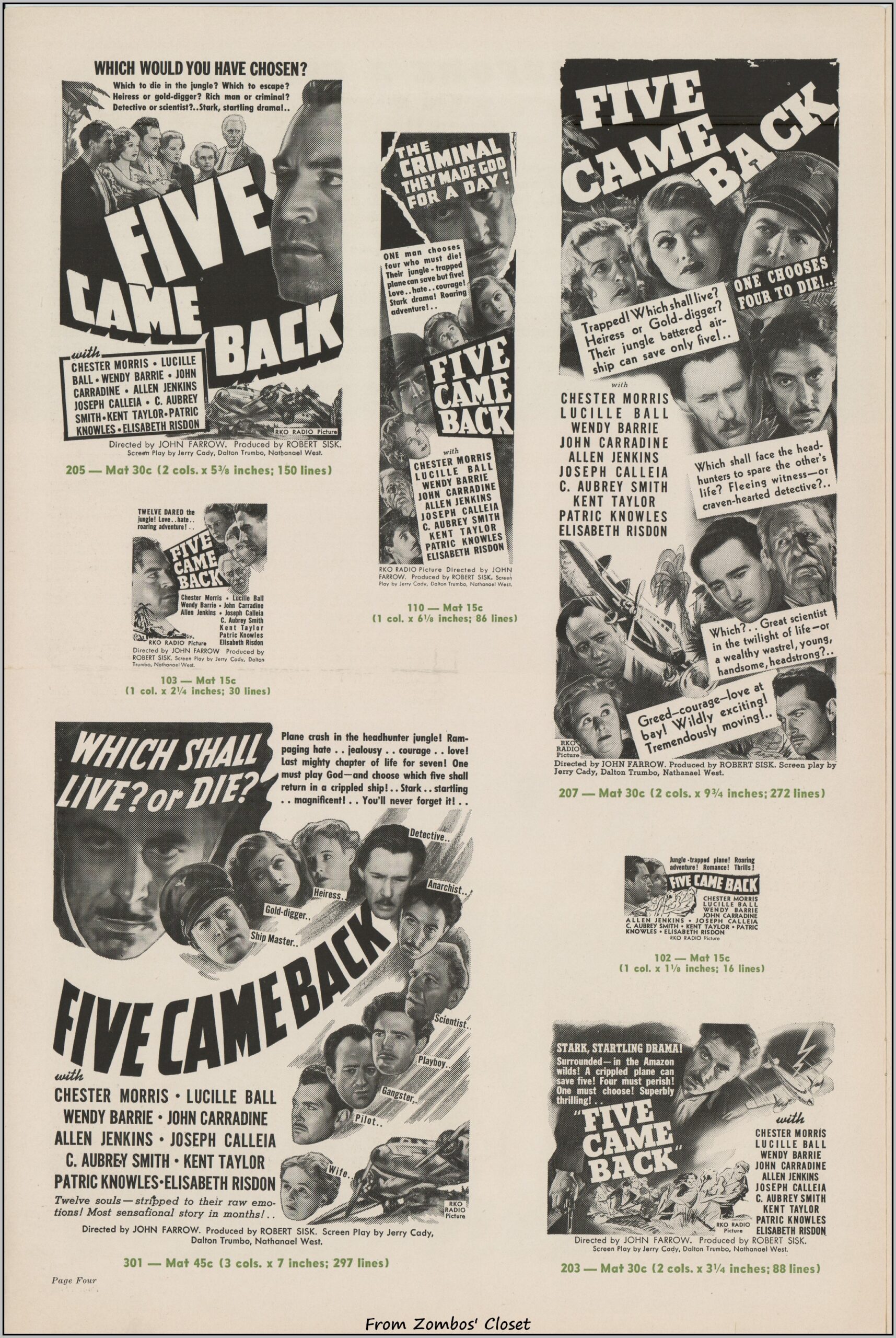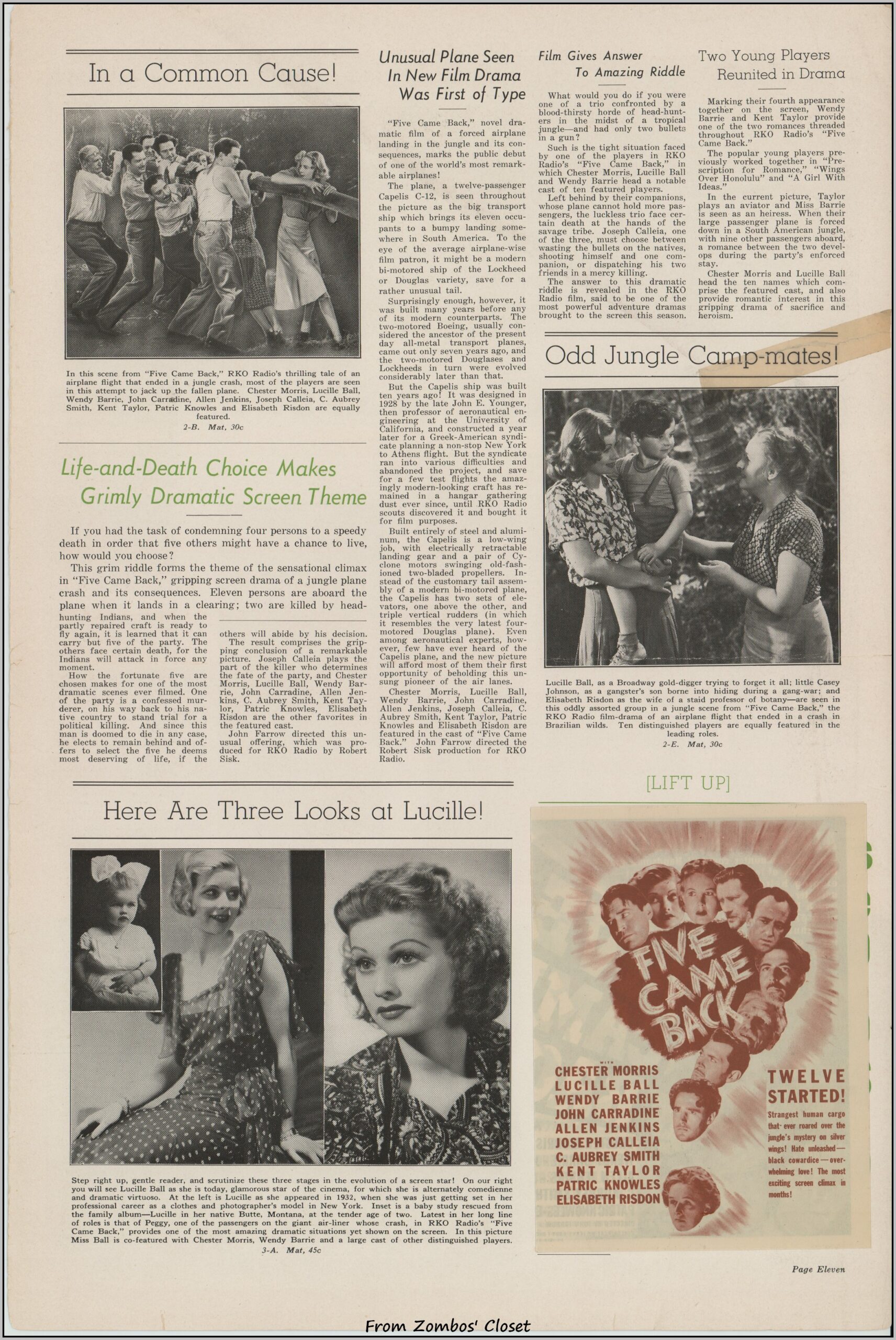 If you liked the original Star Trek episode The Galileo Seven, you can thank Five Came Back as the source (as noted in https://reactormag.com/star-trek-the-original-series-rewatch-the-galileo-seven/). This B movie presaged the disaster movies to follow as a group of airplane passengers are forced down into the Amazon Jungle. And what a group: Lucille Ball, Chester Morris, John Carradine, Aubrey Smith, Patric Knowles, Allen Jenkins, Wendy Barrie, and more. This pressbook belies the B movie status, as did the box office as the movie was a 1939 success. There is an inset herald (meaning it’s glued into the pressbook), Little Life Stories of the players, and lots of promotional ideas and articles. TCM’s article on the movie notes that Lucille Ball had a rough time of it during shooting. Between clashes with the director, Chester Morris’s unwanted advances, and two black spiders crawling onto her hair from one of the imported trees on set, she, at least, had the last laugh: critics singled out her performance. Even the New York Times liked the movie! What really grabbed me while watching it was the dialog and good use of a cheap budget. Click each image to enlarge, but due to WordPress’s automatic and asinine scaling of my images, I’ve included a download with larger images. Five Came Back Pressbook