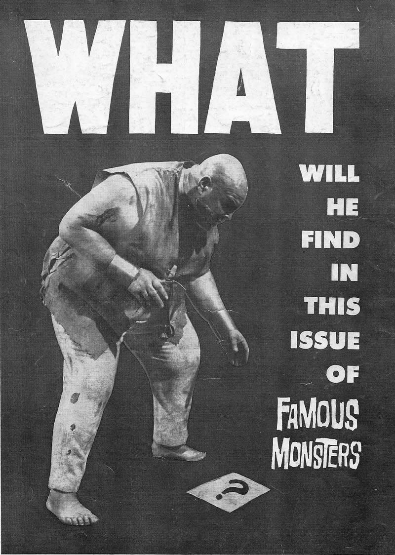 Before Warren Publishing realized the importance of advertising merchandise on their back covers, early issues of Famous Monsters of Filmland promoted the magazine with simple yet striking black and white pictures and text instead. From Professor Kinema's FM collection comes this visually effective promo using big Tor Johnson and big letters to ask the question…
