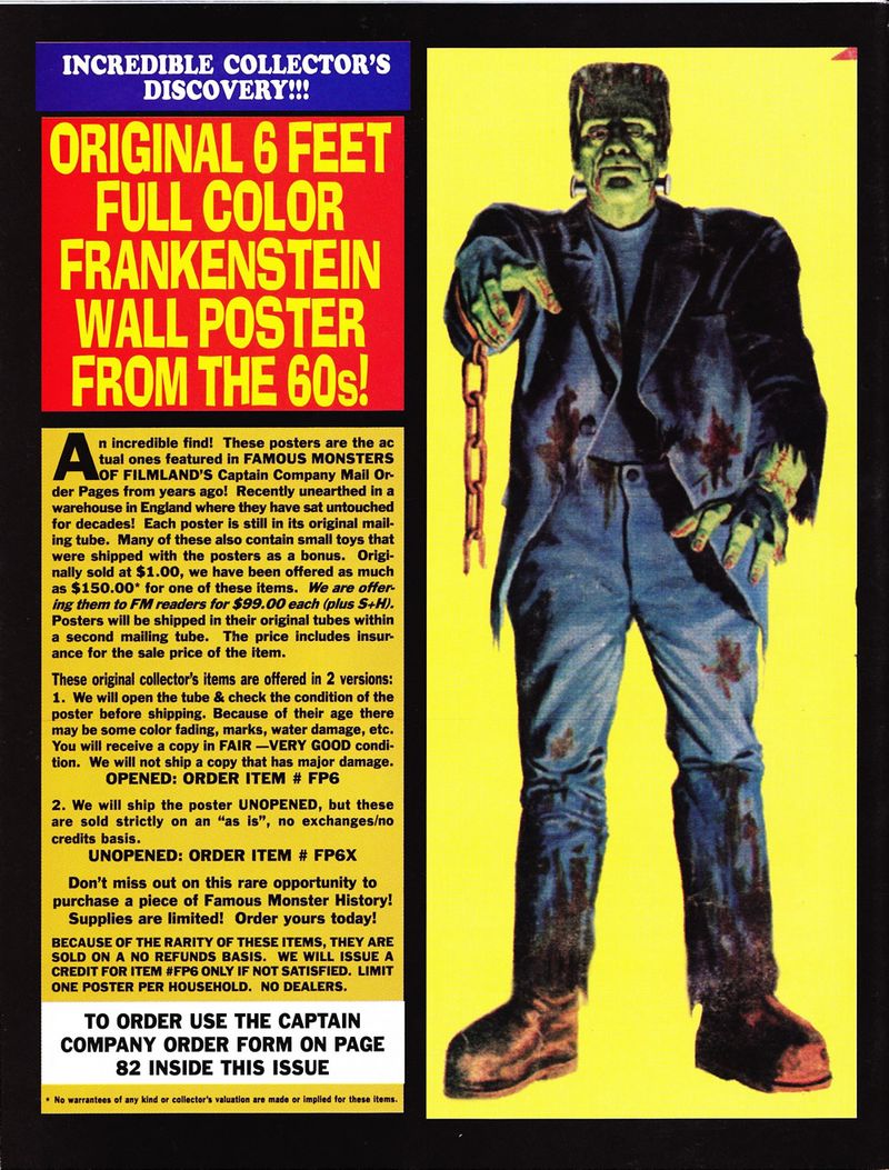 I had this 6 foot, full color Frankenstein wall poster back in the 1960s, when it first appeared. Along with the Dracula one, they stood guard over my precious monsterkid possessions, cleverly displayed all over my bedroom.
