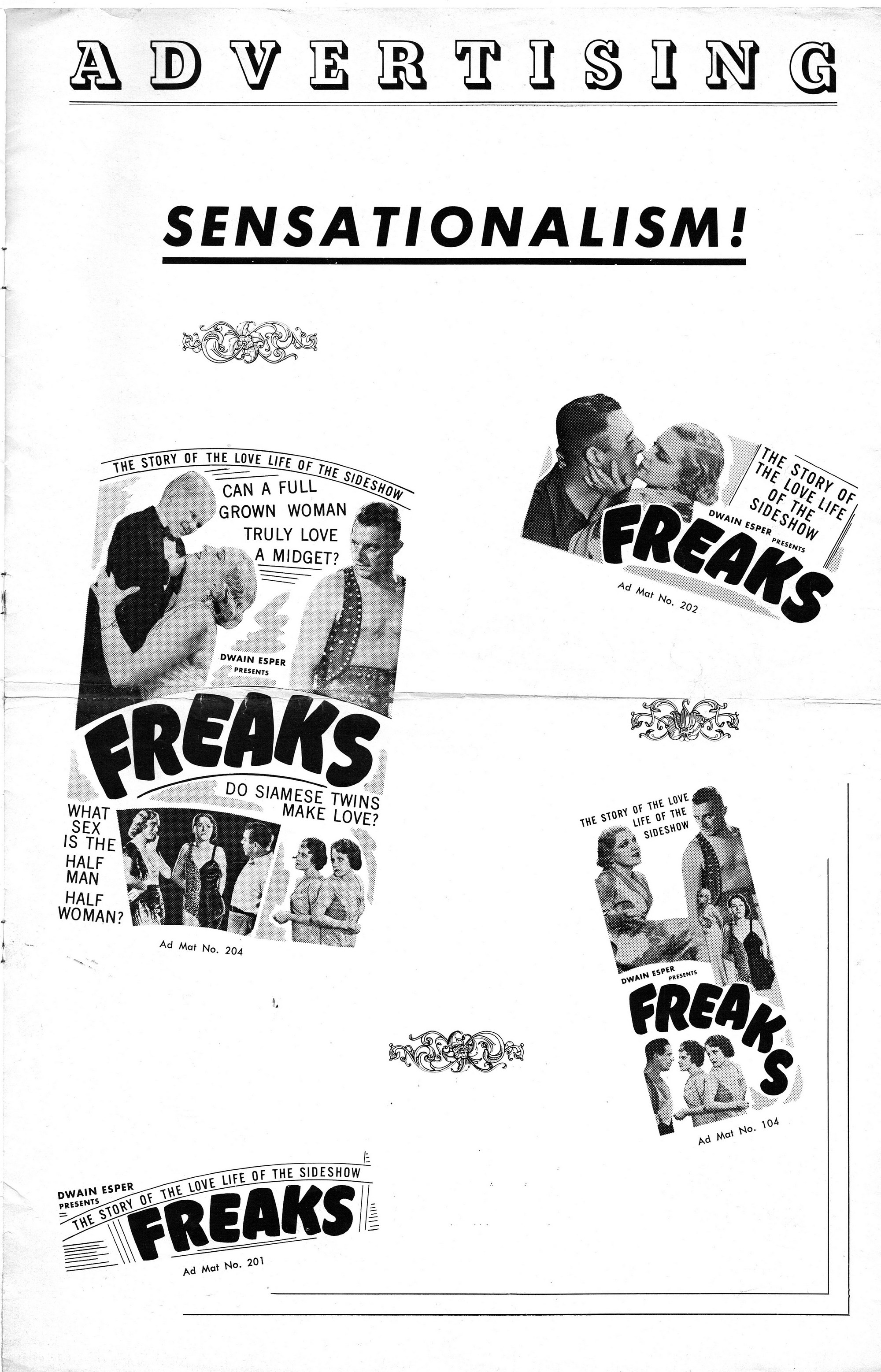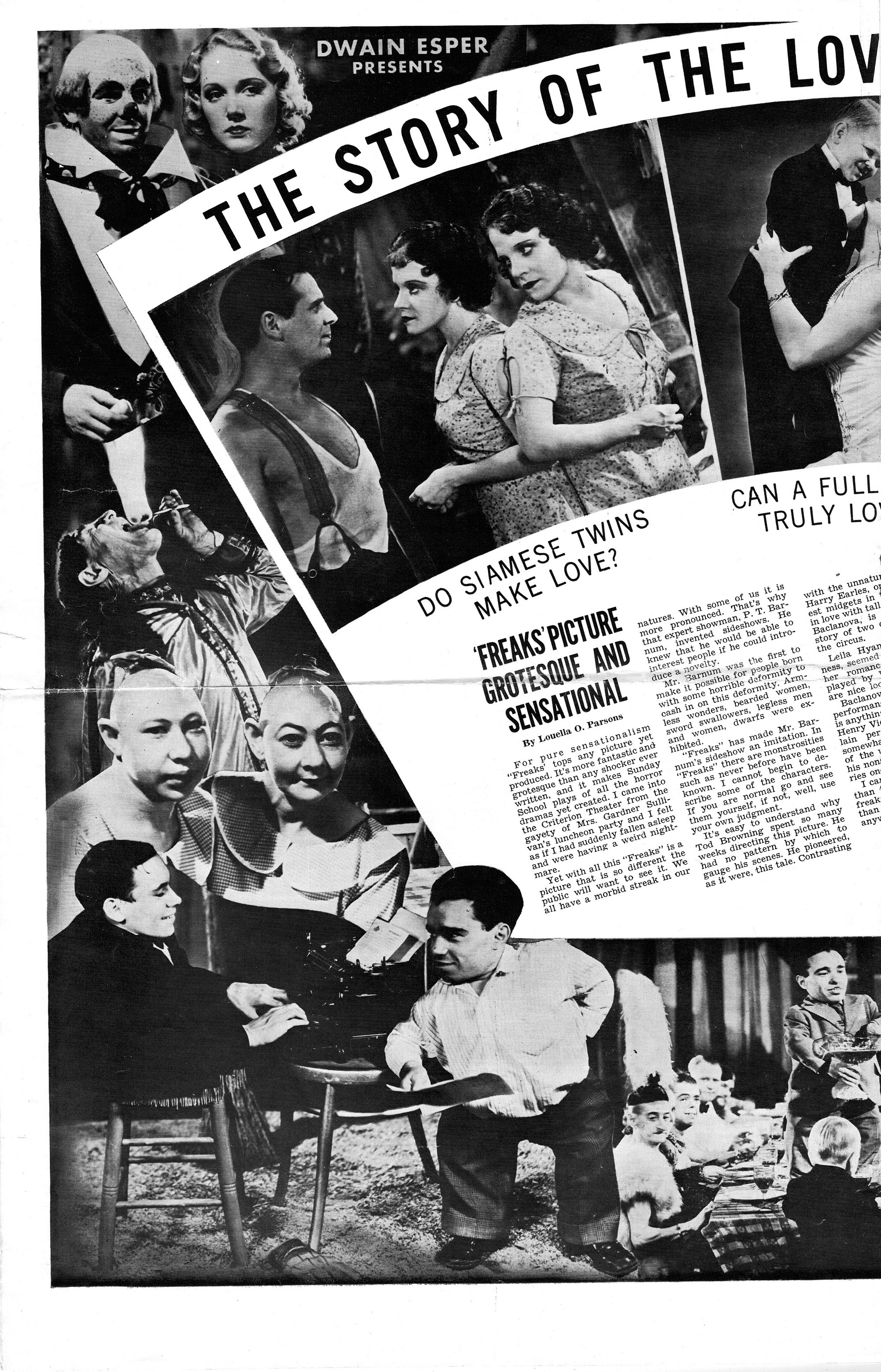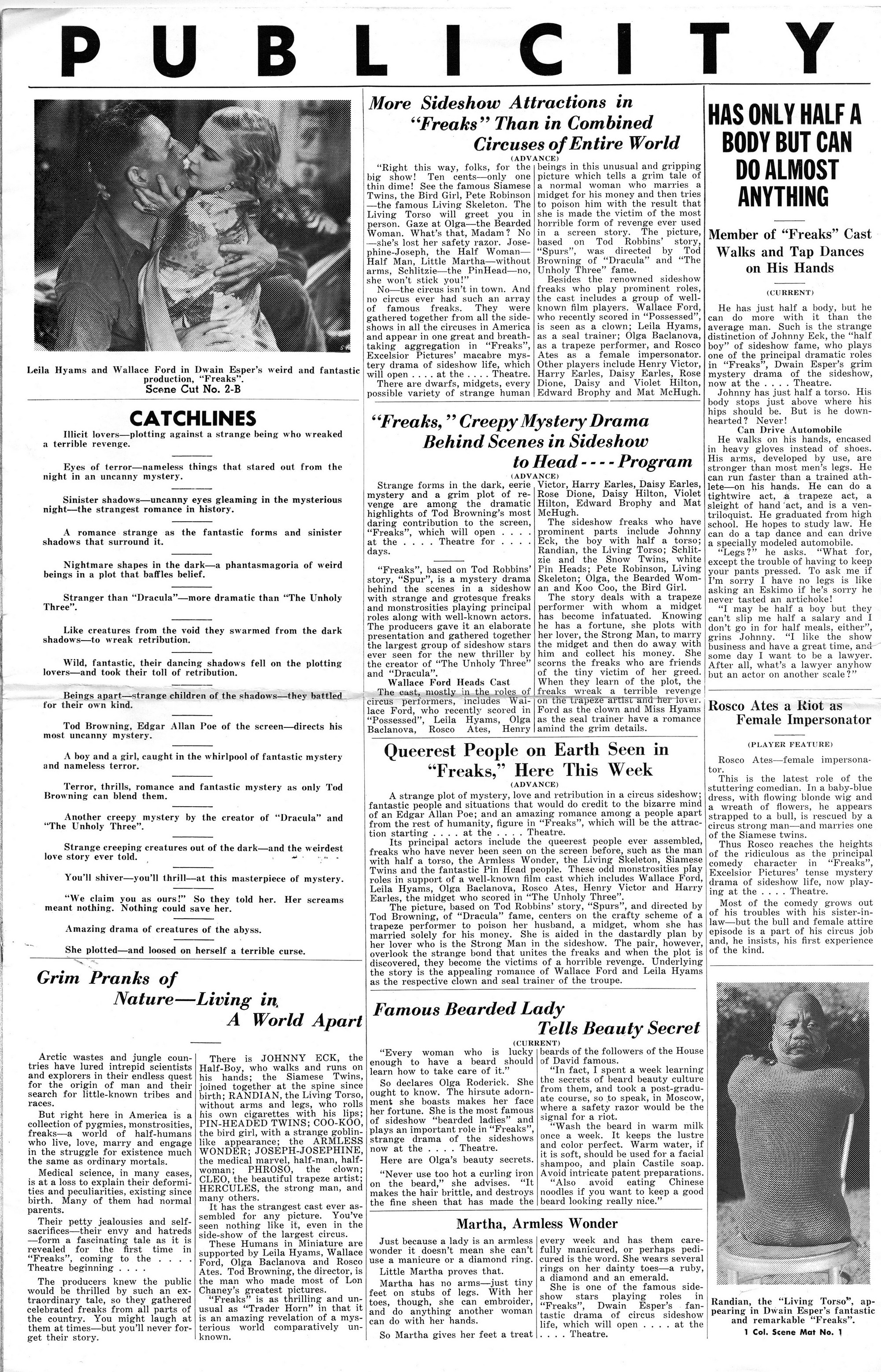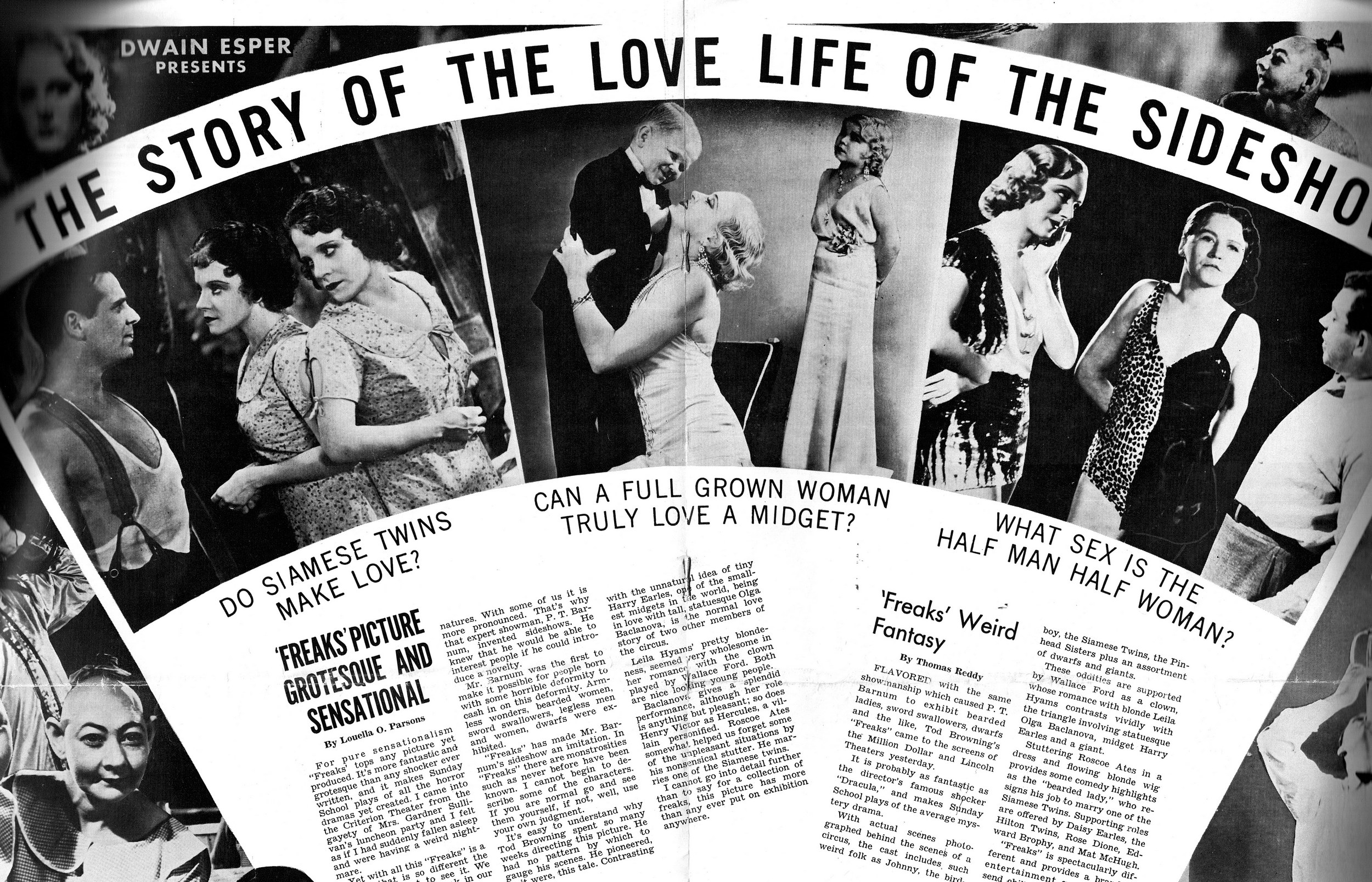 Tod Browning’s Freaks remains still freaky after all these years. Here’s the 1949 re-release pressbook. I’m surprised the studio had enough gumption to make audiences again squirm in their seats with another showing. This movie works its black magic by turning the monstrous, like a reflection in a mirror, back to the viewers. Browning made us uncomfortable because of our limitations, not those of the circus performers considered freaks because of their physical differences. A truly amazing movie, whose awkwardness from silent movie conventions and melodramatic performances only heightens its unnerving effect one feels after watching it.