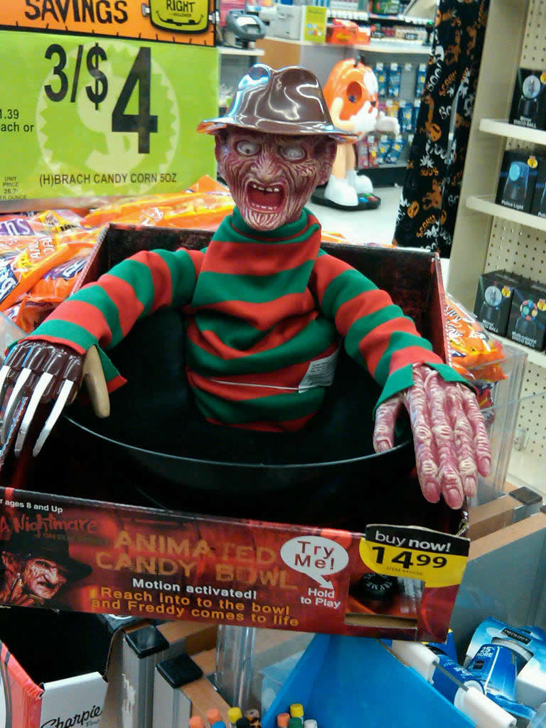 I don’t think you’ll have many kids reaching into this Nightmare on Elm Street Freddy Treat Bowl for candy. Yikes. Which is good if you’re running low. Walgreens’ also has a 6 foot hanging Freddy and a shrunken head Freddy. Take your pick. Looks like the copy editor for the packaging was scared away, too, or maybe they’re going for a stuttering-fear effect with “reach into to the bowl and Freddy comes to life.”