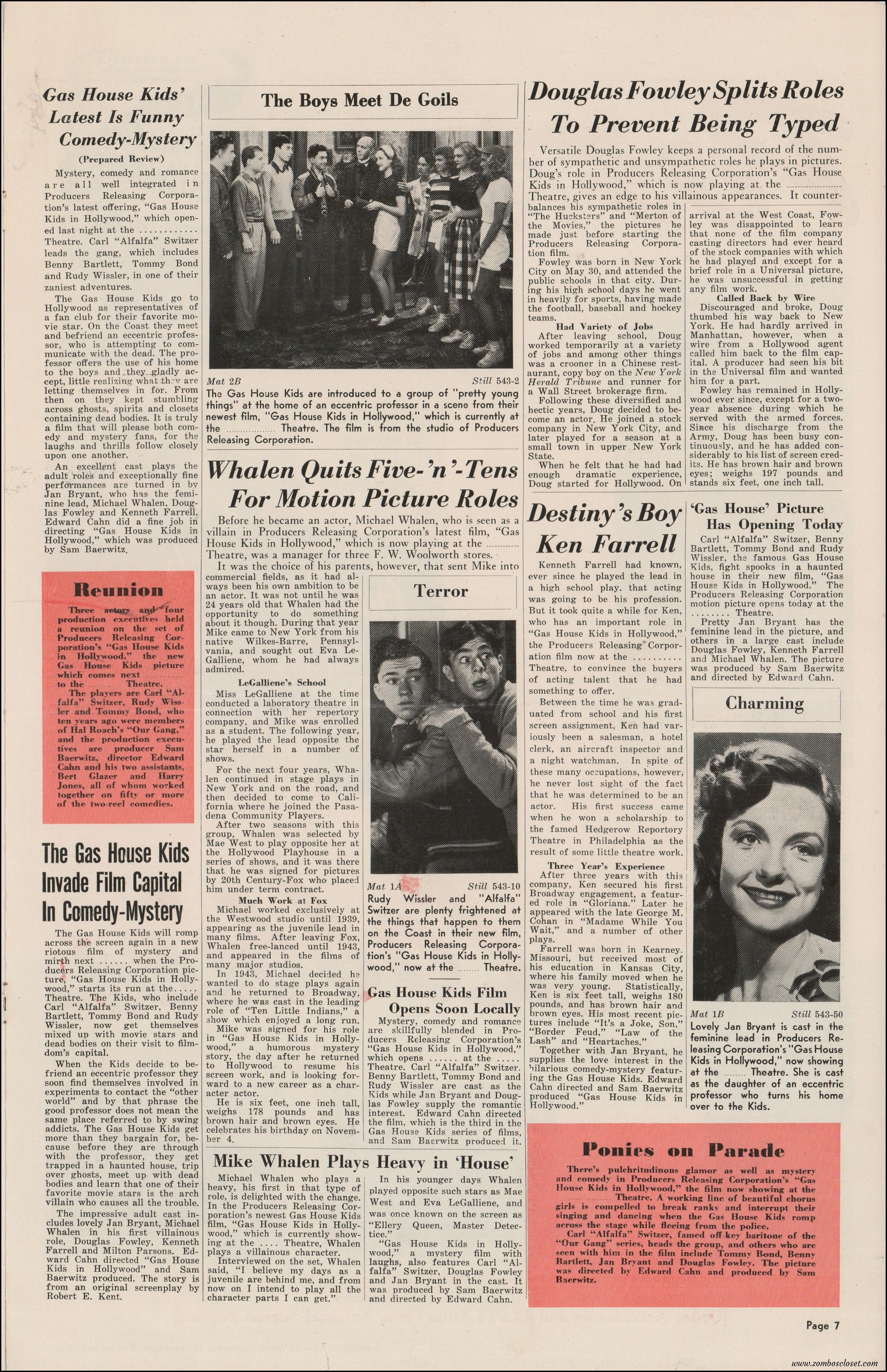 Alfalfa (Carl Switzer) and Butch the bully (Tommy Bond) from Our Gang are all grown up (mostly) in Gas House Kids in Hollywood. This is the third and last movie in the franchise. They mix it up with a mad scientist and a haunted house and cute “goils.”