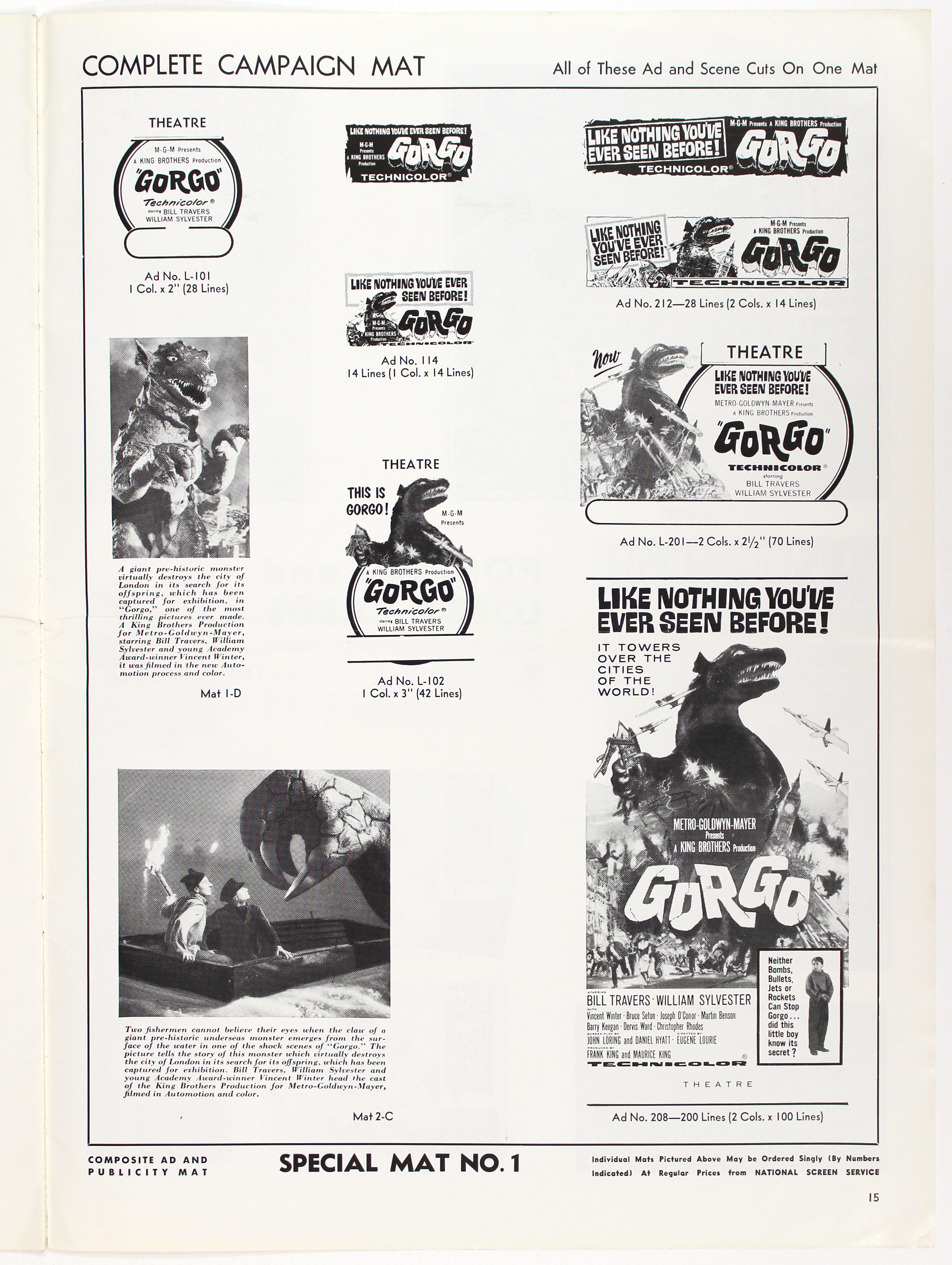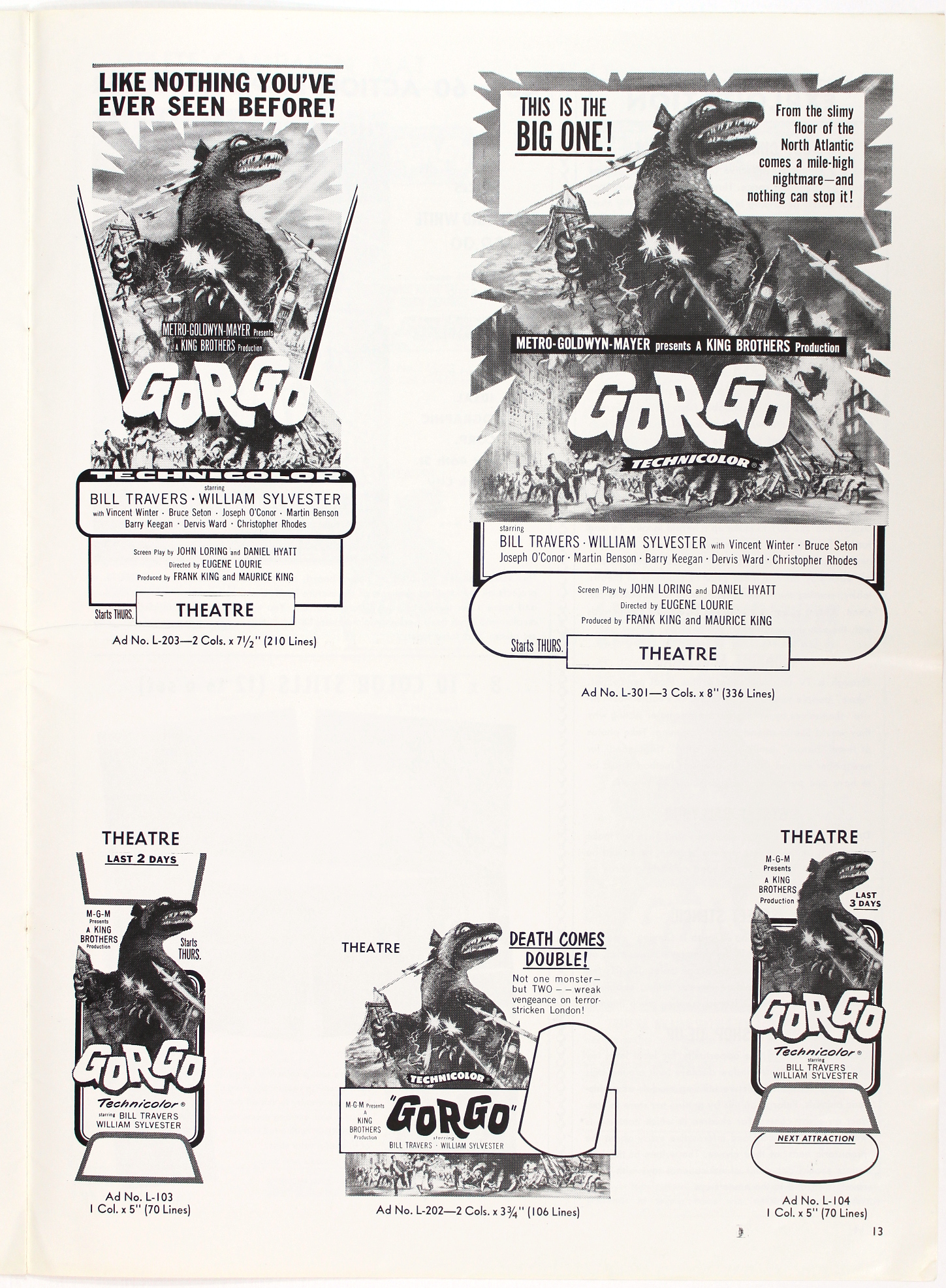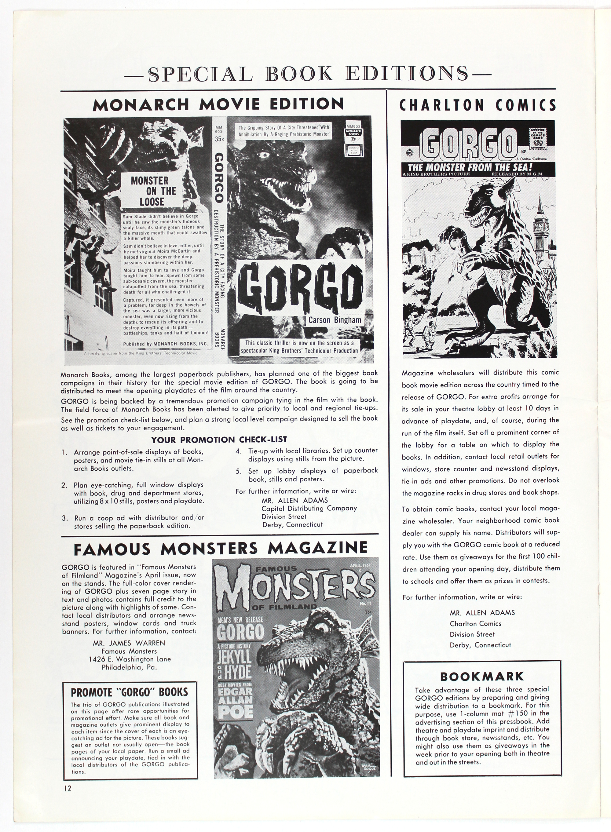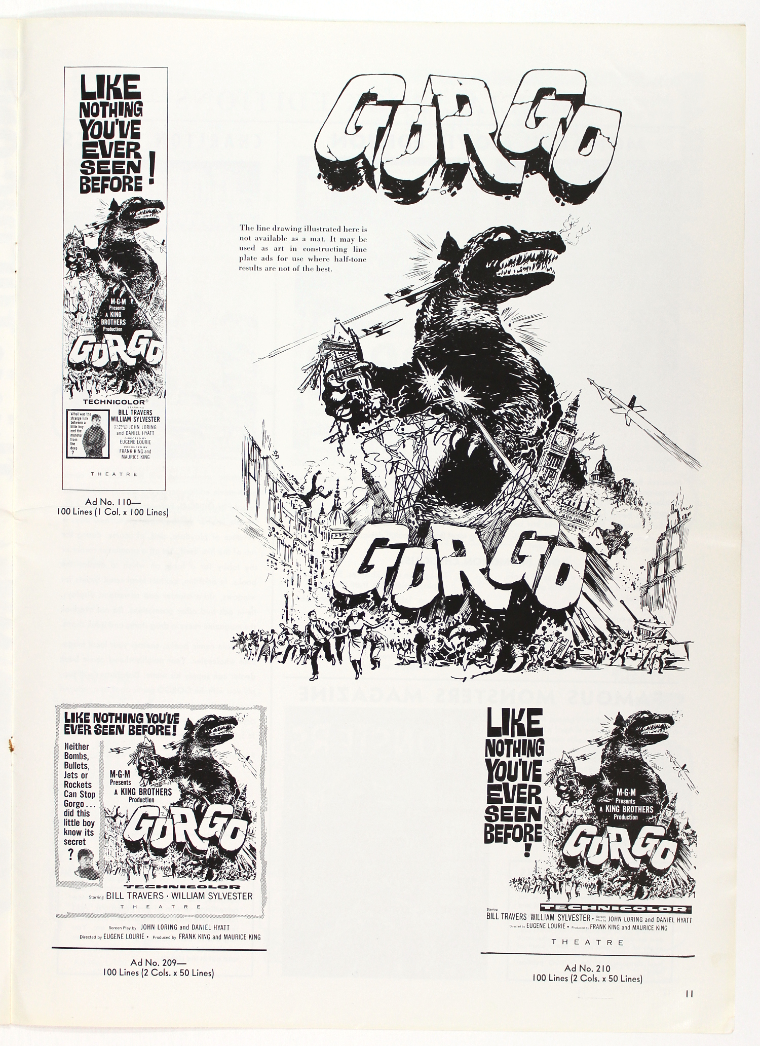Nice amount of promotional tie-in for Gorgo: see the Special Book Editions page for tie-ins to Famous Monsters of Filmland, Charlton Comics (I loved Charlton Comics!), and a movie novelization. Gorgo is one of the better Bs coming out of the 1960s mostly because of the storyline, with an appealing theme of a mom just wanting to protect her child. And what a big mother she is.