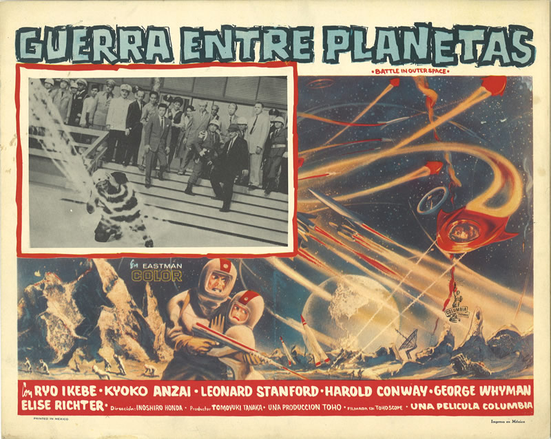 This lively Mexican lobby card depicts the male astronaut with mucho machismo while the cringing female astronaut clings to him for protection. The English language lobby cards are not as blatantly sexist. Pay close attention to their faces: she's looking at something that's making her fearful, but he's looking at her and firing his gun without aiming at what's scaring her. I'll leave it up to you more Freudian-centric readers to figure this one out.