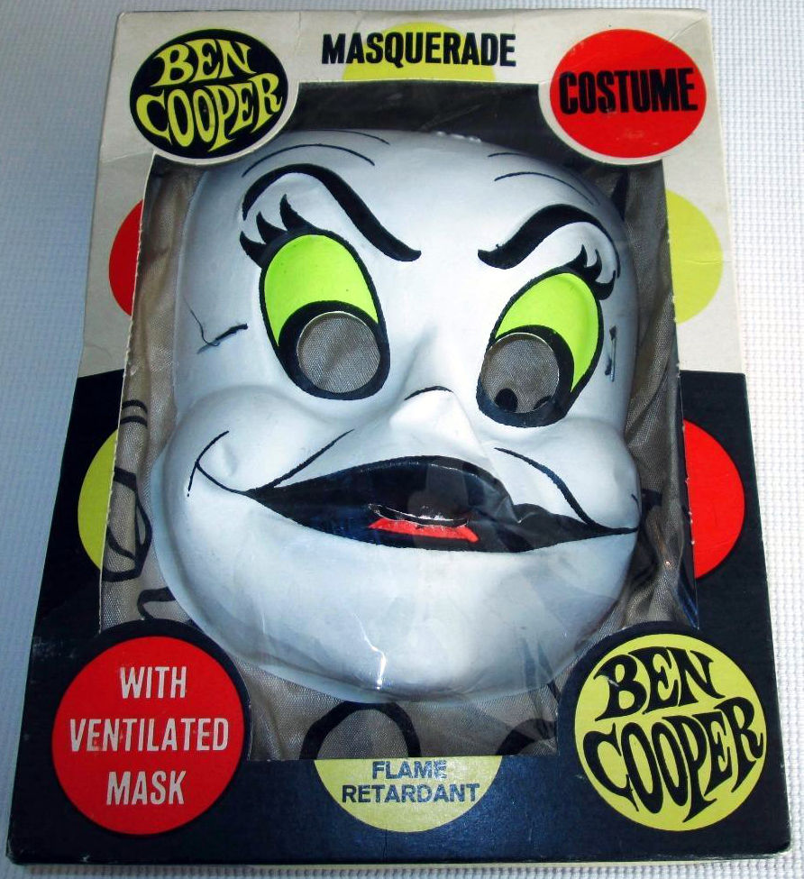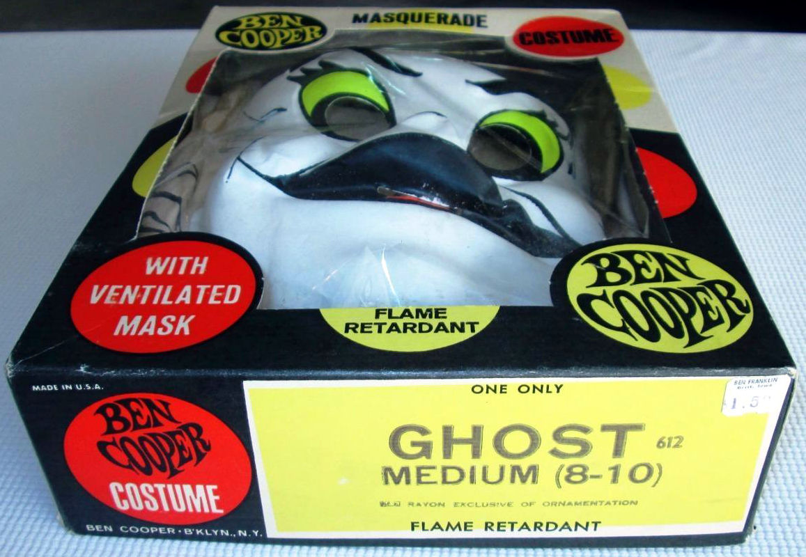 You'll see a bit of a similarity between another Ben Cooper Ghost costume and this Gus the Ghost version. The other ghost has the costume image in color, with slight alterations. Gus, here, looks a bit more naughty. I doubt the box the seller, bc3697, is listing this with is the original one: I say that because, usually when the costume is personalized with a name, that would appear on the box; so instead of just "Ghost" the box should read "Gus the Ghost." And that's one of the pitfalls of Halloween costume collecting: knowing if the costume is paired with its original box. And I don't mean to imply eBay sellers are doing it out of convenience. How many Halloween costume experts do YOU know?