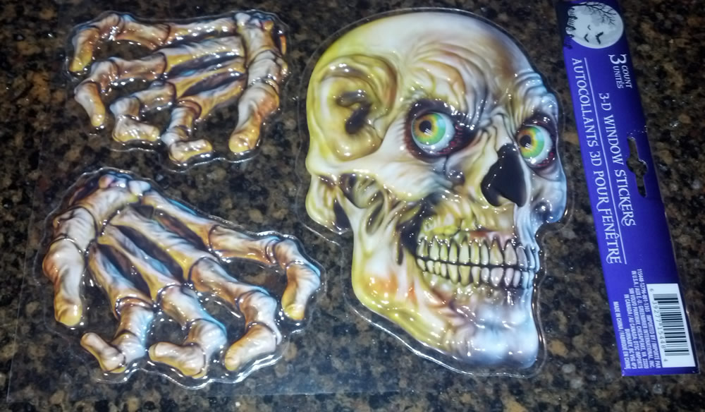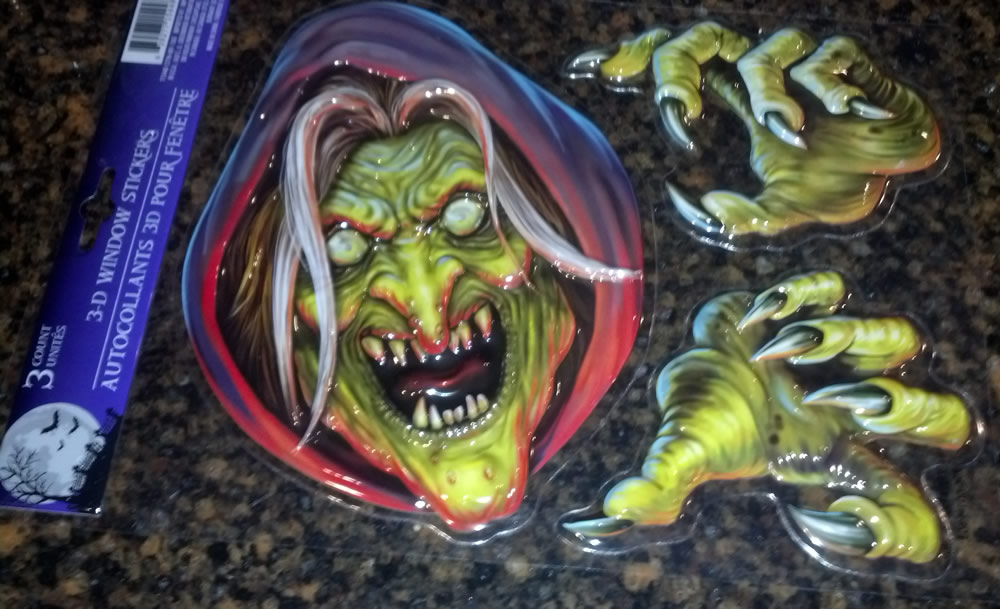 I saw these 3D window stickers at a Dollar Tree Store. Similar to the more humorous Halloween Pop Up Stickers I found there last year in design, these are pretty amazing in their serious monster art and dark mood. Other entries in this series included spiders, rats, etc. Would love to see these in a much larger format.