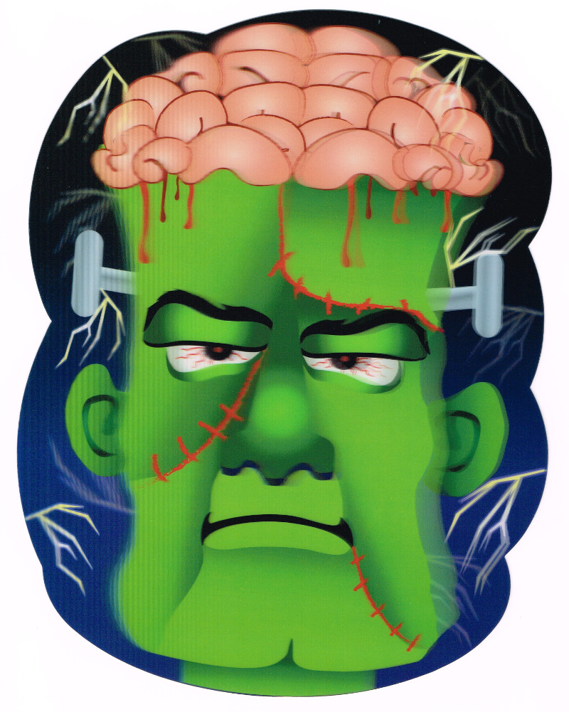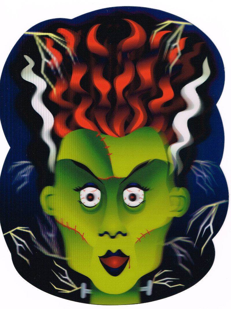 Once again, Dollar Tree Stores have some unique Halloween decorations. This year I found these lenticular monster faces. Lenticular means they’re holographic 3D, which is a really cool effect. Unfortunately you can’t see the 3D depth in these flat pictures, but they are impressive. Note that the Frankenstein Monster has his neck bolts NOT on his neck, and his Bride has neck bolts, even though she DOESN’T. I won’t even quibble about the exposed brain for Frankie. Still a treat to add to your Halloween collection.