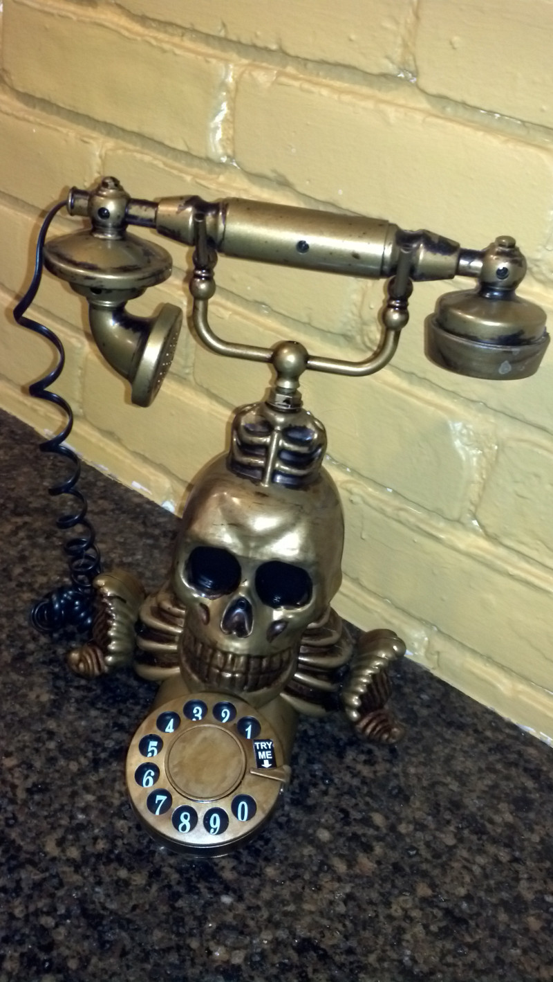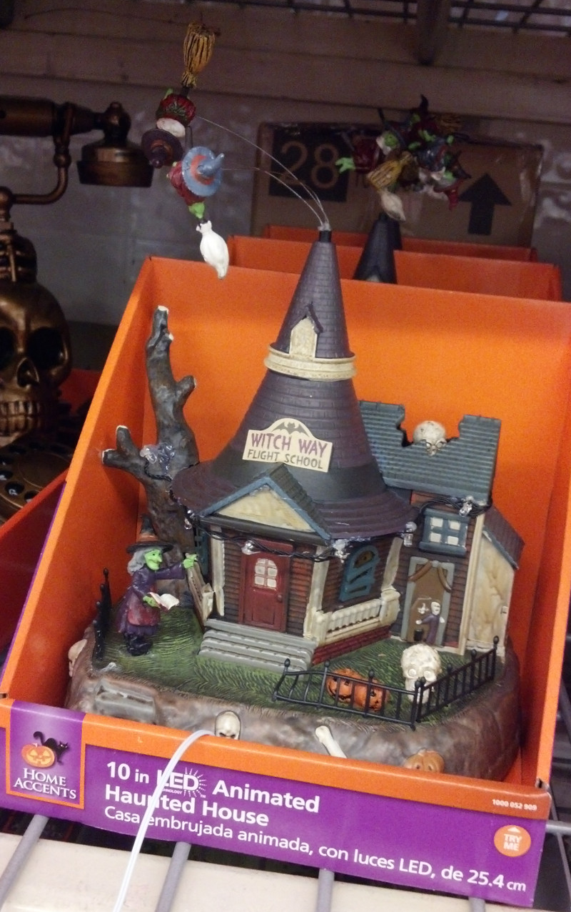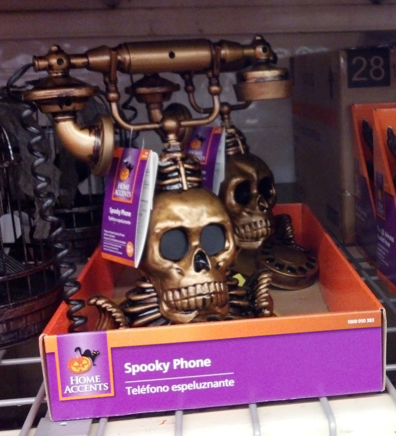 Found these entertaining Halloween treats at Home Depot today. The Spooky Phone is killer. Scary sayings when you pick up the handset (or set the sensor), and the eyes on the skull light up. The Witch Way Flight School lights up as the witches fly around overhead. The Chia Zombies are wild and cool looking enough to keep out all year long. Nicely made items and fun additions to your decorative endeavors.