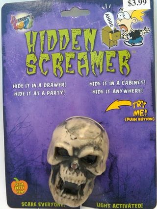 I picked these up today at Halloween City. There’s a suction cup in back. You stick them in places like a drawer, cabinet, tool box–any place where sudden light can trigger the screaming. Nothing like the old sneak up and scare approach for festive Halloween fun, I say. I like the cat the most, but the skull’s sinister enough.