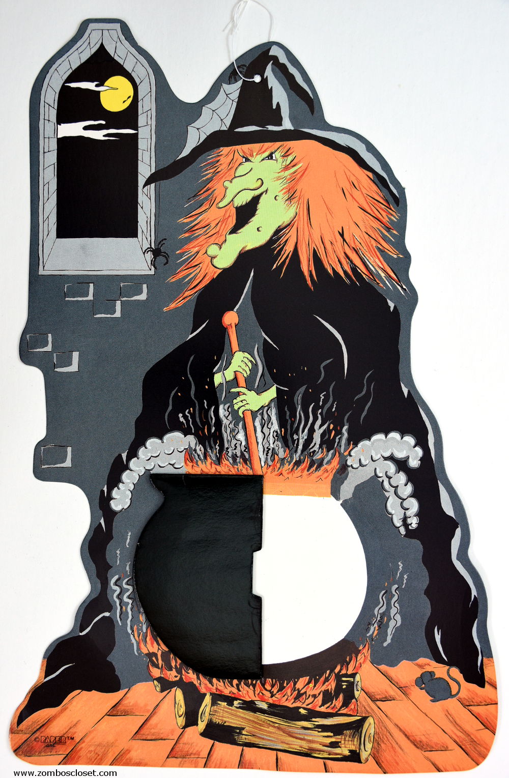 This is a simple Halloween witch with honeycomb cauldron from Paper Art. While you could tape it to a wall and show one side, it's really meant to be hung so both sides of the honeycomb cauldron, and witch, can be seen. The style is neither here nor there, and seems about right for a 1970s to 1980s approach to Halloween decorations: more child friendly and cheaply printed.