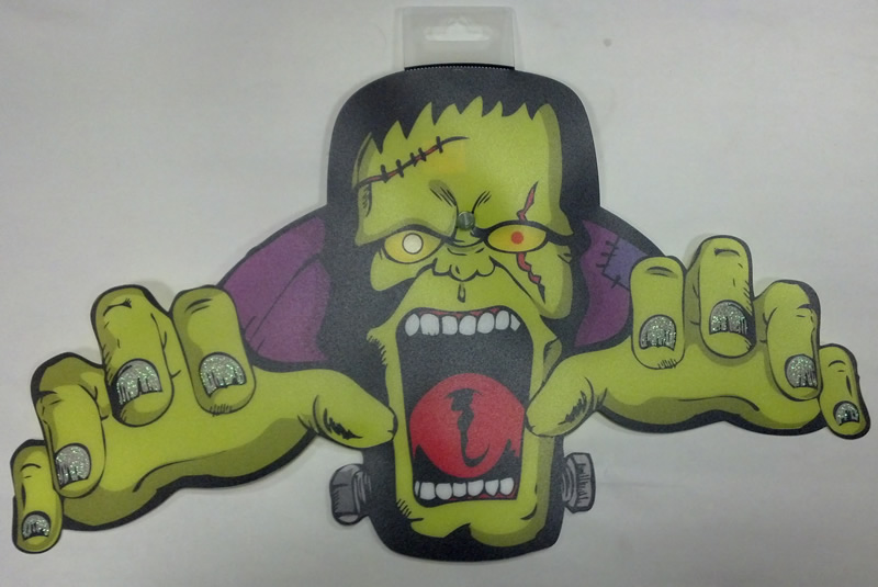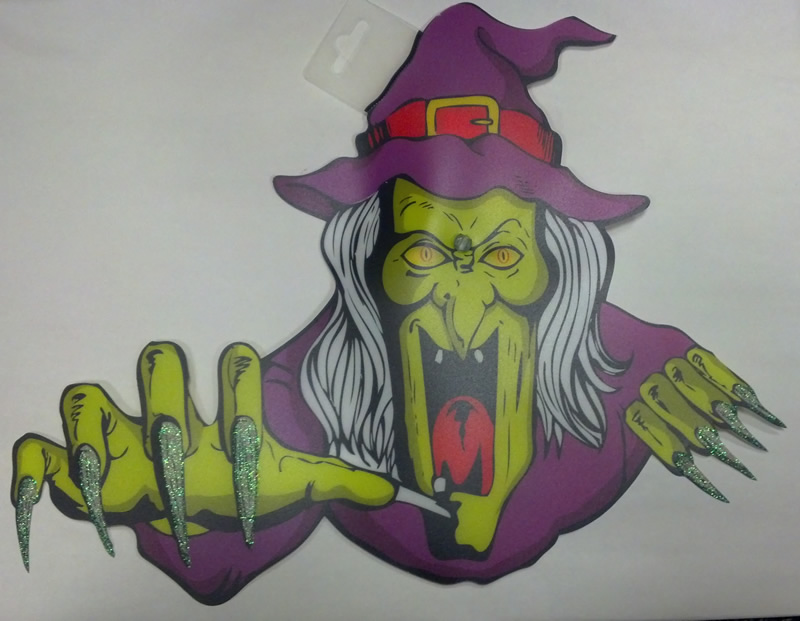 Spotted these at the local discount store. They're flexible thin plastic, with a small suction cup in back to stick on mirrors, windows, etc. I like the glitter on the fingernails and the cartoon design. Not too cute, not too scary, so it should appeal to just about any Halloween lover. There is no manufacturer information printed on it.