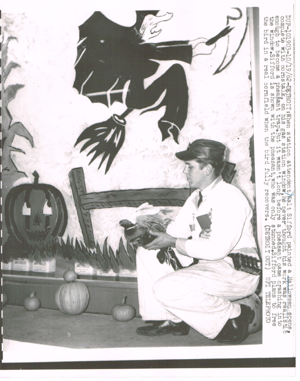 10/19/62 — Detroit: When station attendent Walt Sifford painted a Halloween scene, complete with cornstalk, on his gas station window, he never thought his work was realistic enough to become a pheasant trap. But it wasn't long before a pheasant came crashing into the window. Sifford is shown with the pheasant, who was only stunned. Sifford plans to free the bird in a real cornfield when the bird fully recovers.