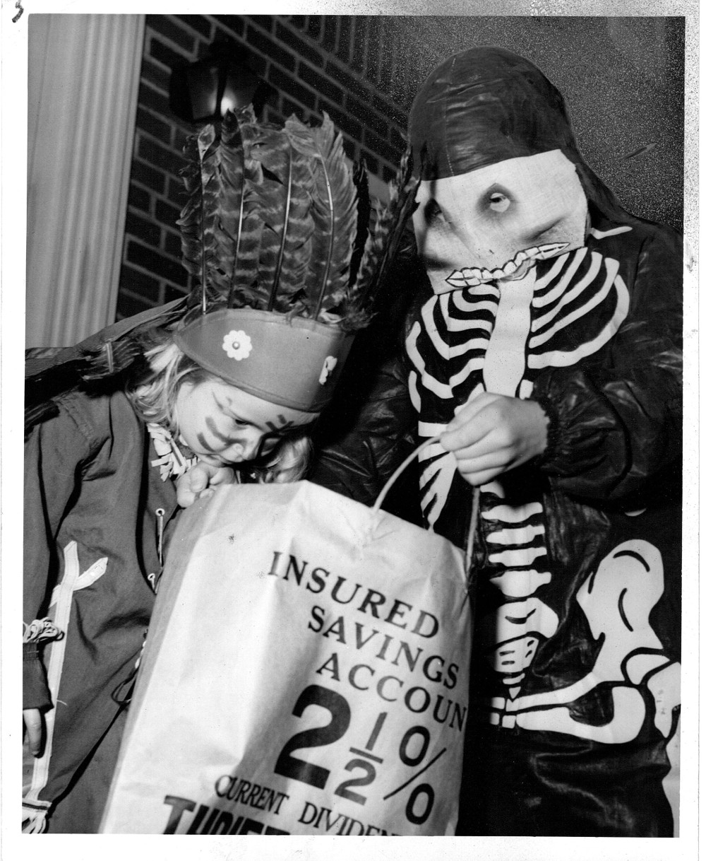 From Cleveland Press, October 31st, 1950 (photo by Glenn Zahn)–Joey and Janey Skittles are paralyzed with uncertainty as to what to eat first: Left Twix or Right Twix; sadly not realizing that their hard earned 2.5% savings account dividends would be swallowed up by the Great Recession in the future, making the flimsy Twix marketing conceit pale in comparison.