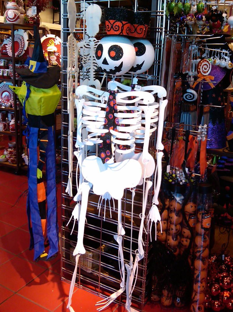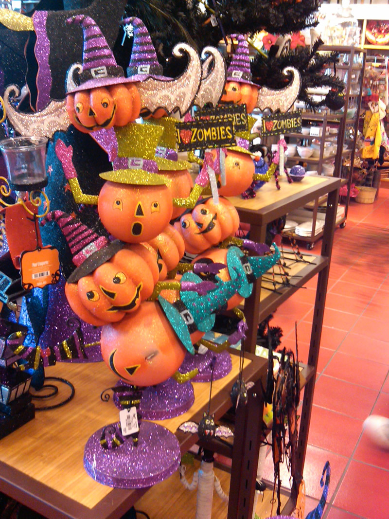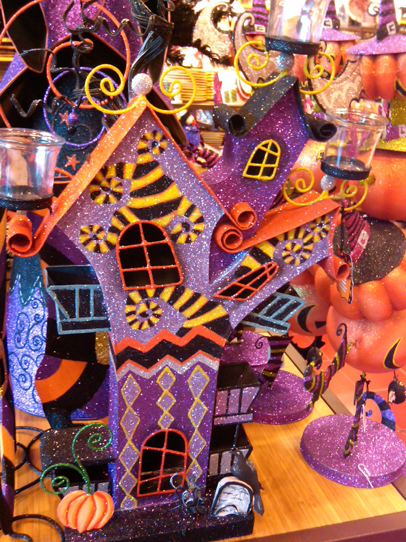 Here are Beetlejuice-snazzy Halloween decorations at Pier 1 Imports. The skeleton appears to be light metal and is 5 feet or so tall, and the haunted house and pumpkins' totem are sparkly rad. Their burst of candy colors makes them very stylish for trendy urban decors. Makes me wish they were edible.