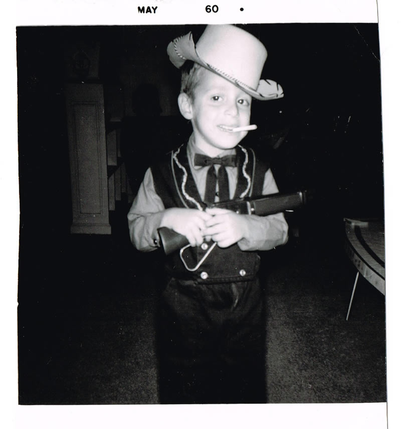 Here’s me at the tender age of 4 in 1960, getting ready for Halloween. Sure, it may only be May, but it’s never too early to try on your costume to make sure it fits just right. That big rifle I’m holding (well, relatively speaking, of course) was a sick-kid present (chickenpox). I loved it. I hated it. Every time I pulled the lever down and back up it pinched my finger badly. But I kept playing with it and shooting bad guys, monsters, and creepy shadows until my finger hurt too much. I like to remember it as a teachable life-moment. And after all those candy cigarettes I never did take up smoking. I do eat a lot of candy, though.