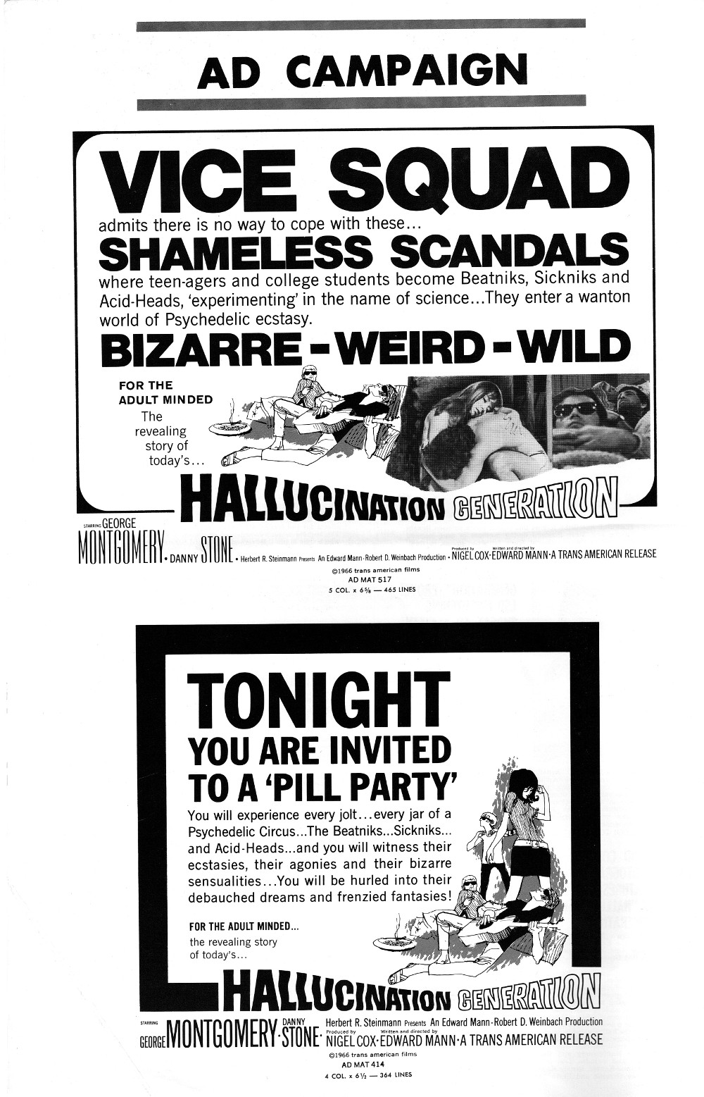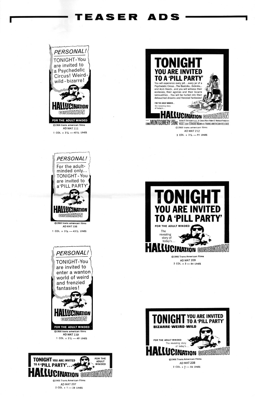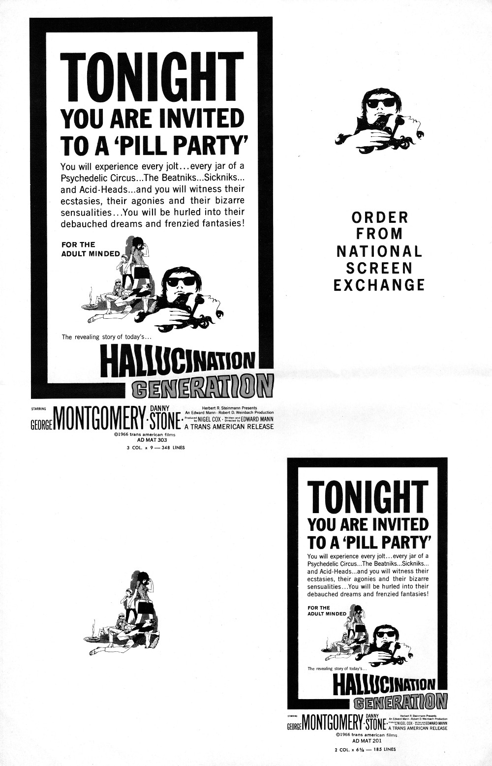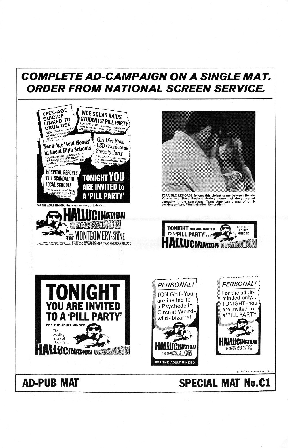 Need to see some exploitation cinema? Here you go, you counterculture Sicknik. LSD scenes are in color. Wow. (Comic reader version: Download Hallucination Generation Pressbook.)