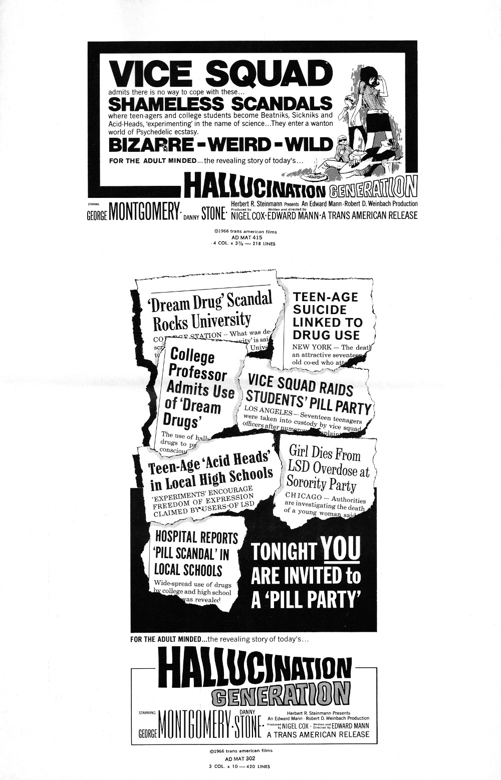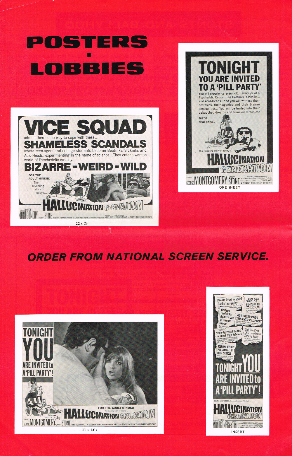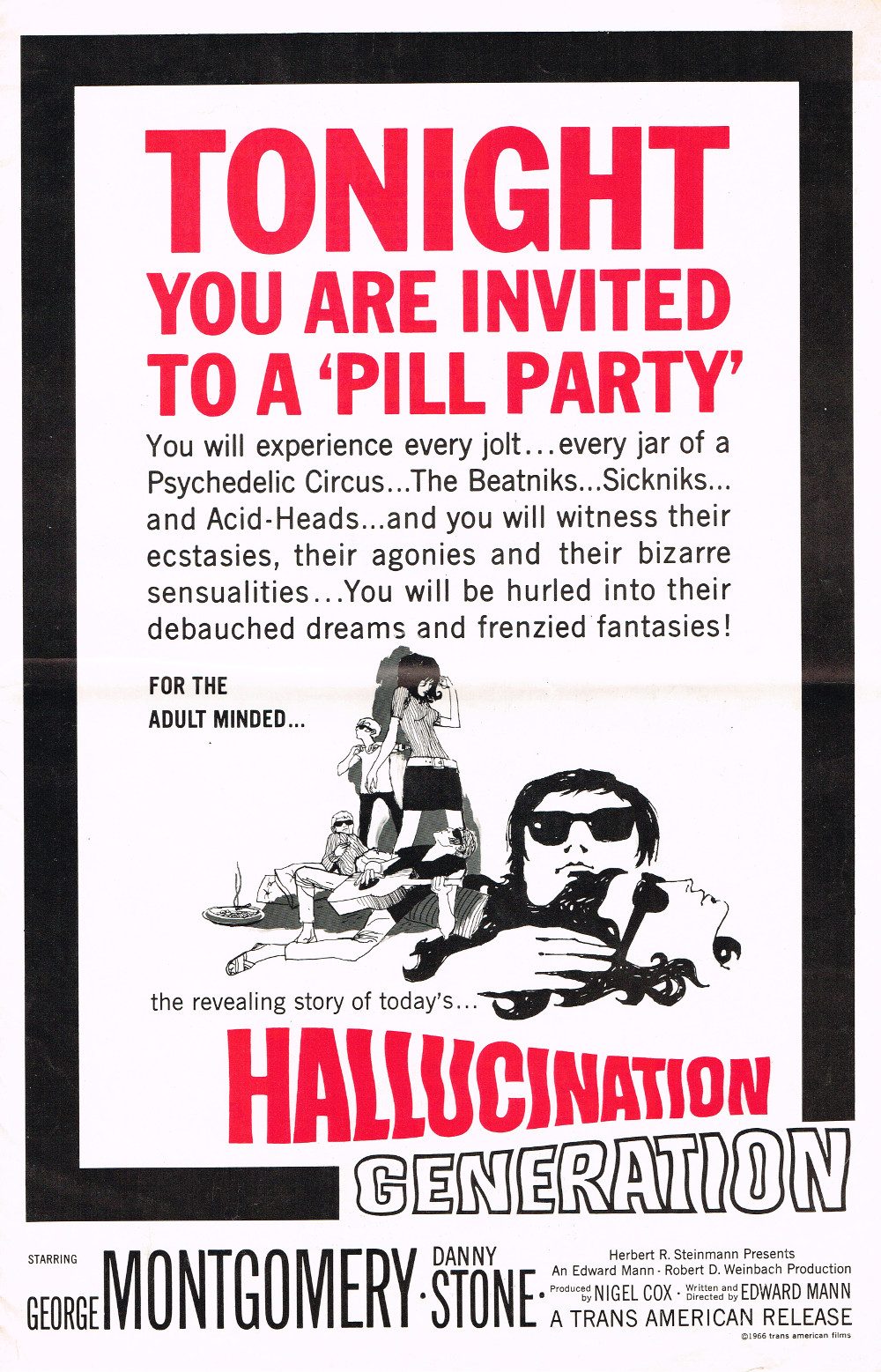 Need to see some exploitation cinema? Here you go, you counterculture Sicknik. LSD scenes are in color. Wow. (Comic reader version: Download Hallucination Generation Pressbook.)