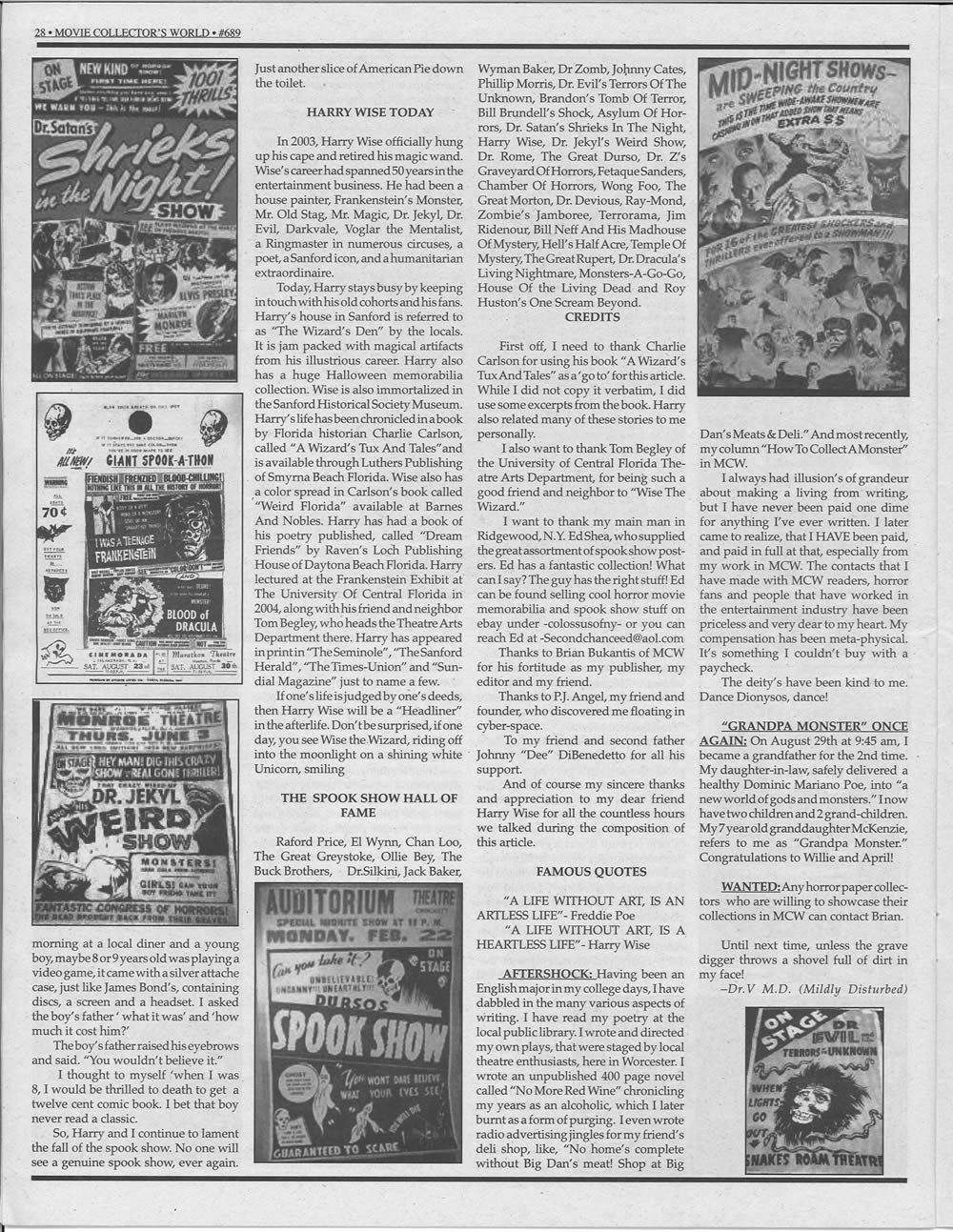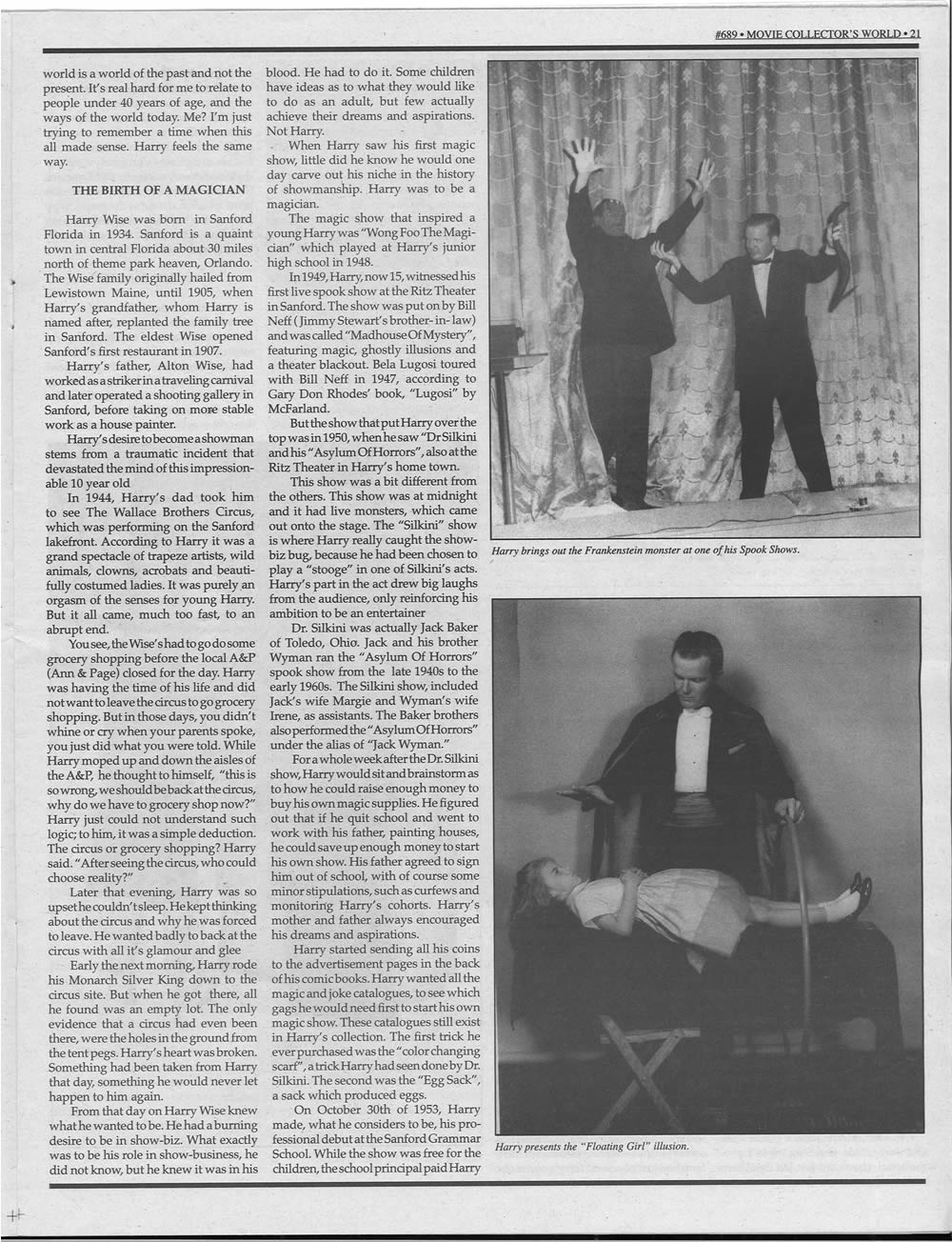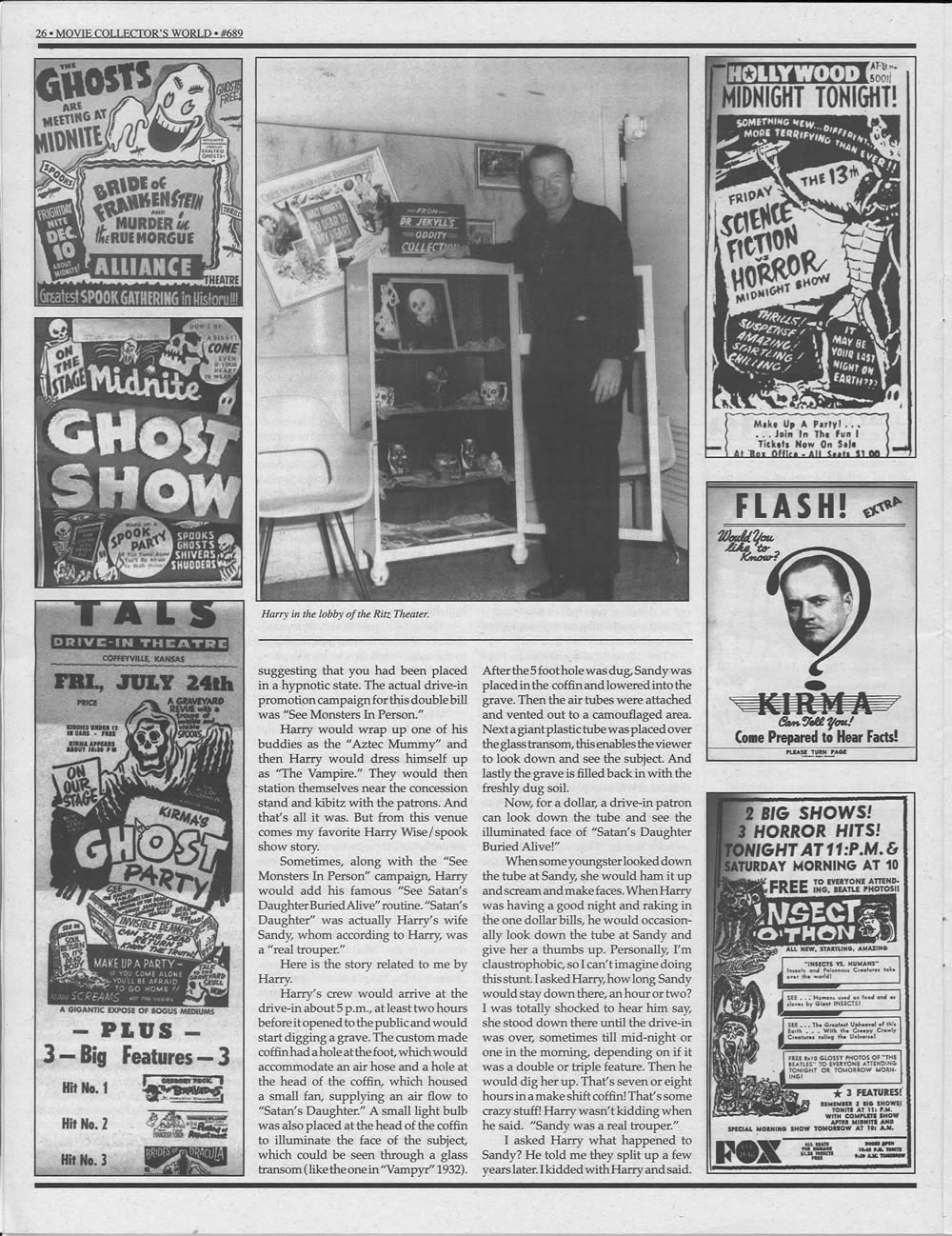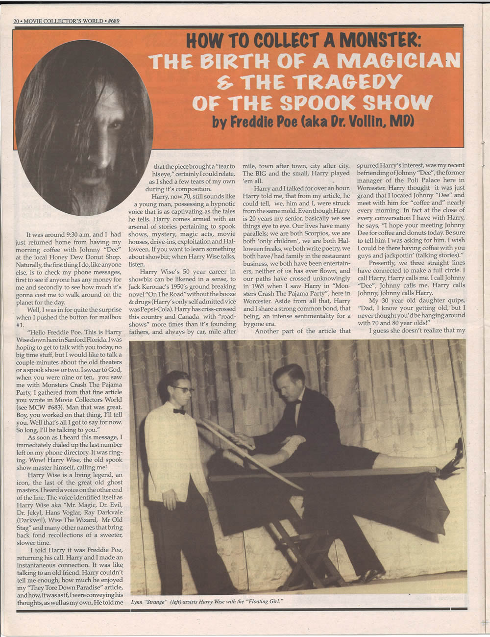 How to Collect a Monster: Harry Wise and the Lost Art Of Spook Shows Leave a Comment / Magazine Morgue / By JM Cozzoli With permission from Arena Publishing and Dr. Vollin, MD (aka Freddie Poe), here's How to Collect a Monster: The Birth of a Magician and the Tragedy of the Spook Show, from Movie Collector's World, issue 689, November 2005. Like this:Like Loading... Share this post Facebook Twitter Pinterest Linkedin