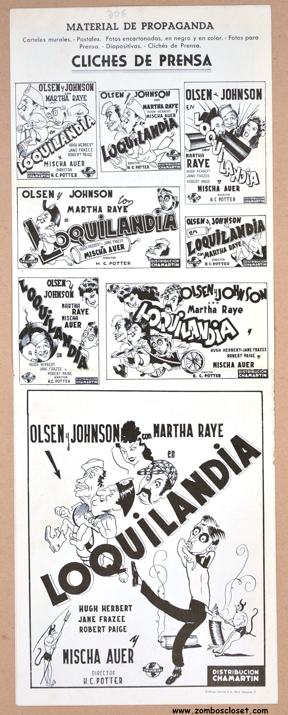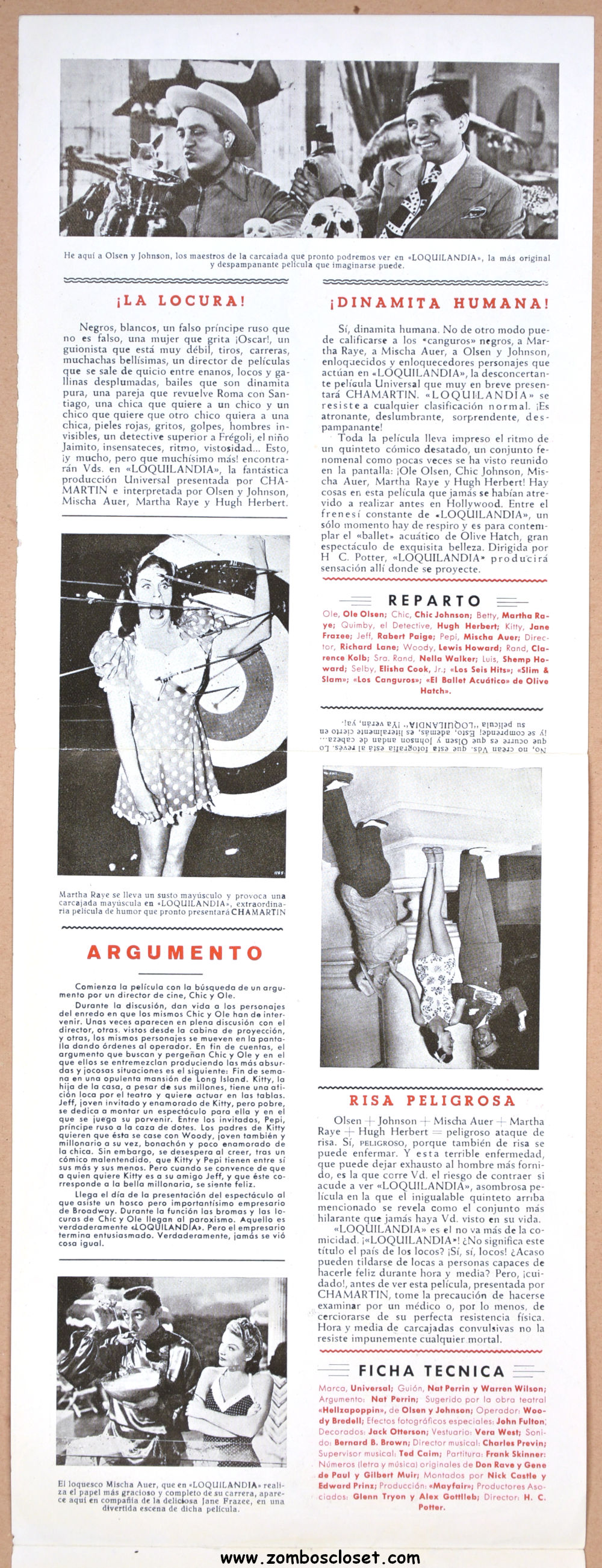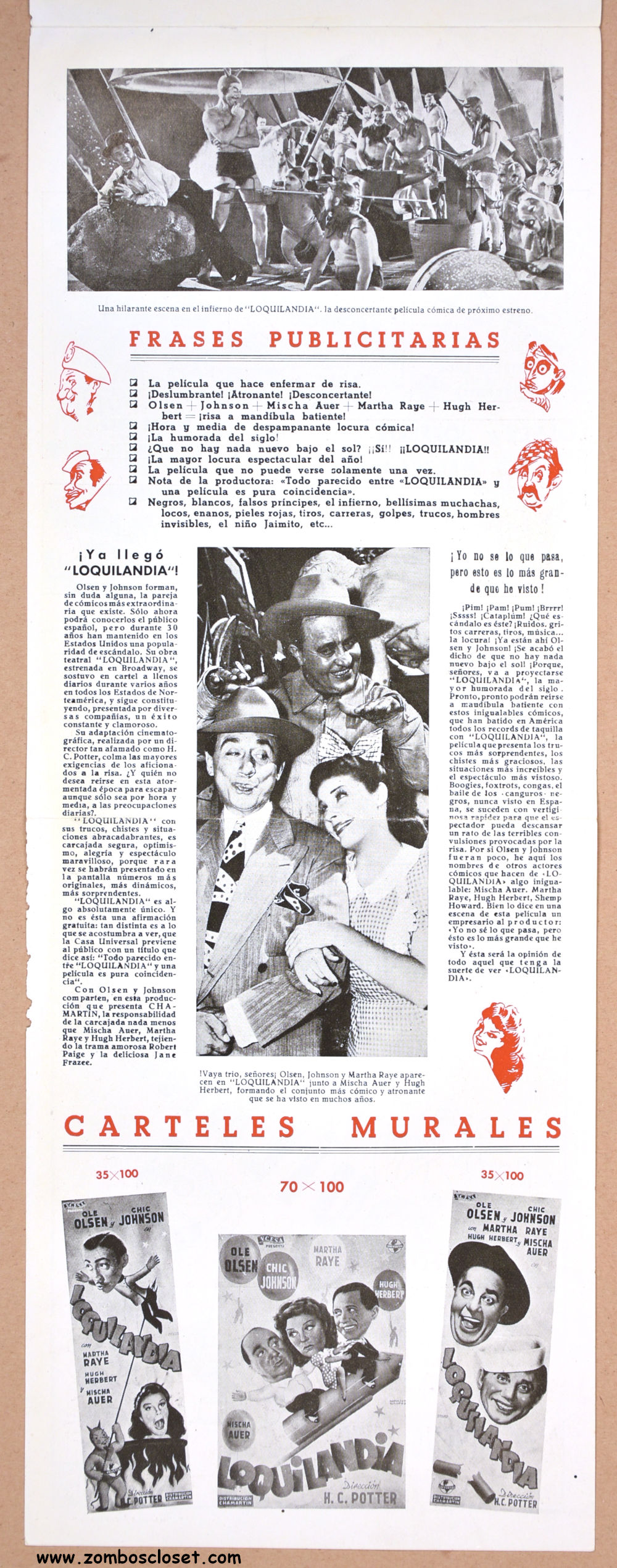 The format of this Spanish pressbook for Olsen and Johnson’s zany Hellzapoppin compelled me to add it to my collection. Their comedy was brash, insulting, crazy, and non-stop fast. They covered it all: vaudeville, radio, theater, television, and film. The wild cover art and long, slim appearance of this pressbook pays tribute to their unique style.