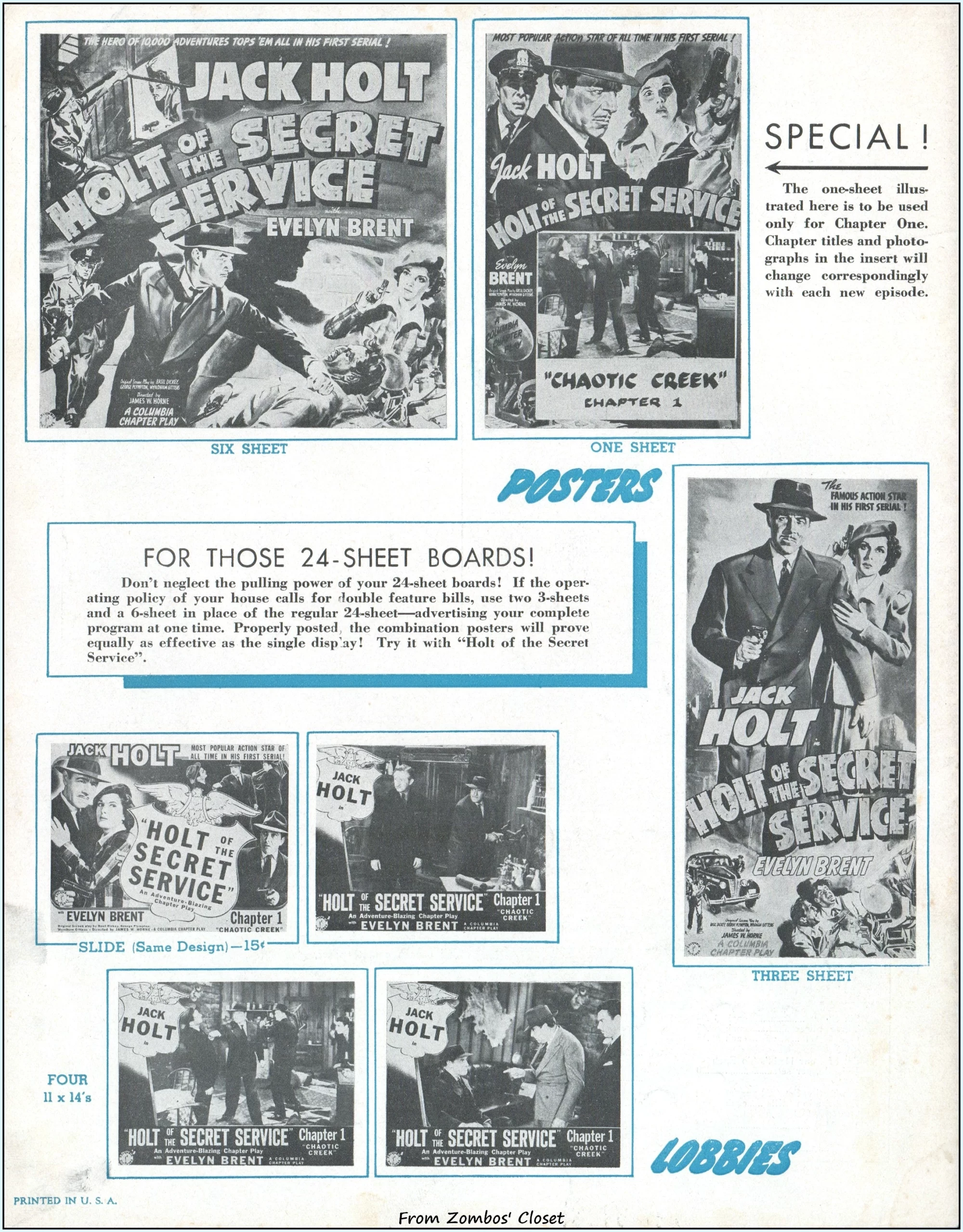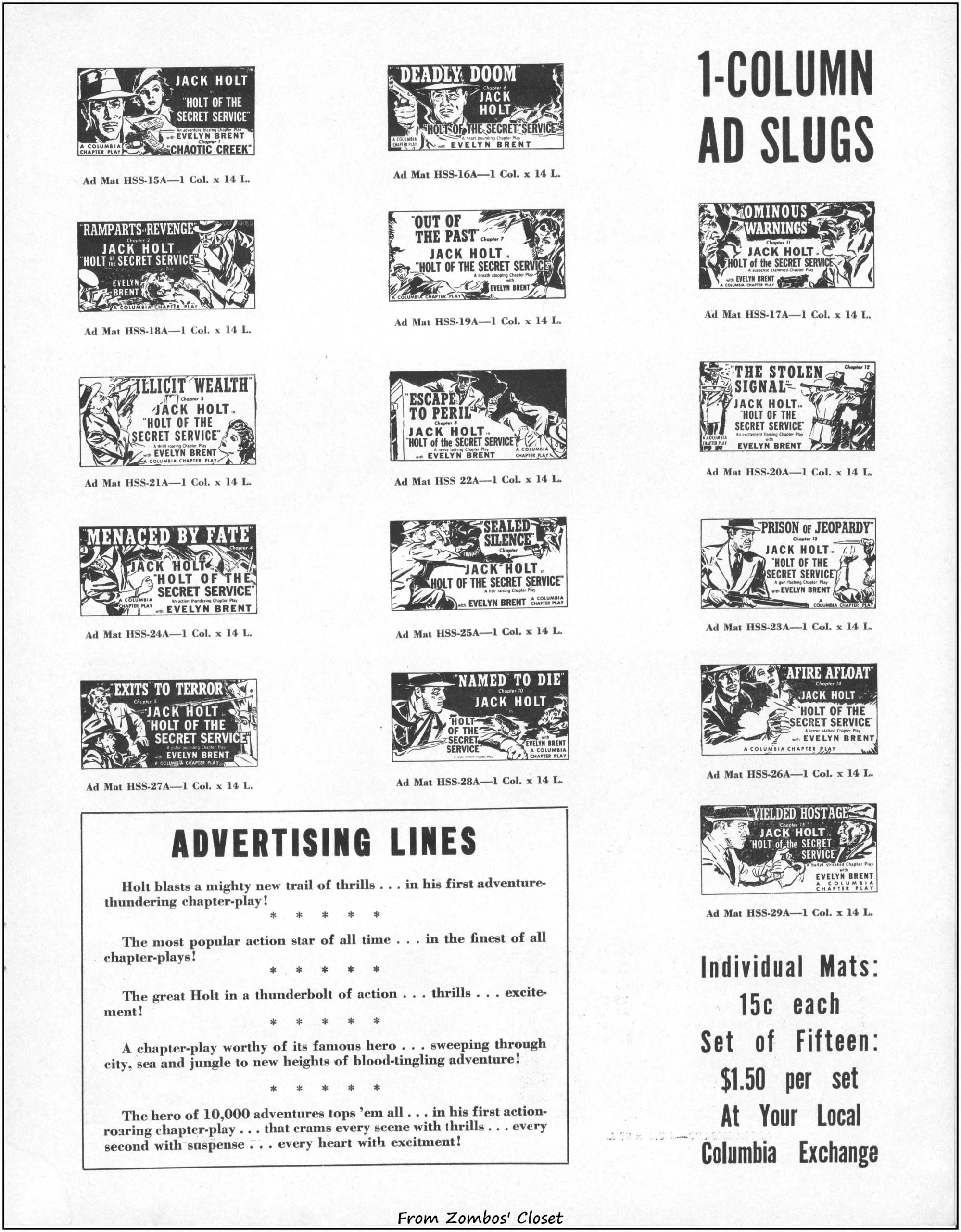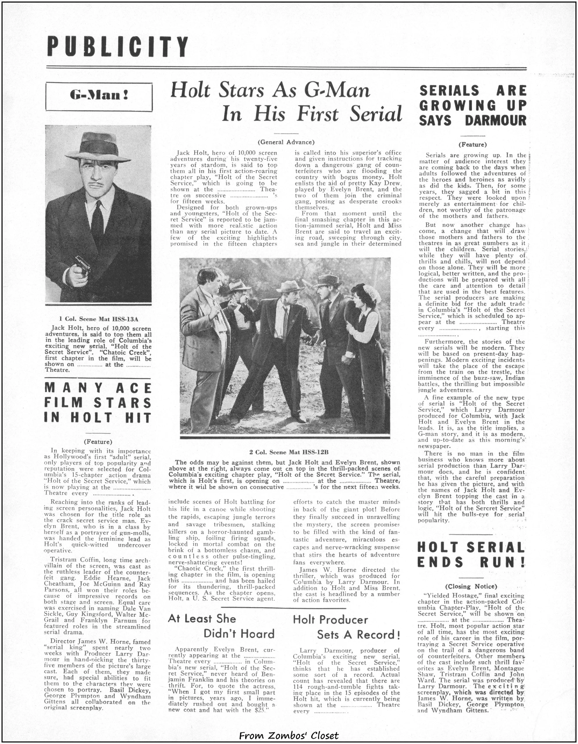 Columbia’s Jack Holt was a popular actor for the studio, who played under his own name. After an argument with Harry Cohn, the studio head, he was relegated to doing a serial: it turned out to be one of Columbia’s top money-makers and with the same film crew, also was a solid actioner that played as well for adults as it did the kids. Columbia had a habit of mistreating their top grossers: The Three Stooges, a case in point. While they were paid peanuts, Columbia went to the bank smiling off of their short comedies. Unfortunately for Cohn, Holt left Columbia with a smile after the serial was completed so there wasn’t a sequel. In Gripping Chapters, The Sound Movie Serial, author Ron Backer gives the record for cliffovers (the end of a serial chapter where our hero takes a sudden precipitous descent) to Holt of the Secret Service. “…who went over a waterfall in an open canoe, rolled off a high cliff in a fight and appeared to go over a cliff in a car, not to mention two falls in a ship and one fall climbing a ladder on a high building.”