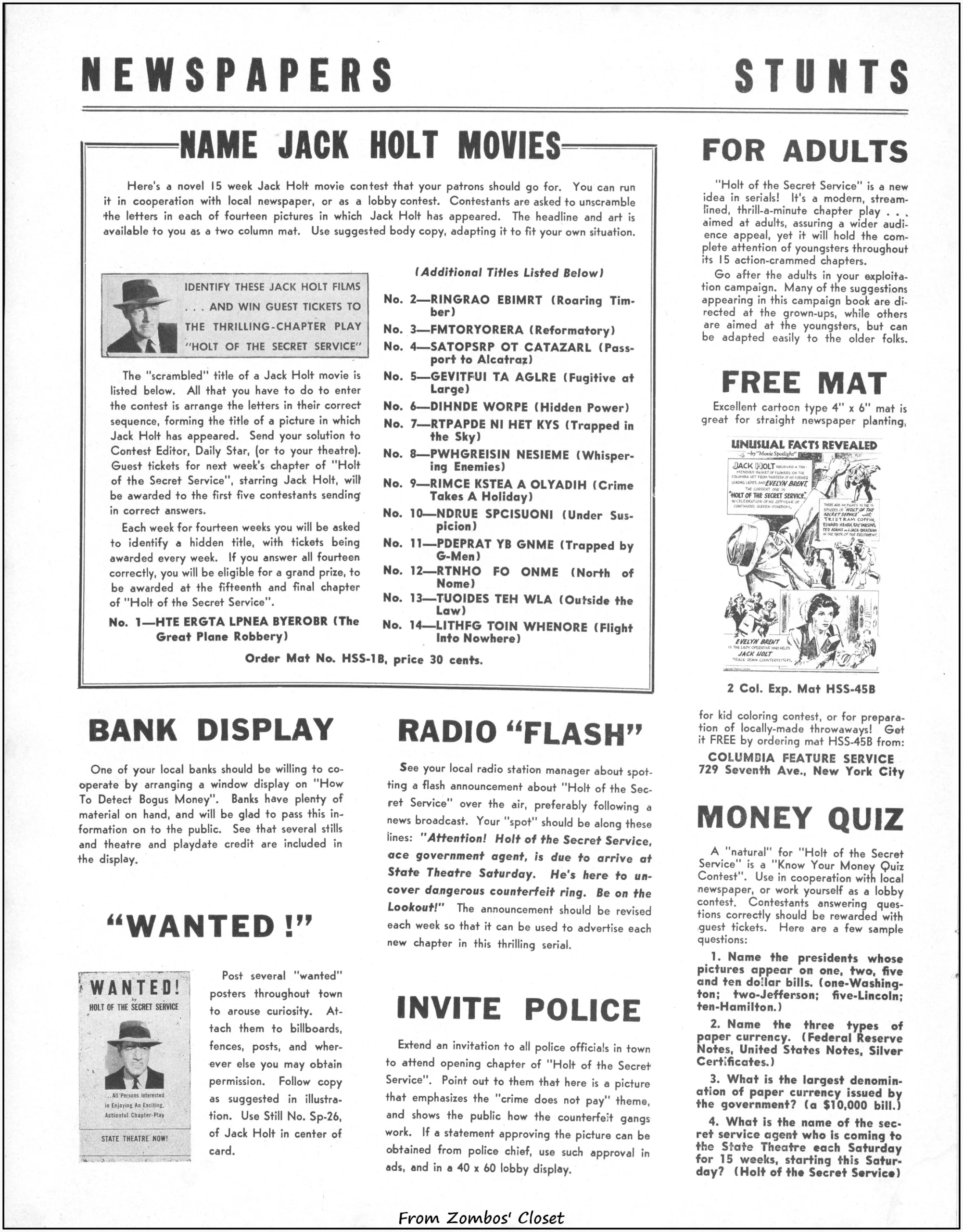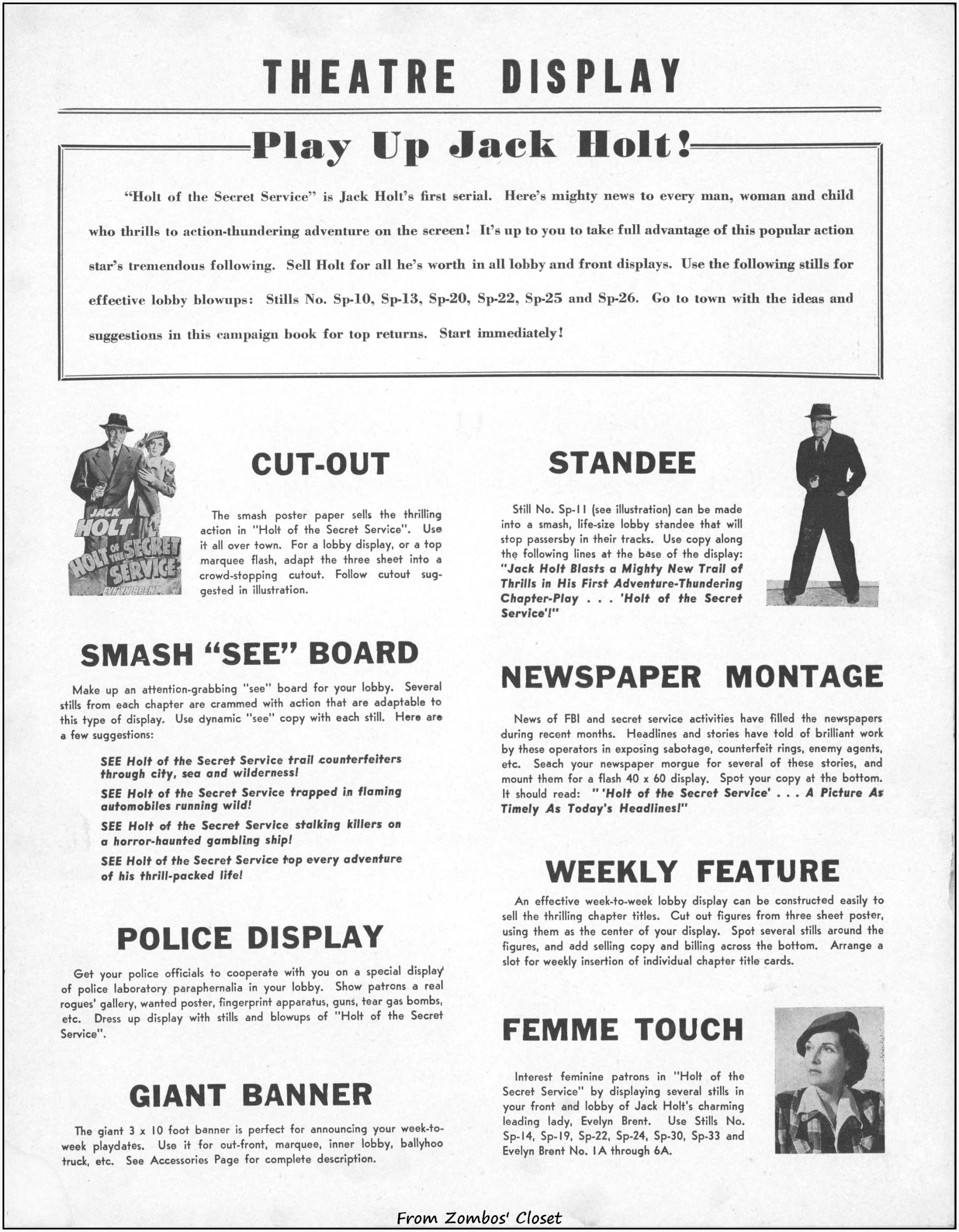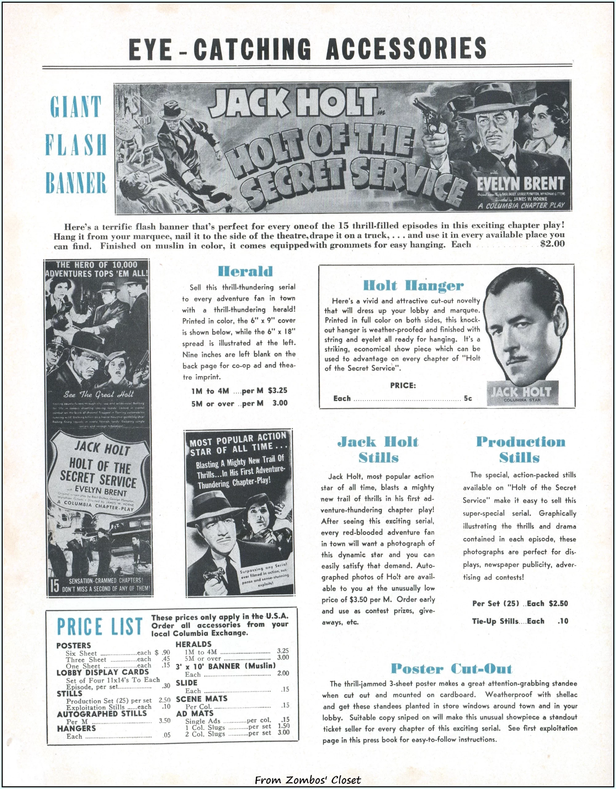 Columbia’s Jack Holt was a popular actor for the studio, who played under his own name. After an argument with Harry Cohn, the studio head, he was relegated to doing a serial: it turned out to be one of Columbia’s top money-makers and with the same film crew, also was a solid actioner that played as well for adults as it did the kids. Columbia had a habit of mistreating their top grossers: The Three Stooges, a case in point. While they were paid peanuts, Columbia went to the bank smiling off of their short comedies. Unfortunately for Cohn, Holt left Columbia with a smile after the serial was completed so there wasn’t a sequel. In Gripping Chapters, The Sound Movie Serial, author Ron Backer gives the record for cliffovers (the end of a serial chapter where our hero takes a sudden precipitous descent) to Holt of the Secret Service. “…who went over a waterfall in an open canoe, rolled off a high cliff in a fight and appeared to go over a cliff in a car, not to mention two falls in a ship and one fall climbing a ladder on a high building.”