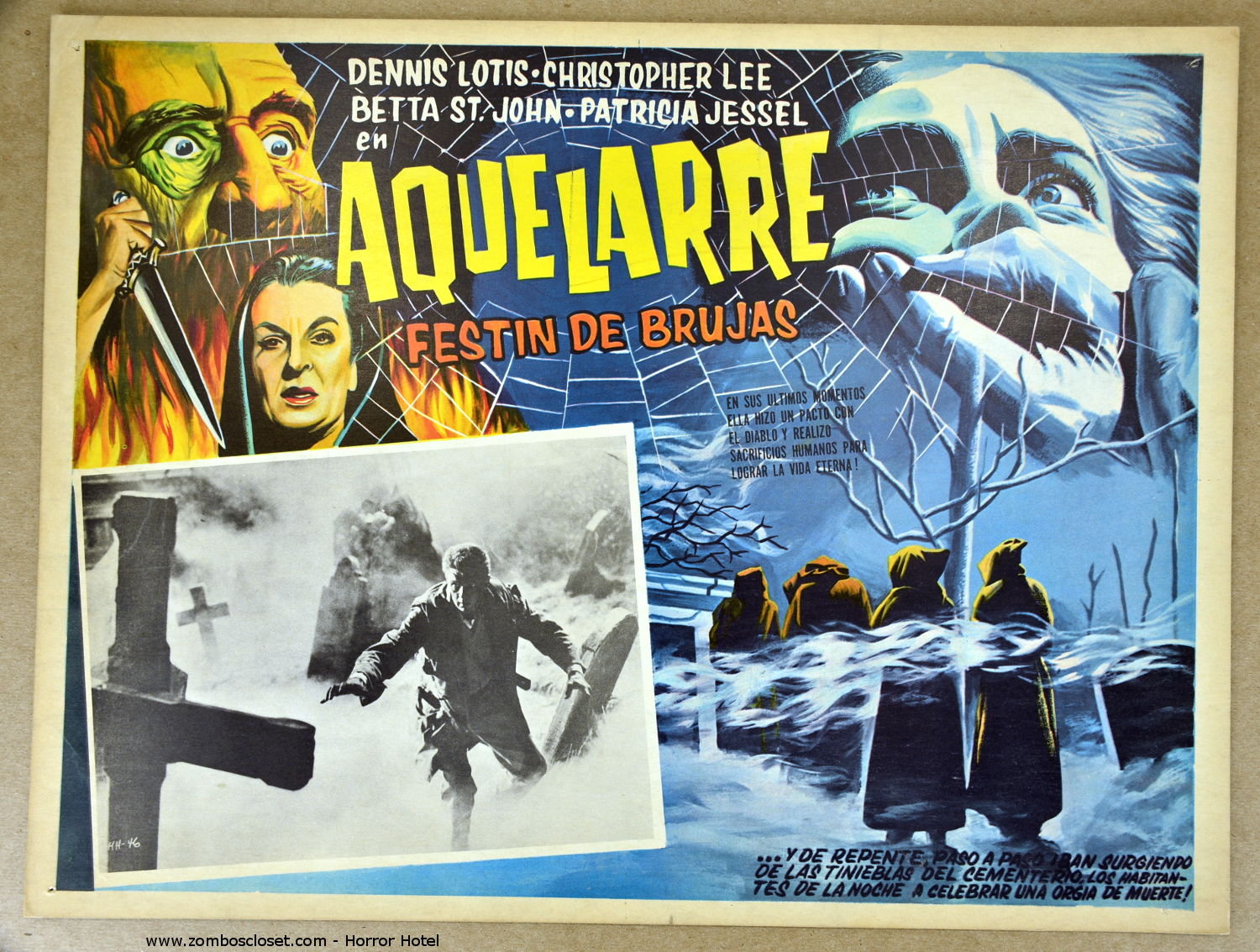 Here's a fantastic Mexican lobby card for Horror Hotel (aka The City of the Dead), a little gem of a movie. They used a lot of fog to cover up the budget sets. Works like a charm. Creepy and spooky. And with Christopher Lee perfectly placed in his element.