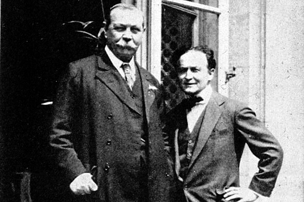 The year is 1901. Doyle had killed off Holmes eight years earlier (in The Final Problem) but clamoring fans force him to publish The Hound of the Baskervilles in 1901, a story set before Holmes’s death. Doyle rather focus on writing about things he deems more important than Holmes. No mention is made of Hound, though, as he reluctantly attends a book signing. An ardent fan dressed as Holmes tells Doyle the game is afoot. Doyle isn’t amused. He wishes his The Great Boer War, published in 1900, was in demand instead of Holmes’s stories. Doyle would become a true believer in spiritualism, and faeries, after the deaths of his son, wife, brother, and brothers-in-law, but this would not happen until later. It also won’t be until the 1920s that Houdini energetically challenges, debunks, and exposes spiritualists; and his signature escape, the Chinese Water Torture Cell, well dramatized in this episode, will not make its debut until 1913.