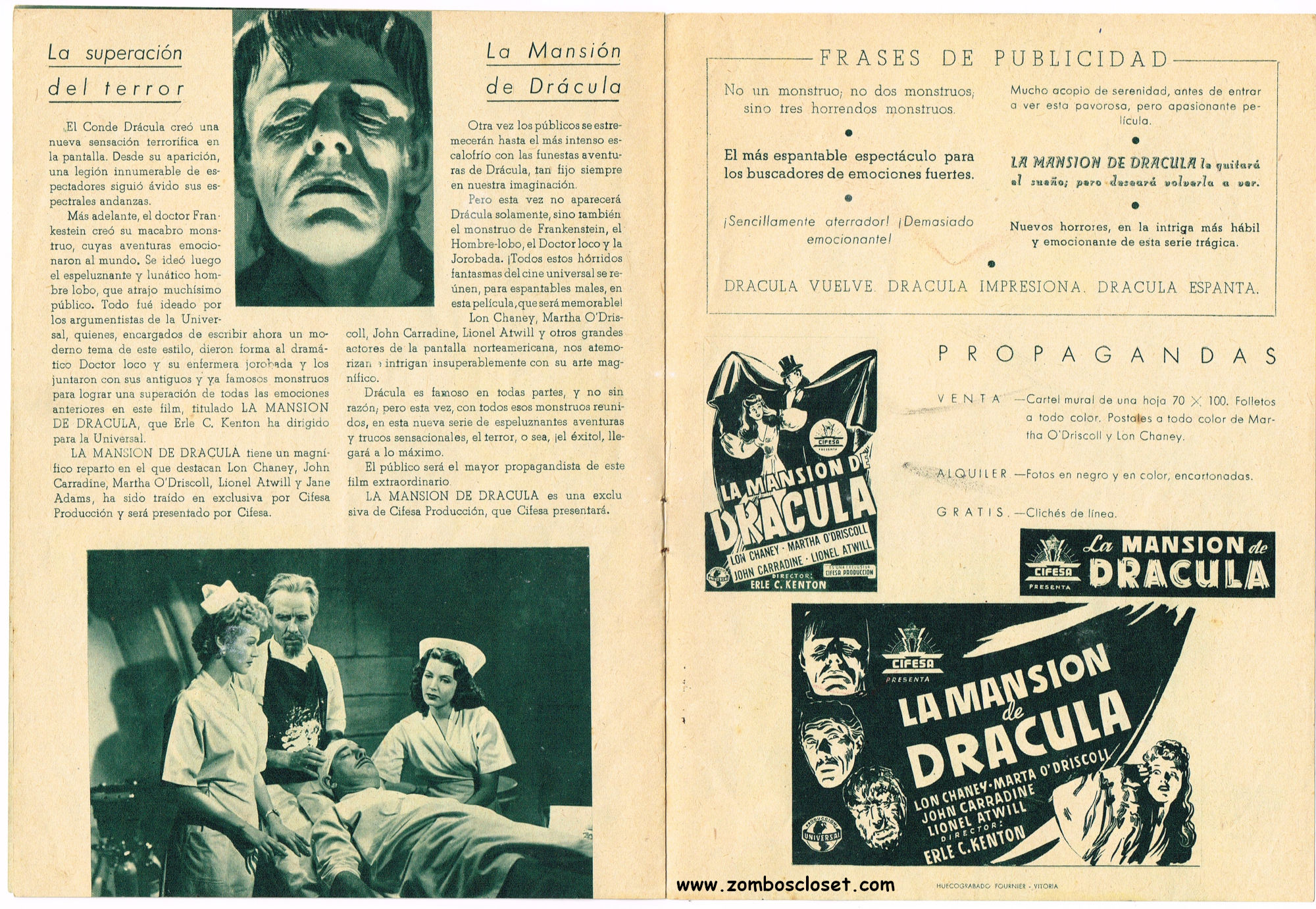 My guess is this is somewhat rare. While the Spanish pressbooks for notable old movies are usually small (this one is 8.5 x 6.5 inches), they are neatly laid out and use imagery well. Of course, being House of Dracula, I couldn’t pass it up. Read my review of HOD. (13 Ghosts and Frankenstein Must Be Destroyed German pressbooks)