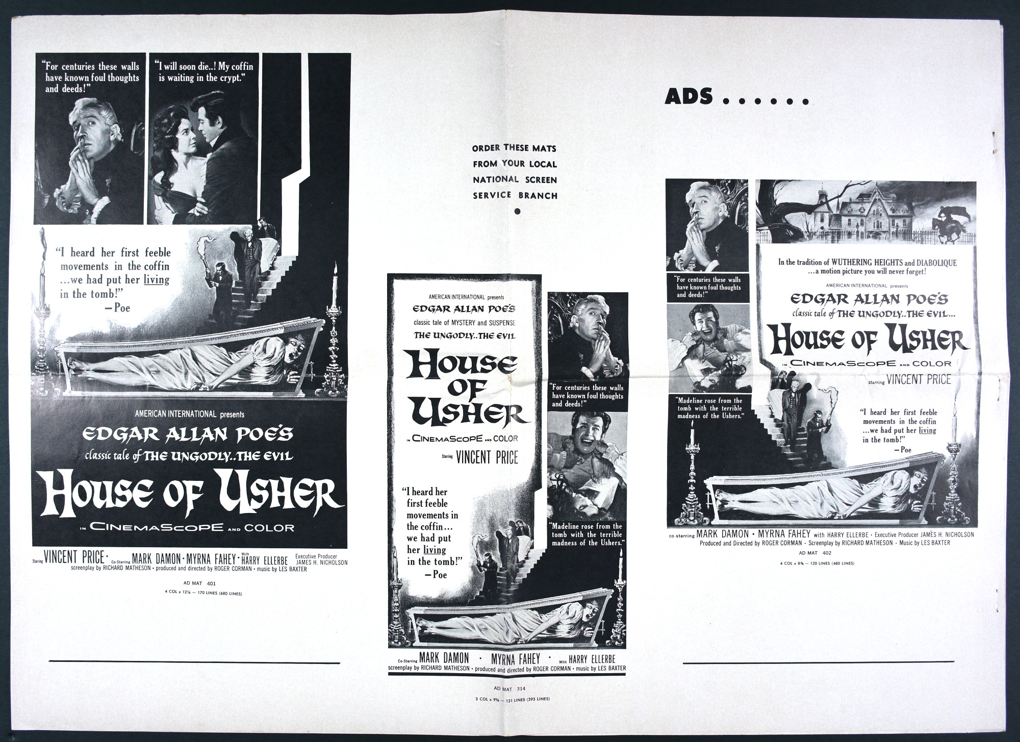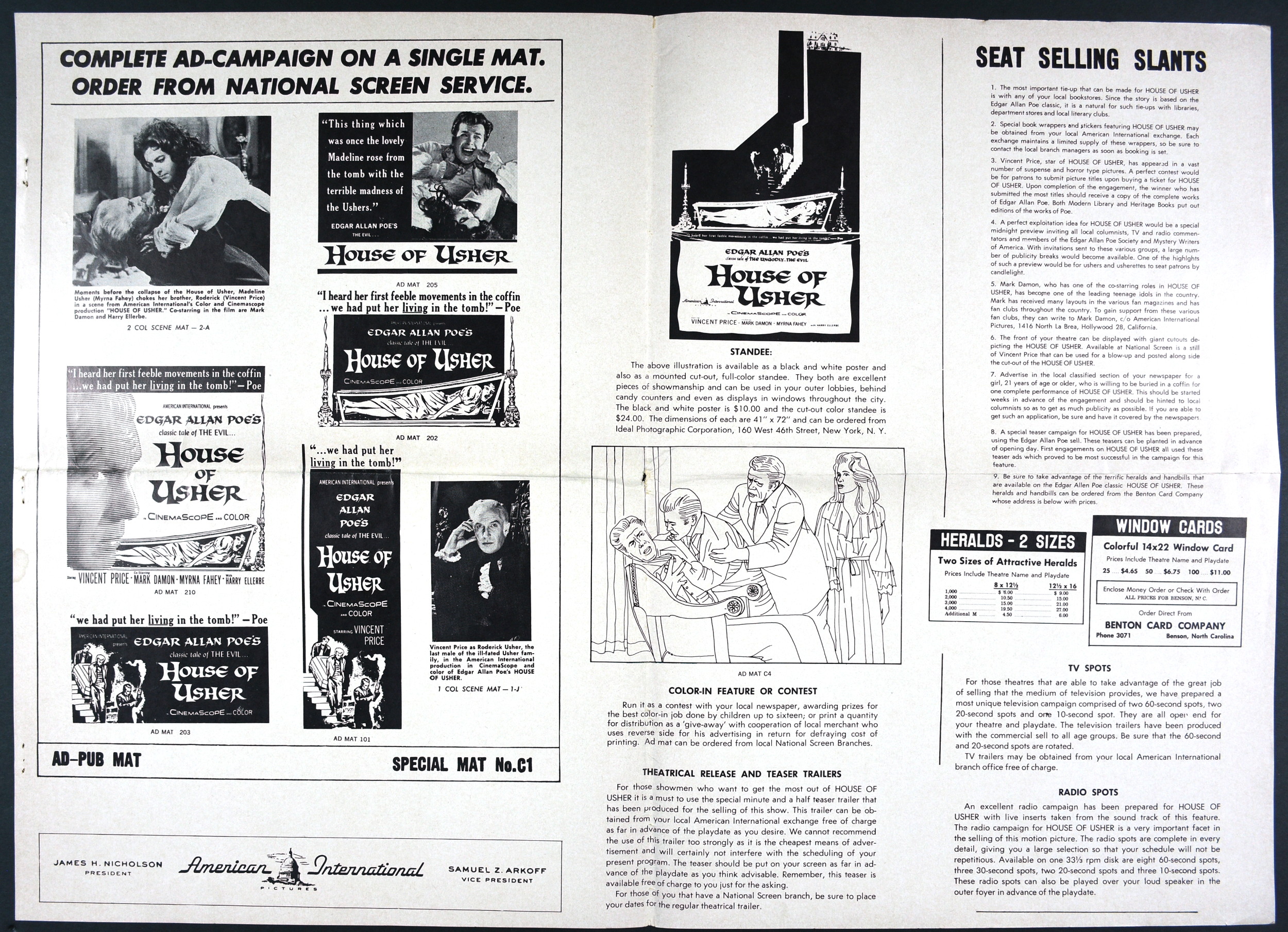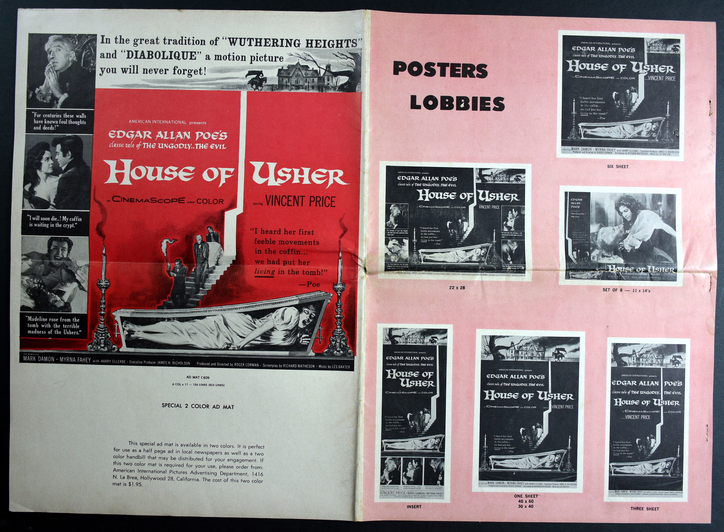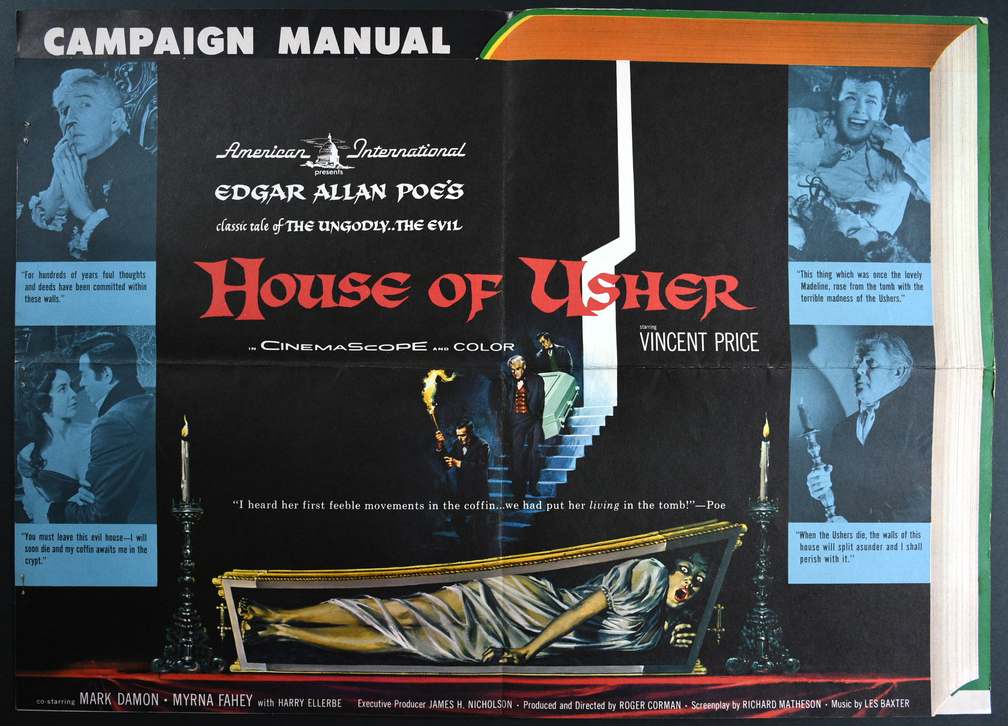 American International's over-sized pressbook for House of Usher sells the Price, Poe, and terror quite well. And! There's a coloring page! What better way to promote horror than with a coloring page and crayons! Sadly, they didn't make the poster art the coloring page. Pity. Try getting those flesh tones right on the screaming woman in the coffin. Here's the comic book reader version: Download House of Usher Pressbook. Tattered gown white and morbid crimson would be hard to find in the crayon box, too.
