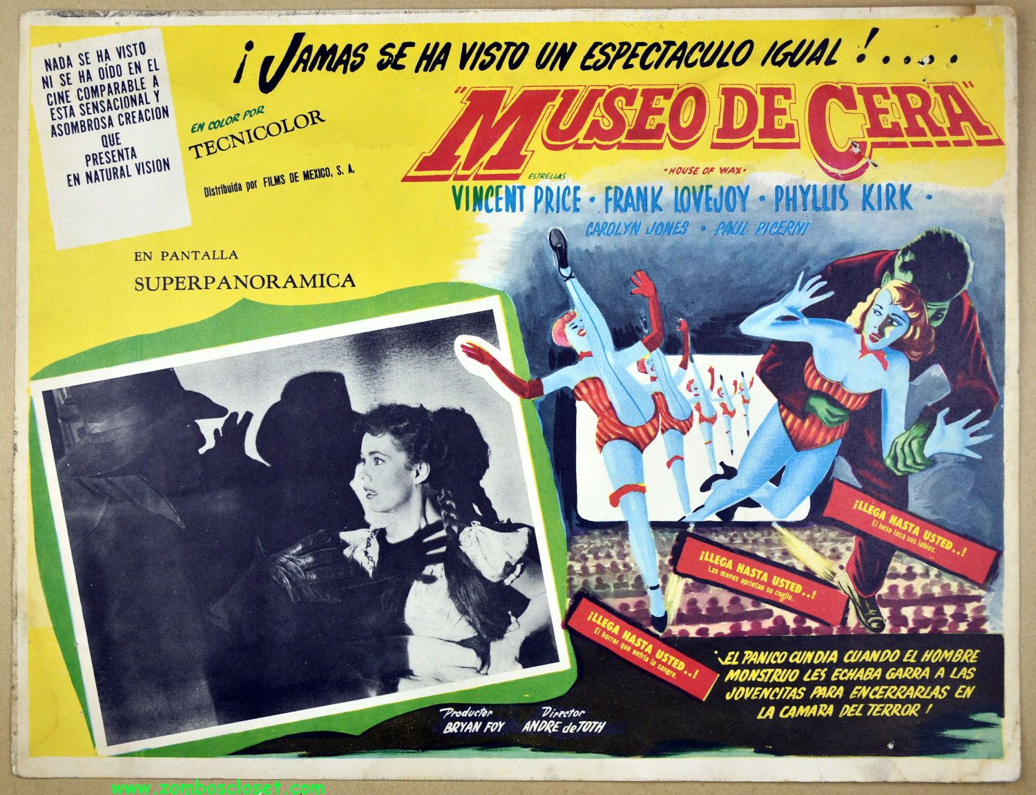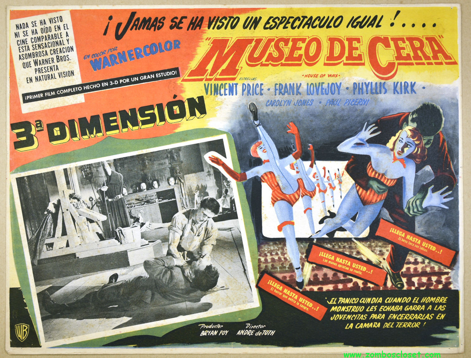 Here are the 3D and 2D Mexican lobby cards for House of Wax. I saw it on the big screen when it was re-released in 1971. The moment when Charles Bronson appears to jump from a theater seat and onto the screen is one I'll always remember.