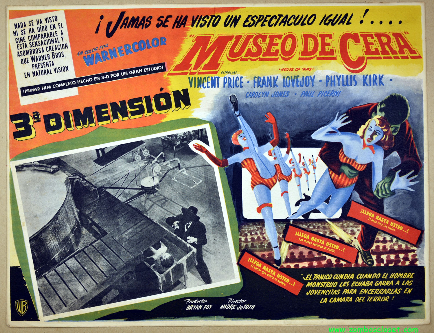 Here are the 3D and 2D Mexican lobby cards for House of Wax. I saw it on the big screen when it was re-released in 1971. The moment when Charles Bronson appears to jump from a theater seat and onto the screen is one I'll always remember.