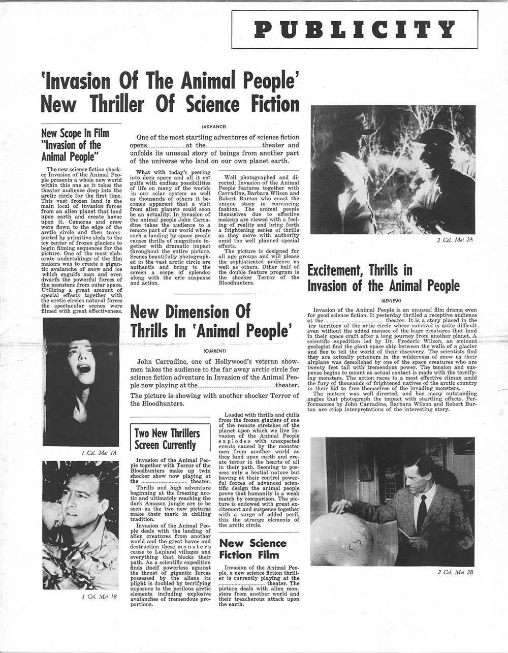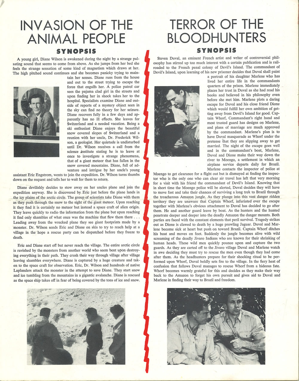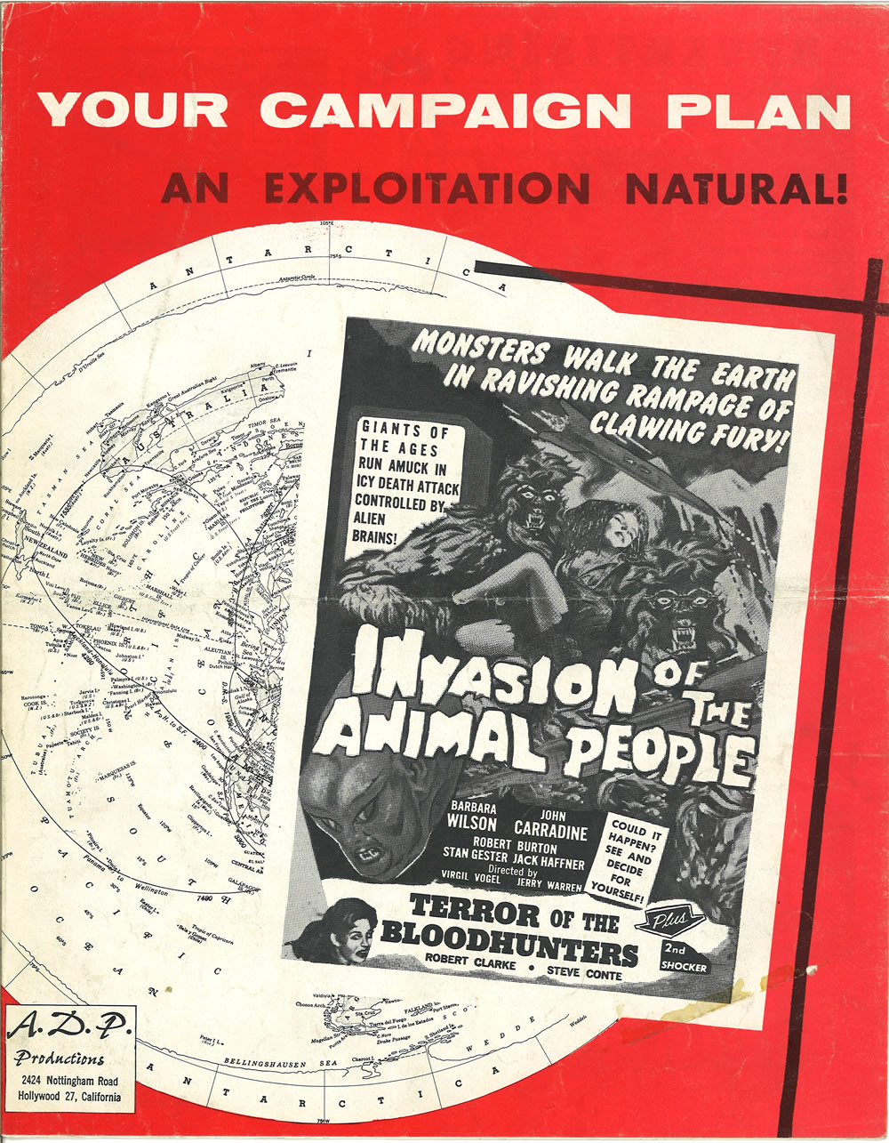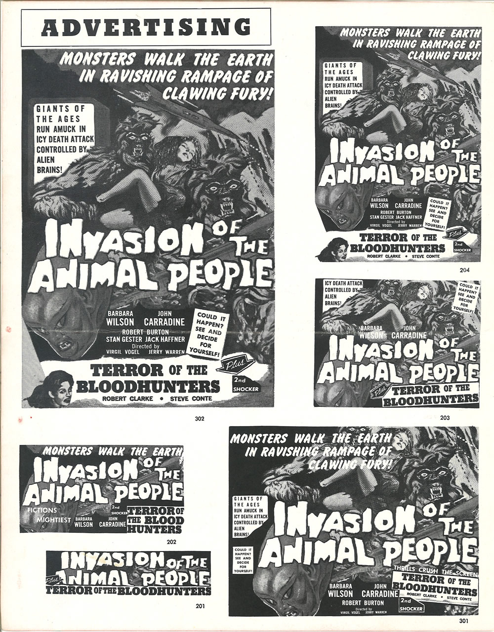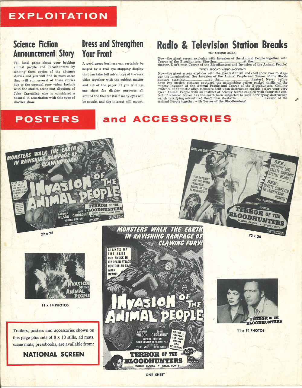 The poster art for Invasion of the Animal People is scrumptiously insane. "Giants of the ages run amuck in icy death attack controlled by alien brains!" Say what? And since I've a penchant for using redundant leading letters on words myself, this tagline is awesome (in my humble opinion): "Monsters walk the earth in ravishing rampage of clawing fury!" Terror of the Bloodhunters has the better title, but note how it's ignored in the advertising campaign for this "exploitation natural" double bill.