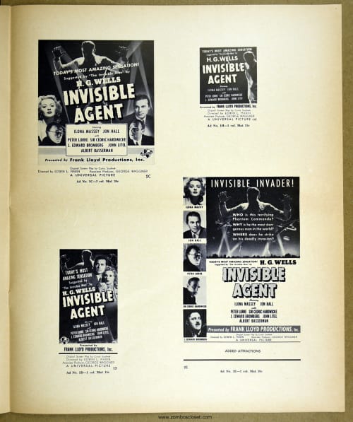 Here's the ad mat insert to the Invisible Agent pressbook. These are the newspaper ads that would be used by the movie theater for promotion. The ads shown here would simply be cut out and sent to the newspaper, along with the theater's location and show times. Now, of course, you just open Fandango or another app on your phone. But seeing these ads in the newspaper was a lot more visually exciting, if not as convenient.