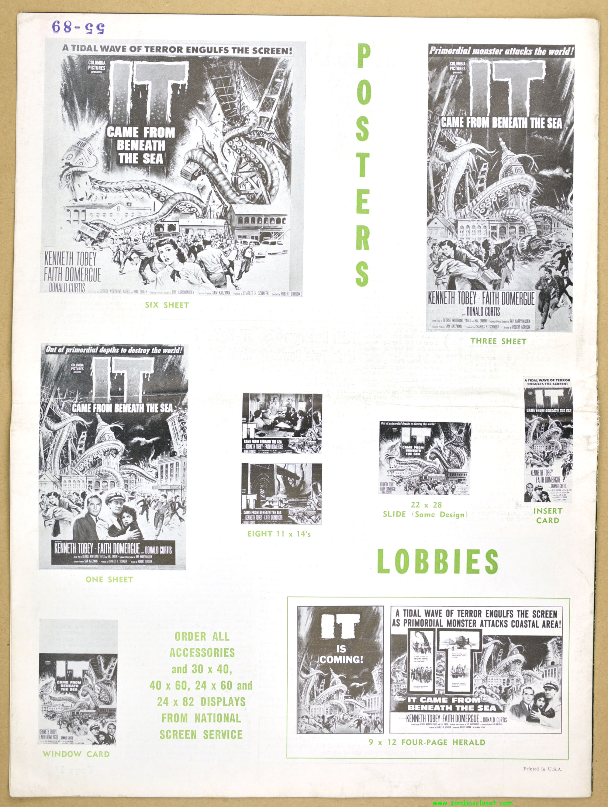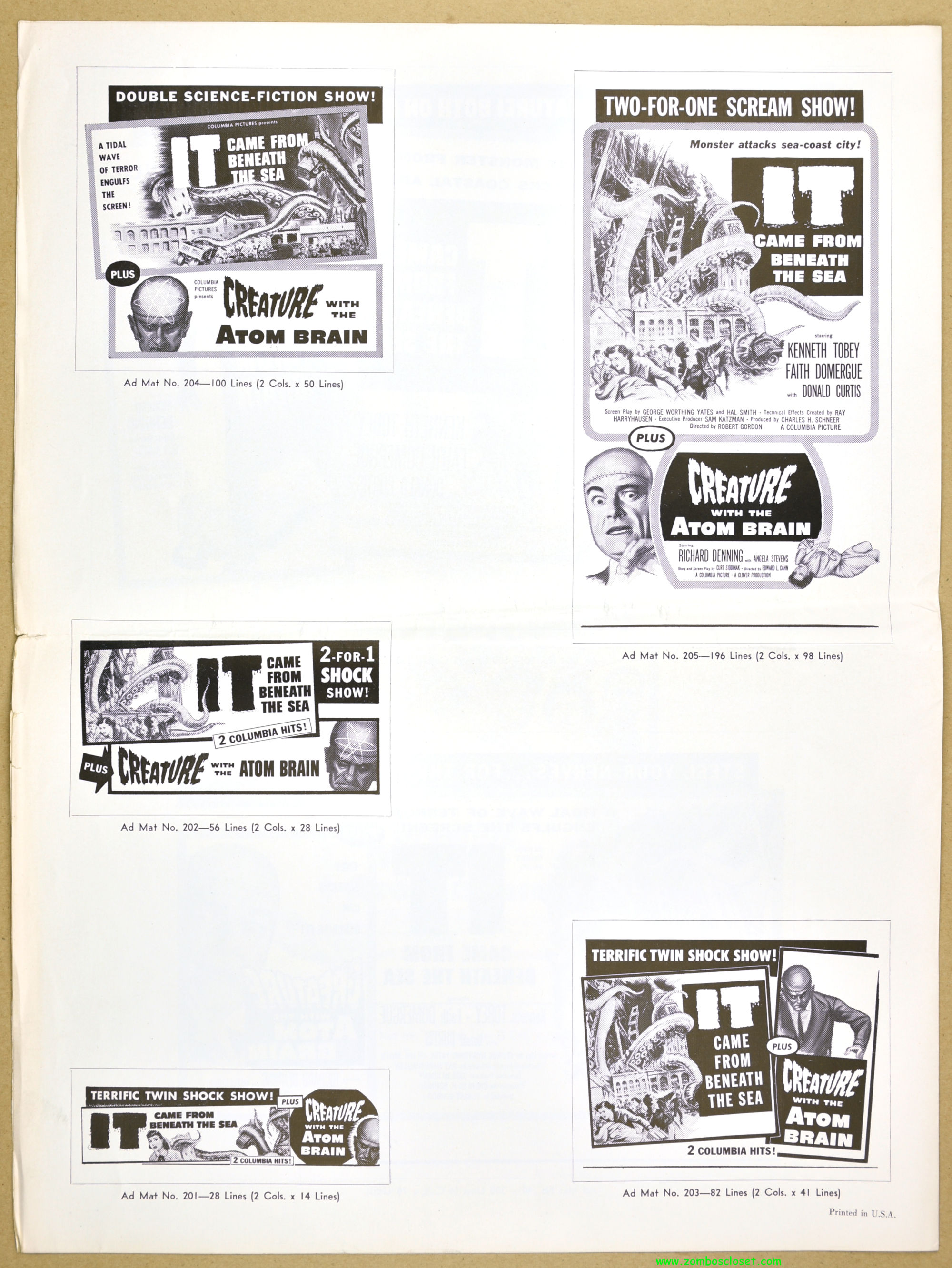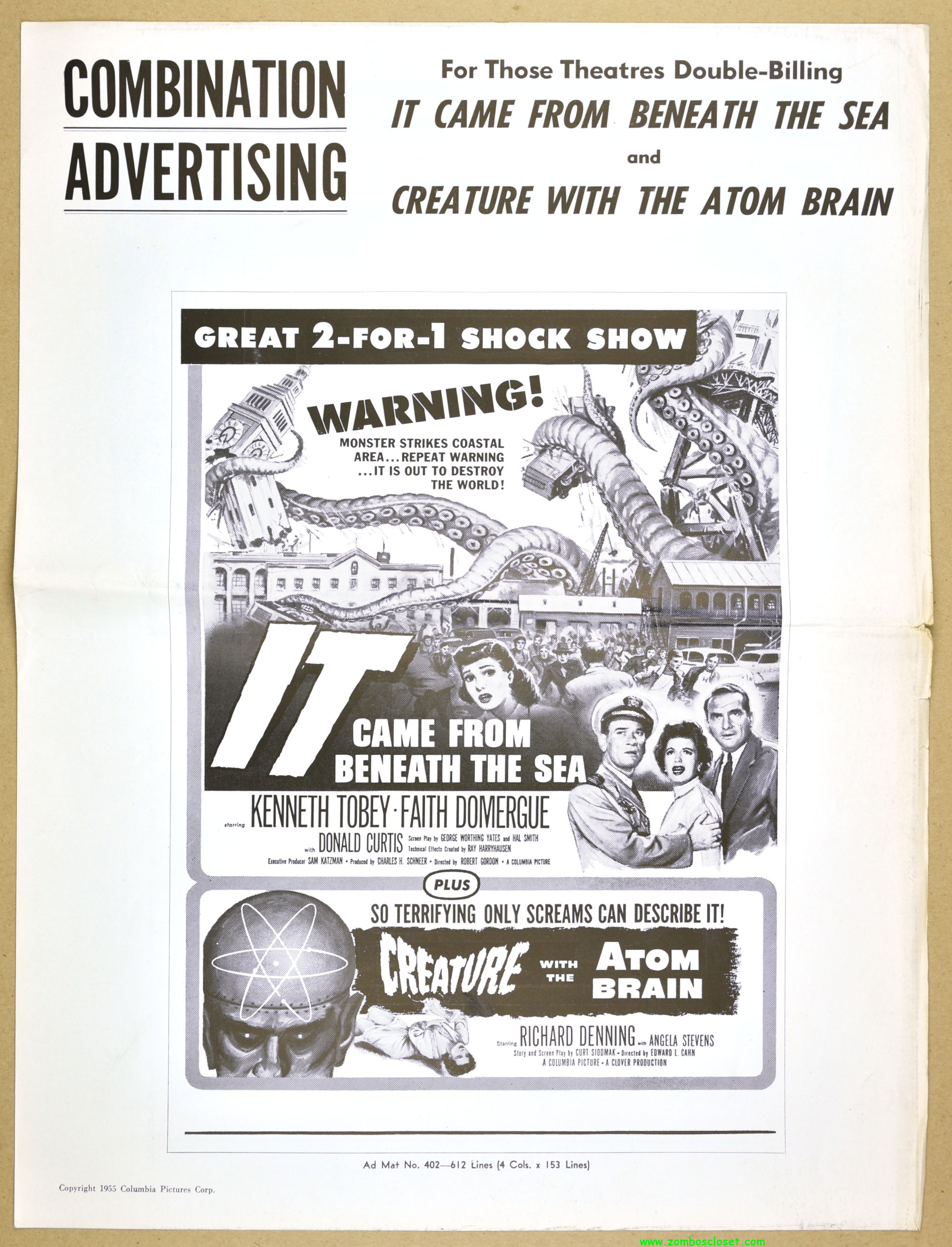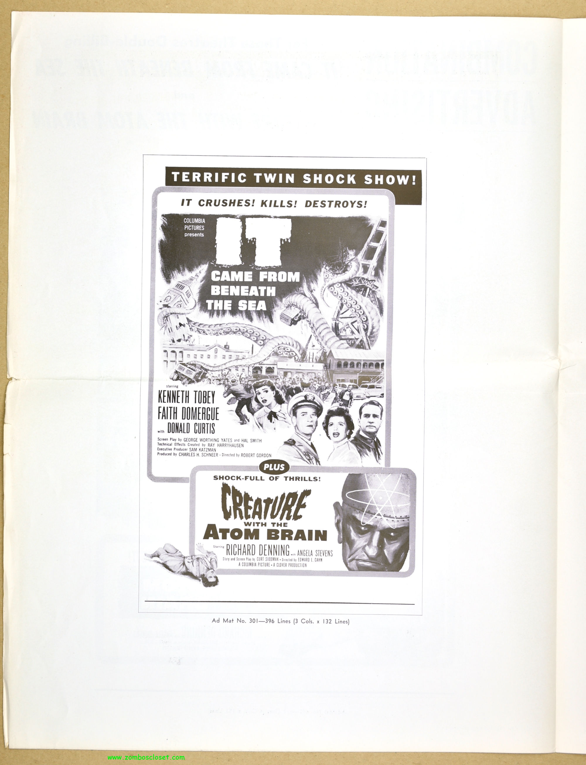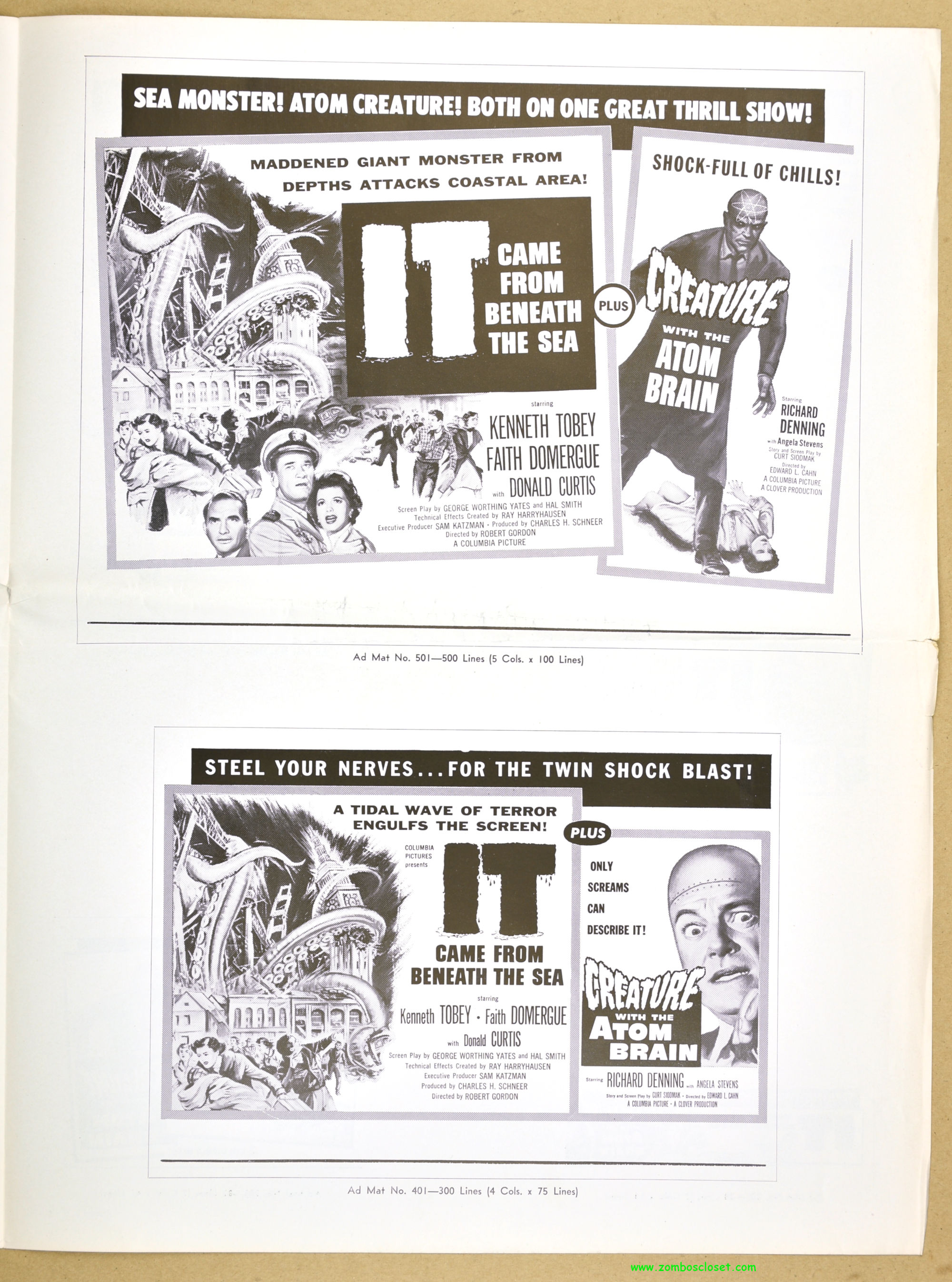 Ray Harryhausen strikes again in It Came From Beneath the Sea. The 1950s nuclear bomb paranoia brings another irritated giant monster to attack mankind. The Wikipedia entry notes a humorous problem for Kenneth Tobey as he kept sinking in the sand next to Faith Domergue, and Harryhausen’s budget only allowed for six of the octopus’s eight tentacles to be animated. Thanks to ZC lurker Terry Michitsch for requesting this pressbook (and the one for First Men in the Moon, which I’ll post as soon as I can find it. It’s buried in the closet Terry, somewhere, I swear). This movie was double-billed with Creature with the Atom Brain. (ZC Note: I pulled this one from the 2018 archives to go along with Granny’s radio spots for It Came From Beneath the Sea. If you have any issues with that, you can speak to my lawyer, Tryan Sumi.)