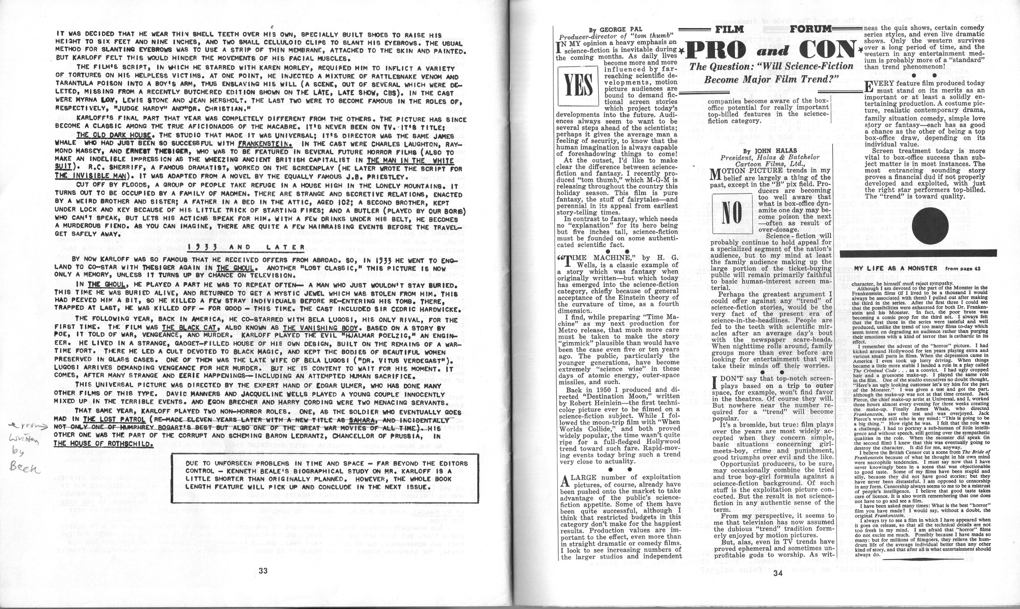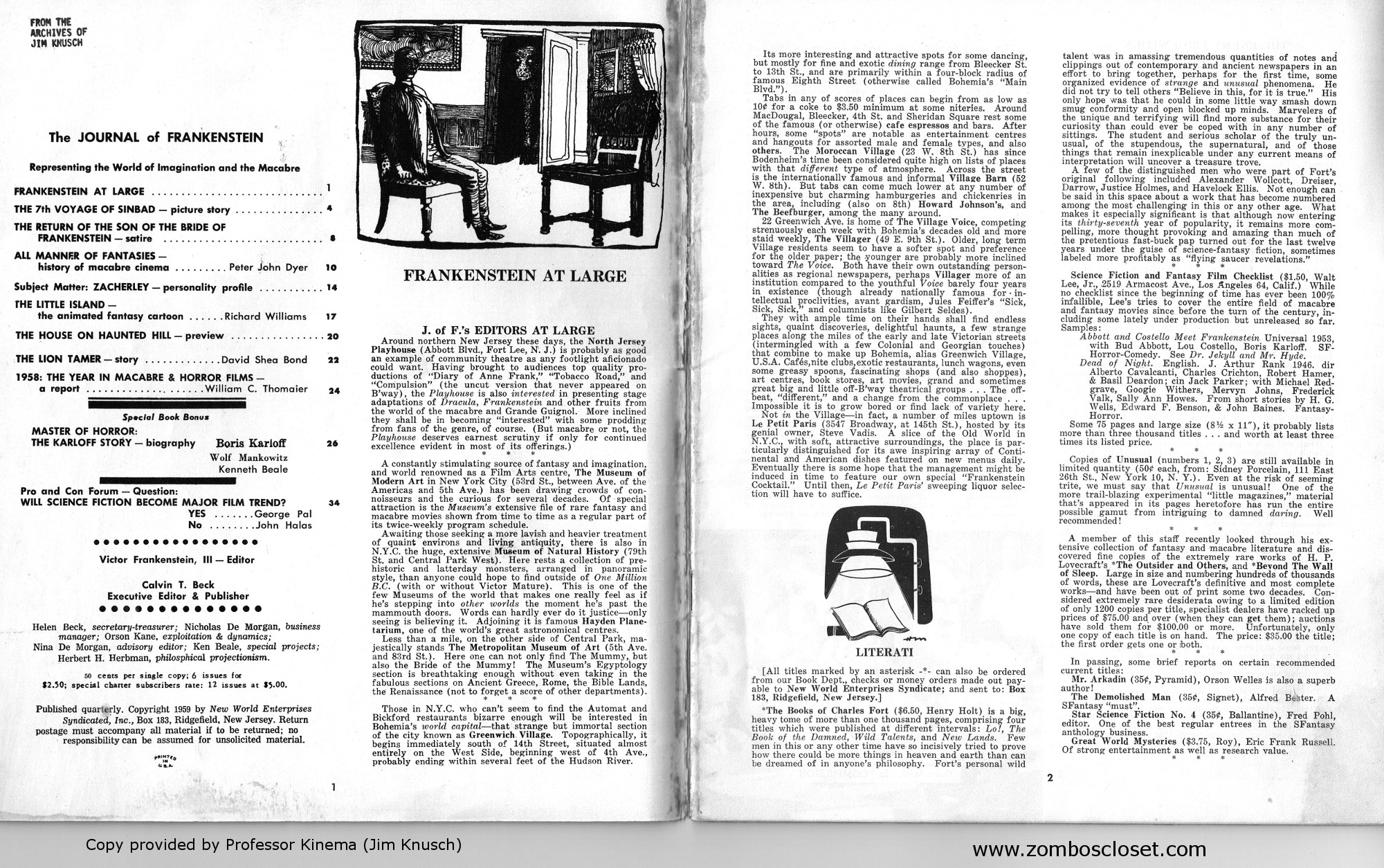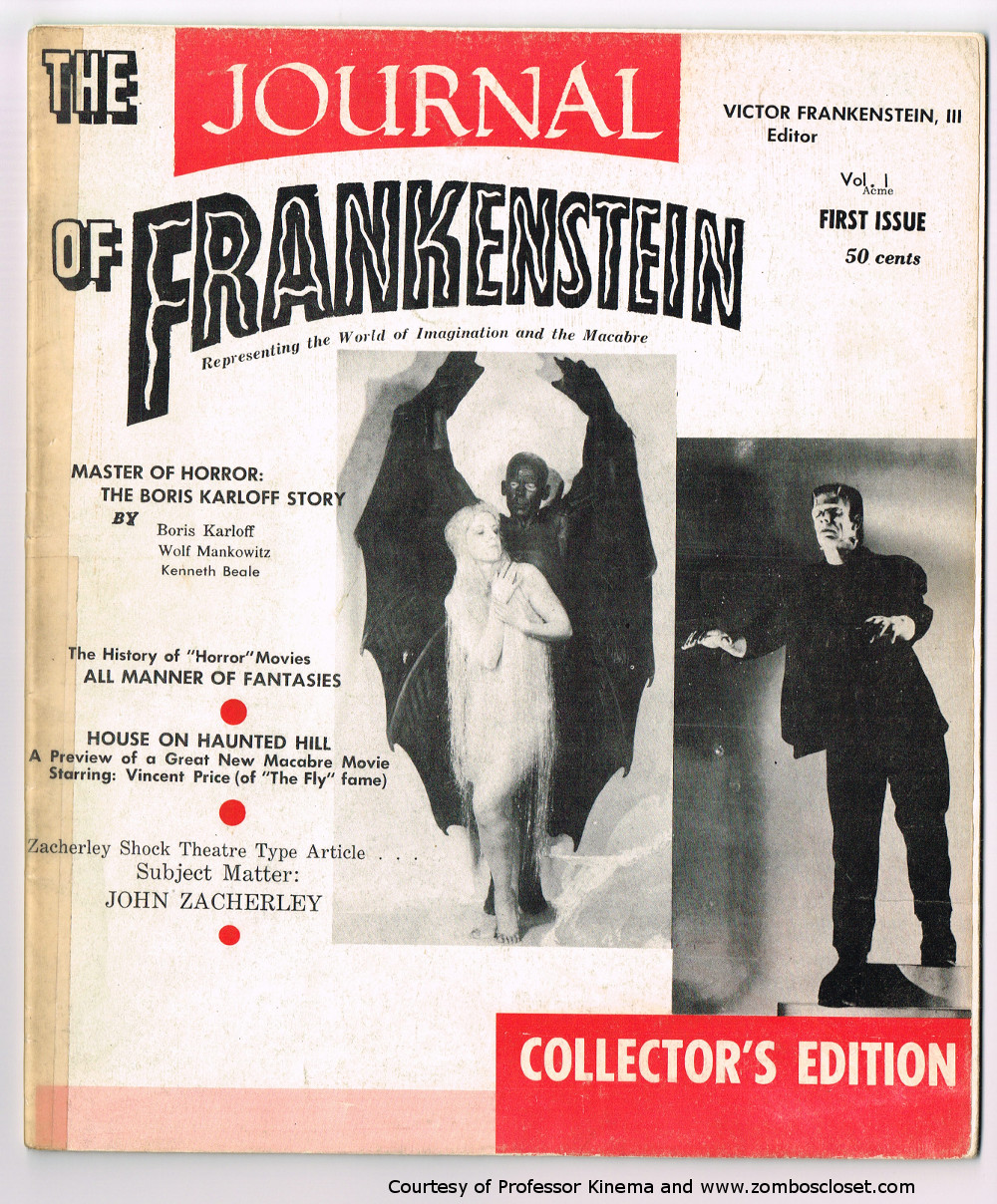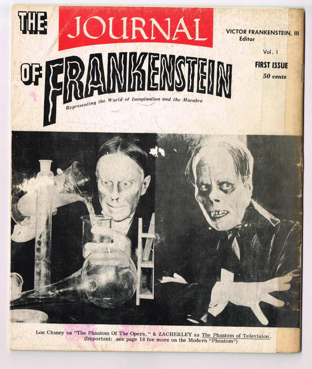 Rough layout start to a wonderful pro-zine would turn into a key monsterkid magazine for its time. In this issue, Boris Karloff and Zacherley get the love, and good articles discuss the horror and fantasy scene. I always confused the back cover for the front cover, but I keep wondering why go with the front cover when Zacherley was more of a draw. Perhaps to allow room for the titles? Still, seeing Zacherley on the cover would have made me buy this puppy back then. Just sayin'. Here's the comic book reader version:  Download Journal of Frankenstein Issue 1. (This copy of the magazine courtesy of Professor Kinema, long time contributor to FZC).
